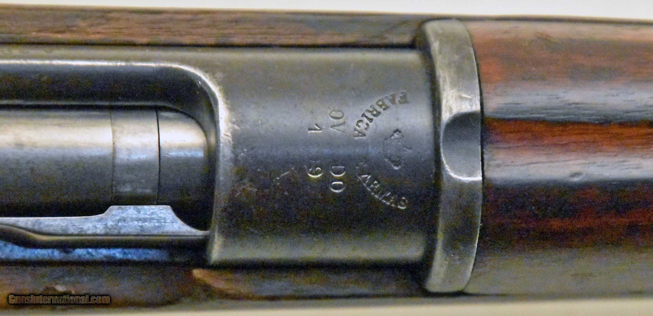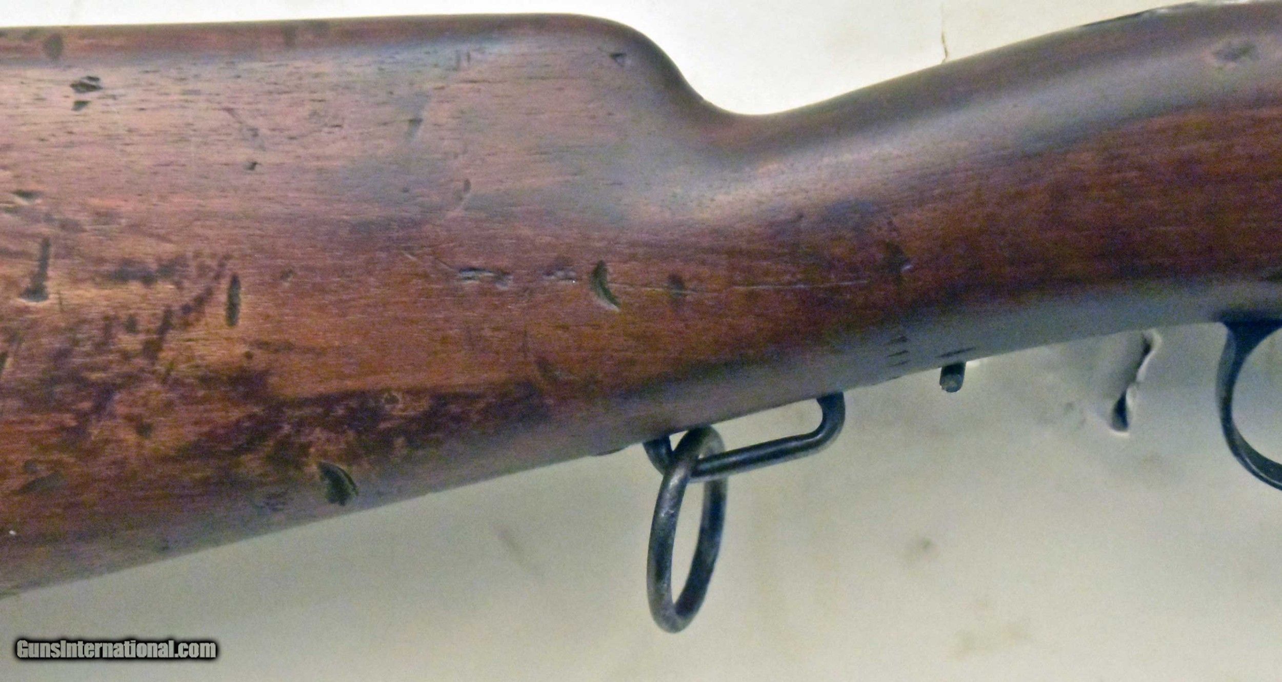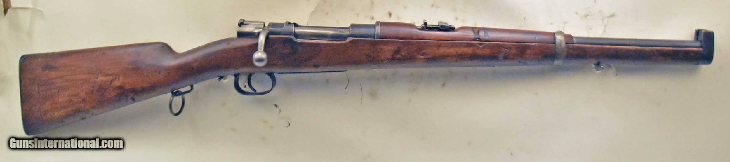 Description: Spanish Saddle Ring Mauser Carbine. {7x57mm}. Serial # A3853. Made by Ovido, 1899. Wood is in G to G+ condition, downgraded due to some gouges. Metal finish 50%. Stamped matching numbers on the receiver, bolt,, trigger guard, and floorplate. Bore has G+ lands, debris/some brightness in grooves. SOLD Curio/Relic: Yes |