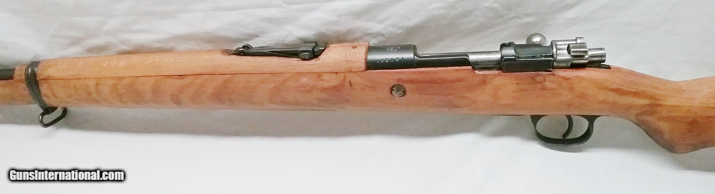 Description: This 1946 dated 8mm Turkish Mauser Model 1938 has a 29-1/4” blued tapered round barrel mounted with an adjustable rear sight and a drift-adjustable front sight. The top of the receiver is stamped with arsenal markings and the date of manufacture. The bore is very good. The Select Hardwood stock with metal buttplate and handguard are in good condition with the exception a small chip on the toe of the buttstock where a splice has been placed. Please Note: This firearm still has its original cosmoline packed throughout in order to preserve it. The gun features a bayonet lug, a bolt disassembly tool on the buttstock and a cleaning rod. The numbers on this gun are non-matching. Length of pull is 13”, overall length is 49”, weight is 9.5 lbs. Our stock number is #C189. Will ship to any FFL, anywhere in the United States. Buyer pays freight and insurance. SOLD Rifle Caliber: 8x57mm JS Manufacturer: Turkish Mauser Model: 1938 Bore: Rifled Condition: Good Metal Condition: Good Wood Condition: Good Bore Condition: Very Good Barrels: One Barrel Type: Tapered Round Action: Bolt Action Triggers: One Stock: Select Hardwood Fore End: Select Hardwood Butt Pad: Metal LOP: 13 in Finish: Blued Weight: 9.5 lbs. Sights: Adjustable Item Location: OR |