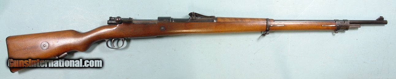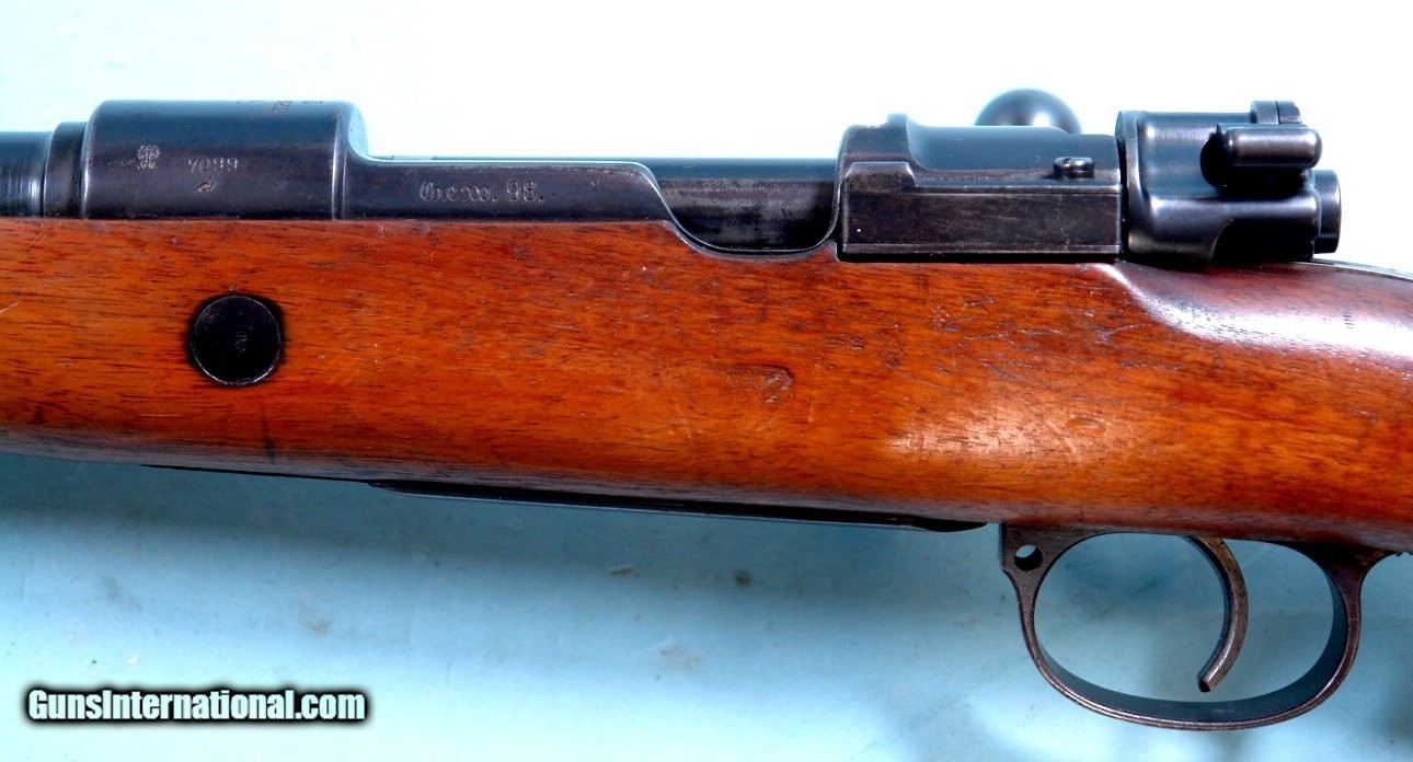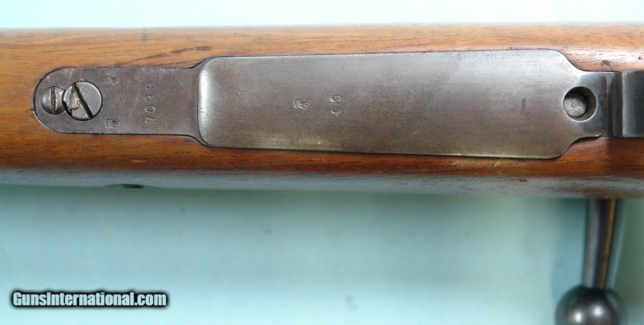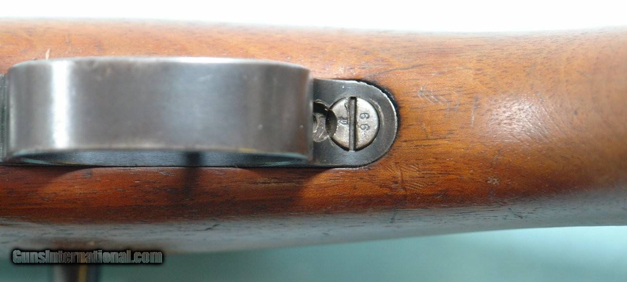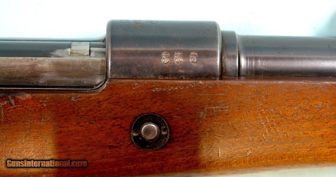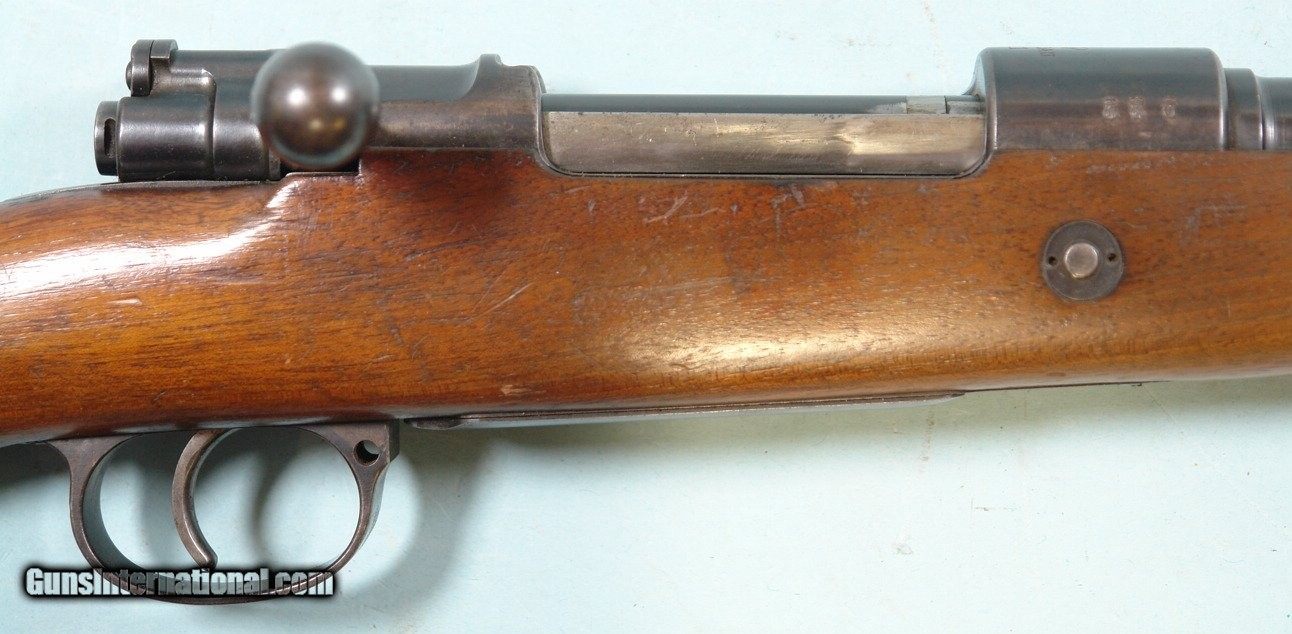 Description: 32420- WW1 WWI IMPERIAL GERMAN SPANDAU MAUSER GEW 98 8MM INFANTRY RIFLE DATED 1911. 30” barrel with original front and rear sights. All matching except bolt. Original sling swivels. Receiver stamped “CROWN/SPANDAU/1911” and barrel stamped with Ordnance proofs at left breech. Has most of the blue and wood finish with light to moderate wear. Perfect working order and brilliant bore with near mint rifling. $2200. Curio/Relic: Yes Rifle Caliber: 7.92x57mm Mauser Price: $2,200.00 Contact Seller |