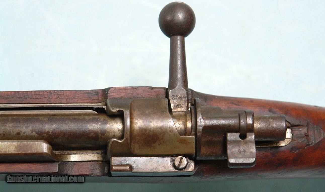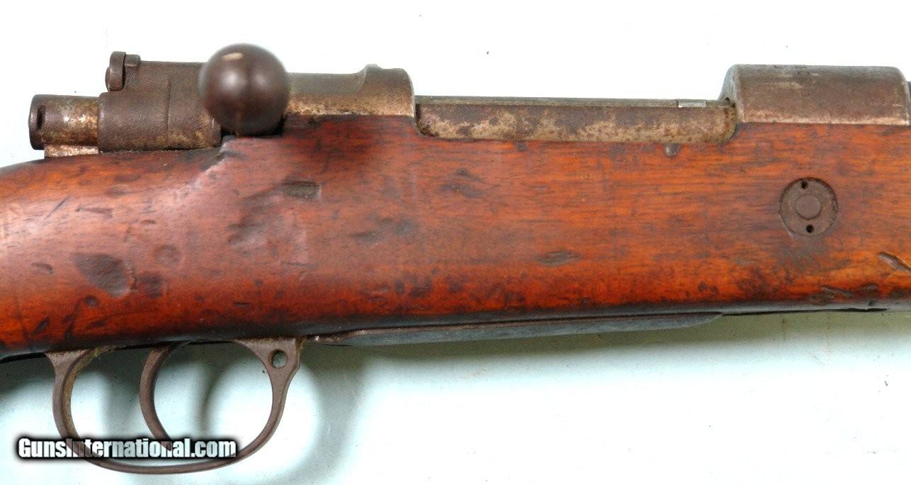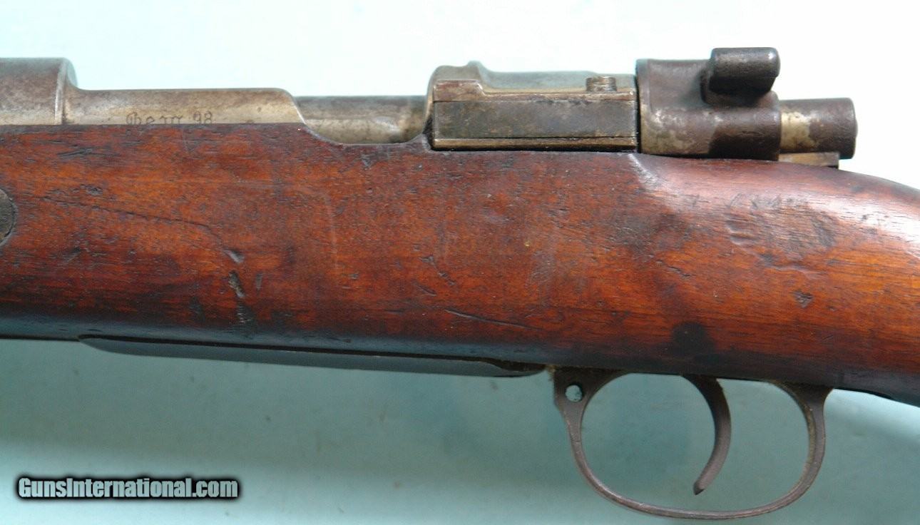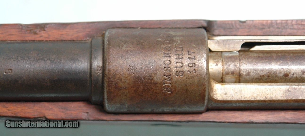 Description: 32593- WW1 WWII SIMSON & CO./SUHL GEW 98 GEWEHR BOLT ACTION 8MM MAUSER INFANTRY RIFLE DATED 1917. All original and matching except bolt and floor plate which are wartime replacements with matching patina. Complete in long storage uncleaned condition. Will clean to fine overall. Matching stock and handguard. Working order and good borel Receiver stamped “ SIMPSON & CO/SUHL/1917”. Hard to find maker. $950. SOLD Curio/Relic: Yes Rifle Caliber: 7.92x57mm Mauser |
