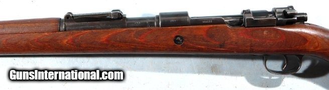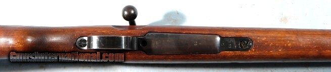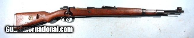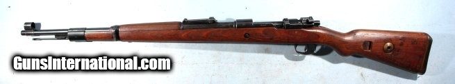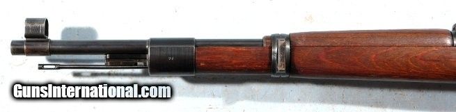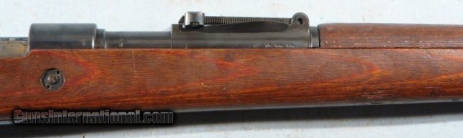 Description: WW2 1944 MAUSER K98K FACTORY COMMERCIAL SAUER 8MM RIFLE. Serial number "27X" and all matching except bolt numbered within 100 digits of gun. Receiver with no markings on top ring but "Mod. 98" on left wall and Eagle/N and Eagle over 359 (Sauer code) on right. Barrel with "cxm36/41 bys" and dbl "eagle over 28". On right side of barrel under sight "42" next to Eagle/WaA63 and TWO "eagle over WaA655". Blue on barrel and receiver original factory finish at 90%. Sight hood. Cupped buttplate. Factory laminate stock with only marking being matching serial number on underside forward of buttplate. Pretty well unused with same mirror bright bore with crisp rifling. NO import marks. Prime example of commercial wartime production rifle in pristine condition as far as these go. SOLD Curio/Relic: Yes |