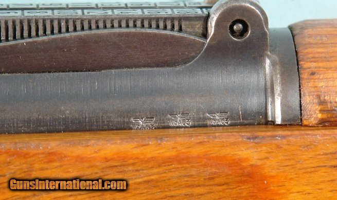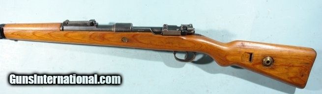 Description: WW2 GERMAN MAUSER K98K CODE 42 "1939" 8MM INFANTRY CARBINE. Serial number "94XX-a". All original. Matching serial numbers on barrel, receiver and bolt and rear sight. Non matching period laminated stock and waffenamt period buttplate as well as barrel bands(that match each other). Three Nazi Ordnance Waffenampts (EAGLE/63) on receiver and one on barrel. Excellent plus overall with most of the original blue and stock finish. Excellent working order and tight lock-up. Bore with frosty grooves in between lands. Nice looking original early date bring back with no import marks. SOLD Curio/Relic: Yes Rifle Caliber: 7.92x57mm Mauser |