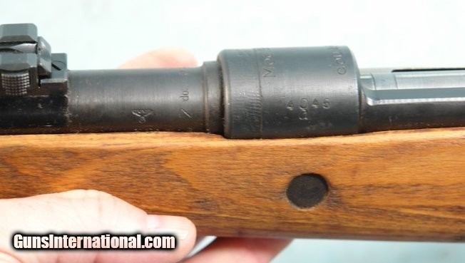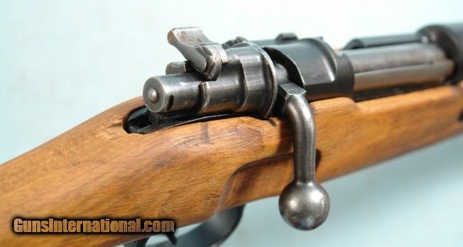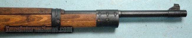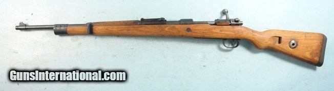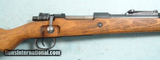 Description: WW2 GERMAN NAZI MAUSER K98K DOU/45 8MM INFANTRY RIFLE CIRCA 1945. Matching except floor plate and bolt and sight leaf. Matching laminate stock nuberd to gun on left side. Excellent military blue finish. Perfect Nazi Waffenampts on all correct parts are crisp. Receiver stamped “DOU/45” and “MOD 98” with crisp “EAGLE/SWASTIKA/WaA80”. Nice late War example in perfect working order and excellent plus bright bore. Extra nice Nazi markings. SOLD Curio/Relic: Yes Rifle Caliber: 7.92x57mm Mauser |