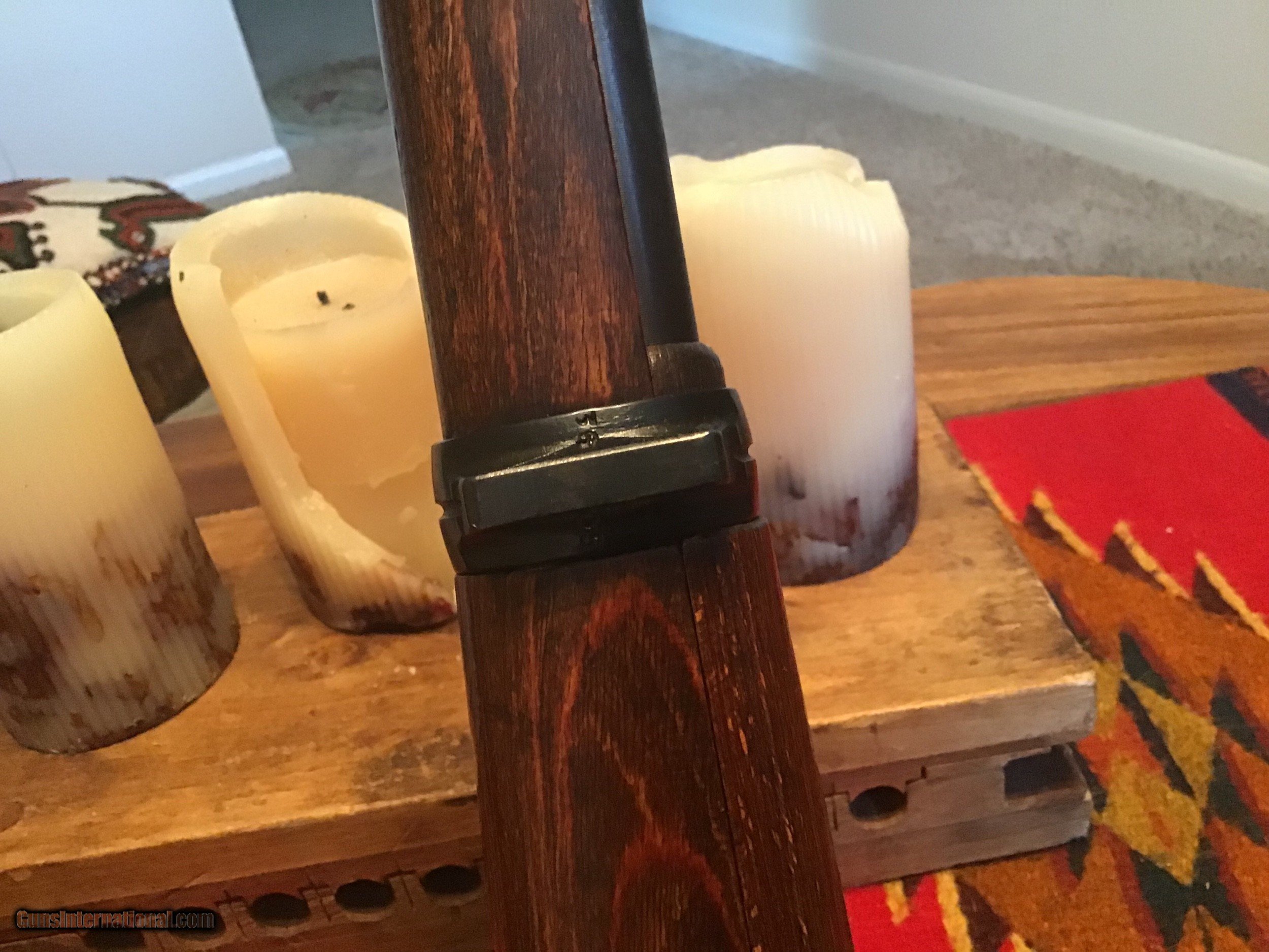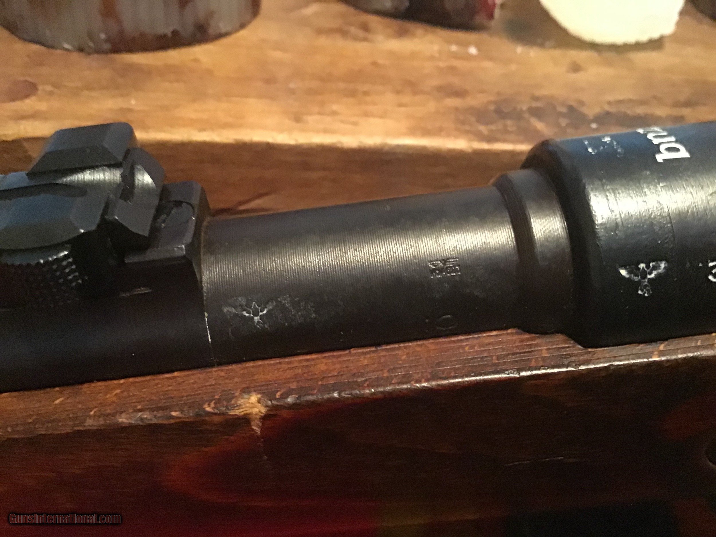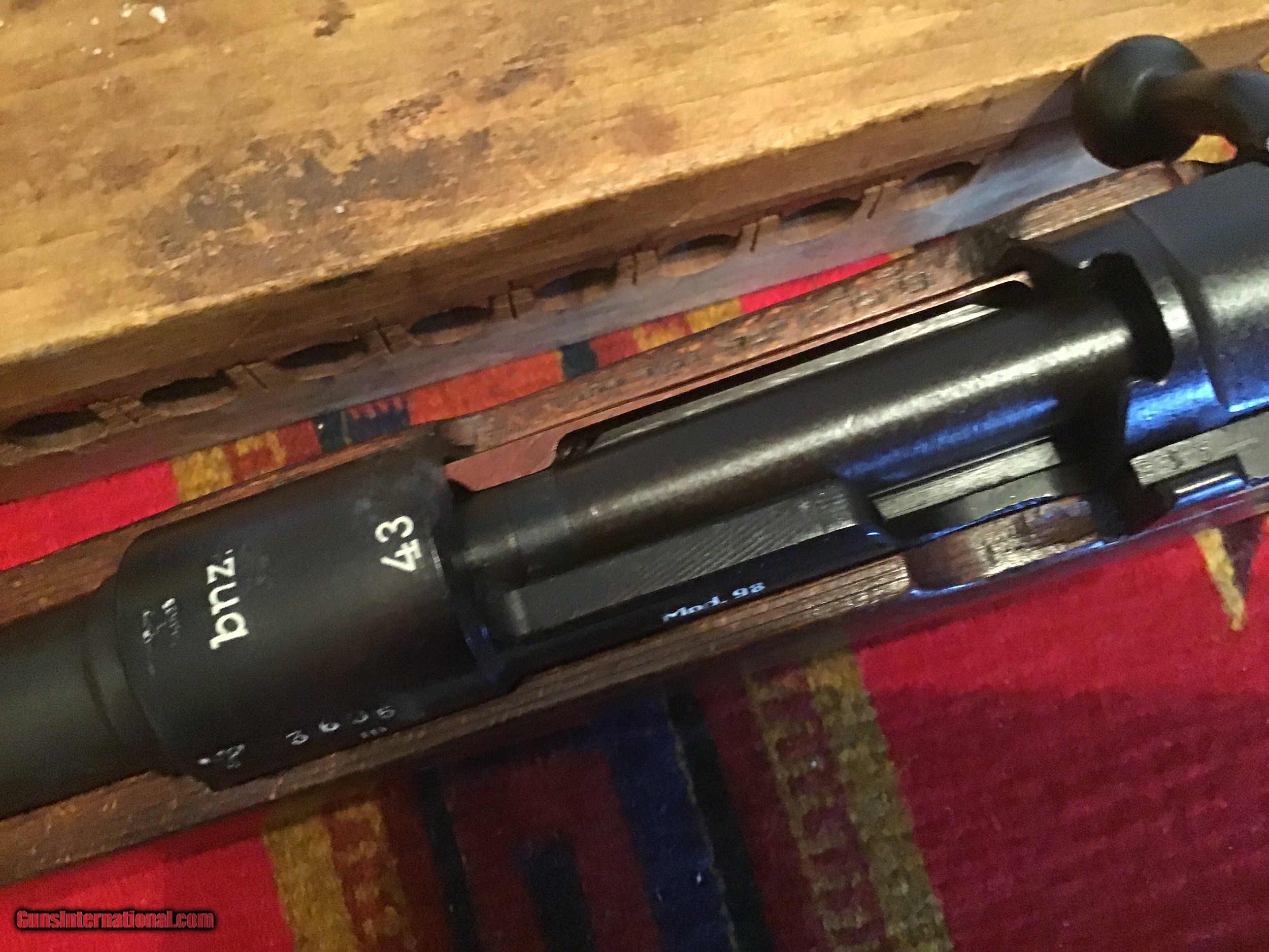 Description: SOLD!!! Very fine, near excellent condition WWII German 98k Mauser rifle in 8mm Mauser (7.92 x 57) caliber that has the “bnz 43” code on the receiver for production by Steyr in 1943. Rifle is not import marked and has all matching serial numbers except the ejector box and band spring. Metal finish is excellent original blue, but has some scattered very light pinprick pitting. Bore is very good with strong rifling, mostly bright with some very light pitting. Stock has original finish and shows some normal handling marks. Complete with cleaning rod and front sight hood. A really nice WW2 German Steyr 98k. Most likely vet bring back. SOLD Curio/Relic: Yes |