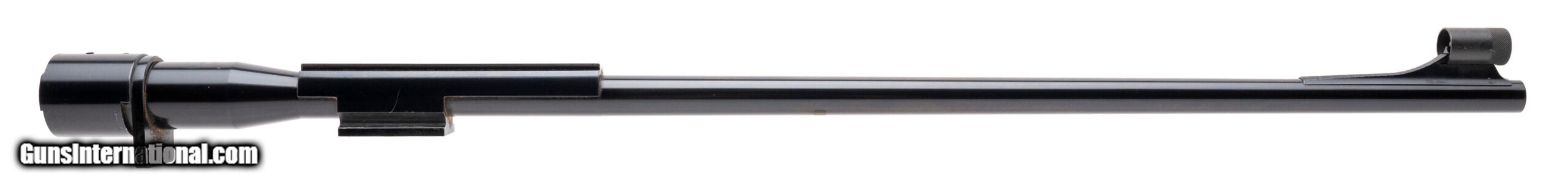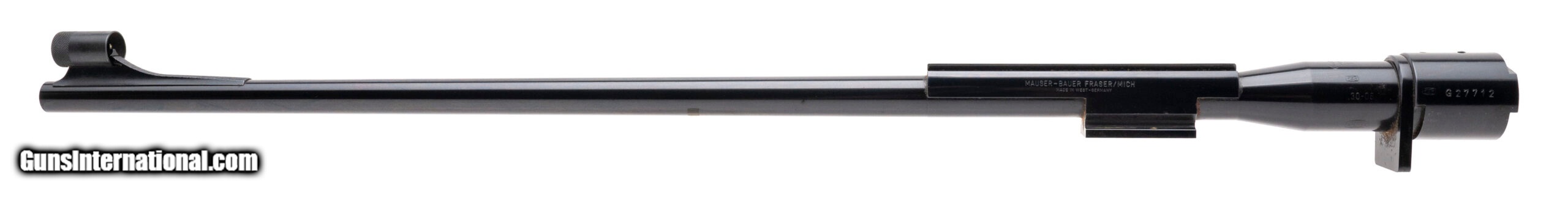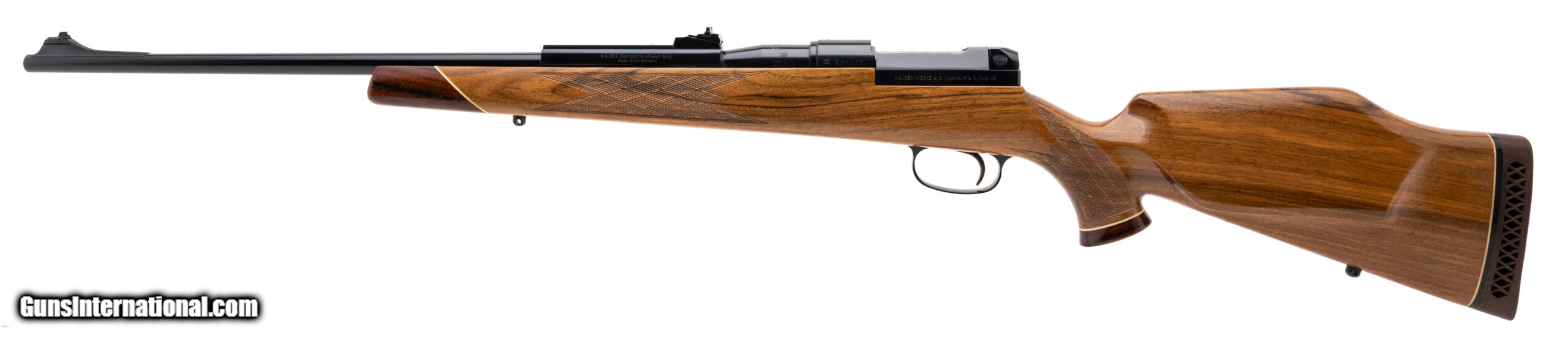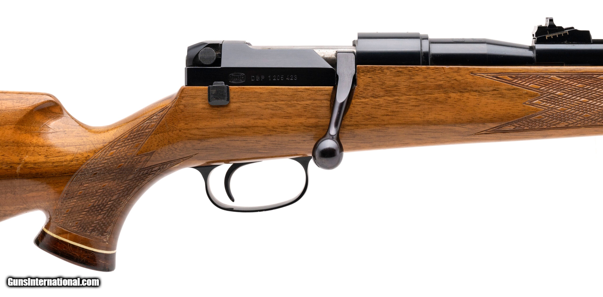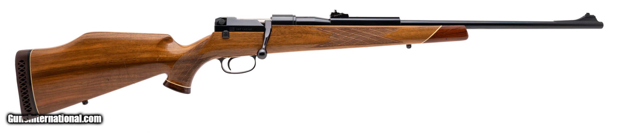 Description: "SN: DBP1205423 made circa 1960’s in Germany. Bolt action rifle with a 24" barrel chambered in 270 Winchester with a ramped front sight and adjustable rear sight mounted on a dovetailed quarter rib style base. The 2nd barrel is 24" chambered in 30-06 with a ramped front sight with a hood and the same quarter rib base without the rear sight. Telescoping bolt action with a sliding bolt carriage that houses the push button safety on the back of the bolt with the release button on the right side of the action to remove the bolt and carriage. Excellent bores on both barrels and all the metal finish is near excellent with very little wear or handling marks. Stock has some crackling in the finish which is common of German guns from this era similar to the old Weatherby’s but it is only in the finish, there are no cracks in the wood itself. Comes with case and extra barrel. SOLD |