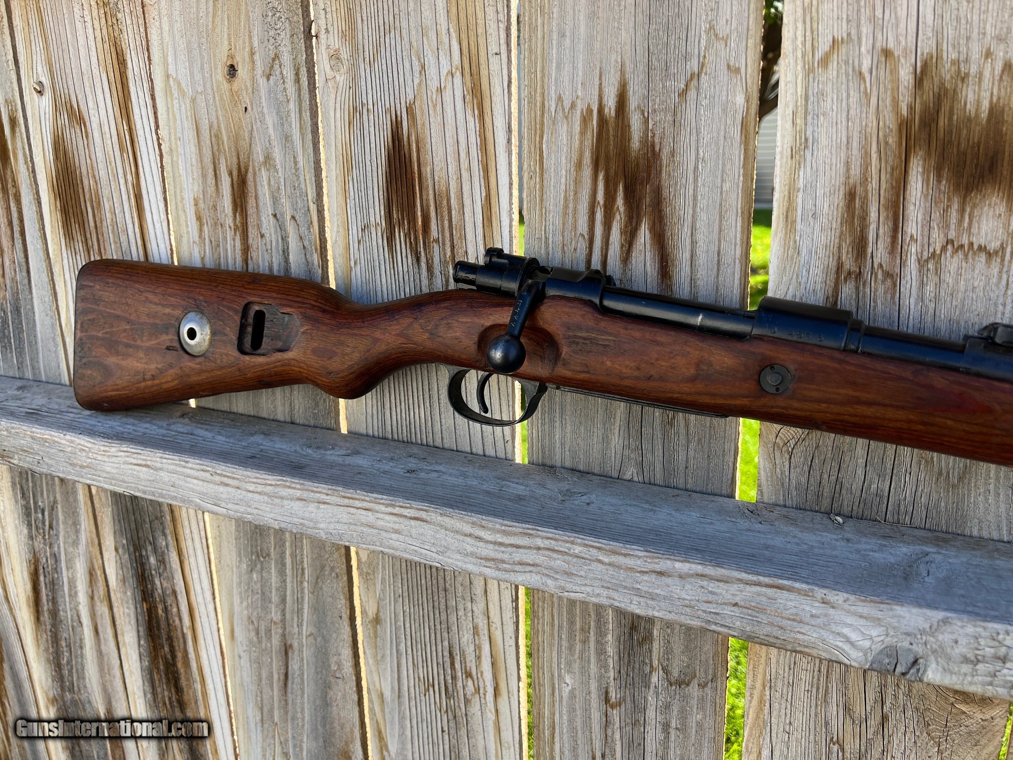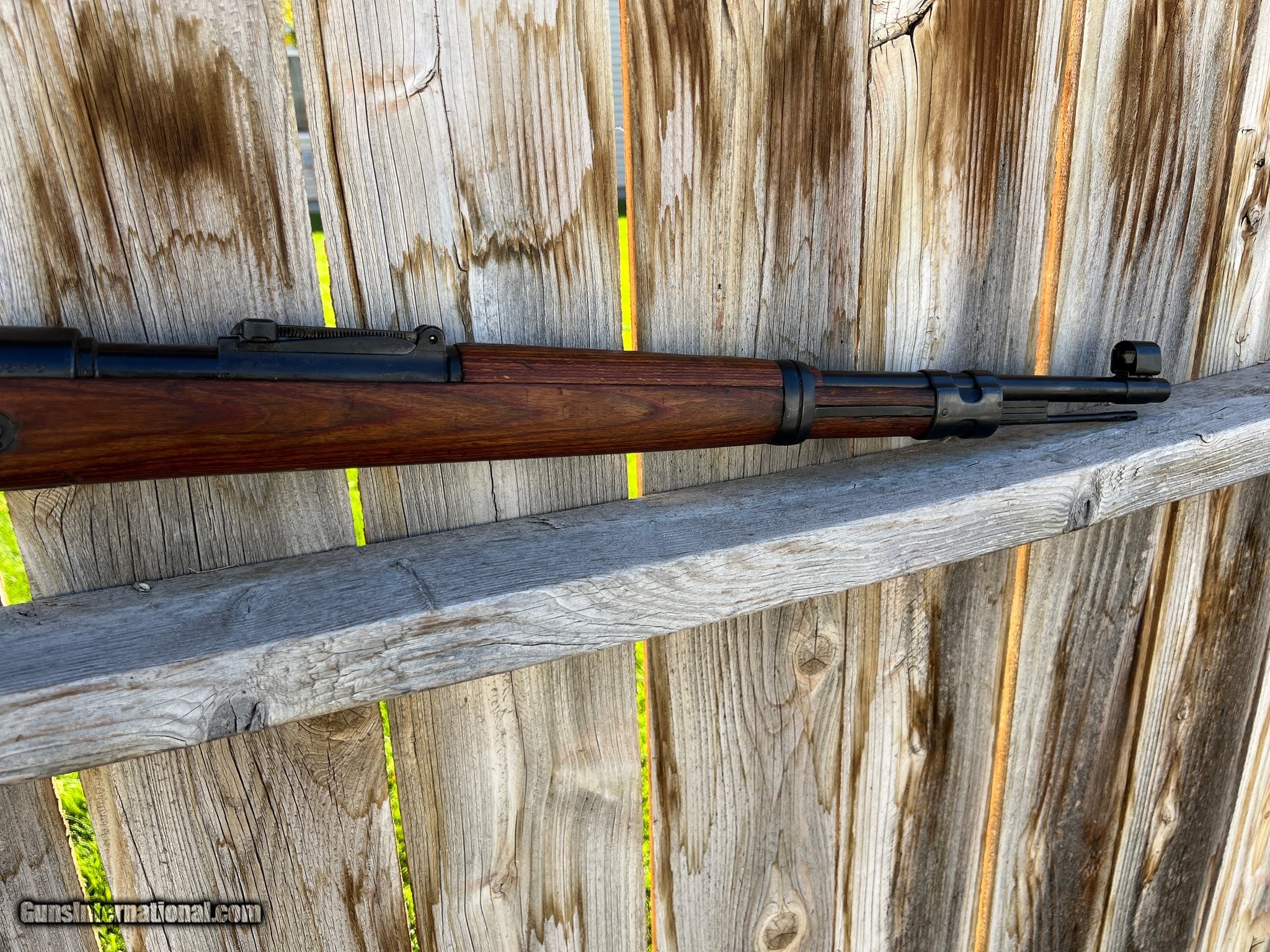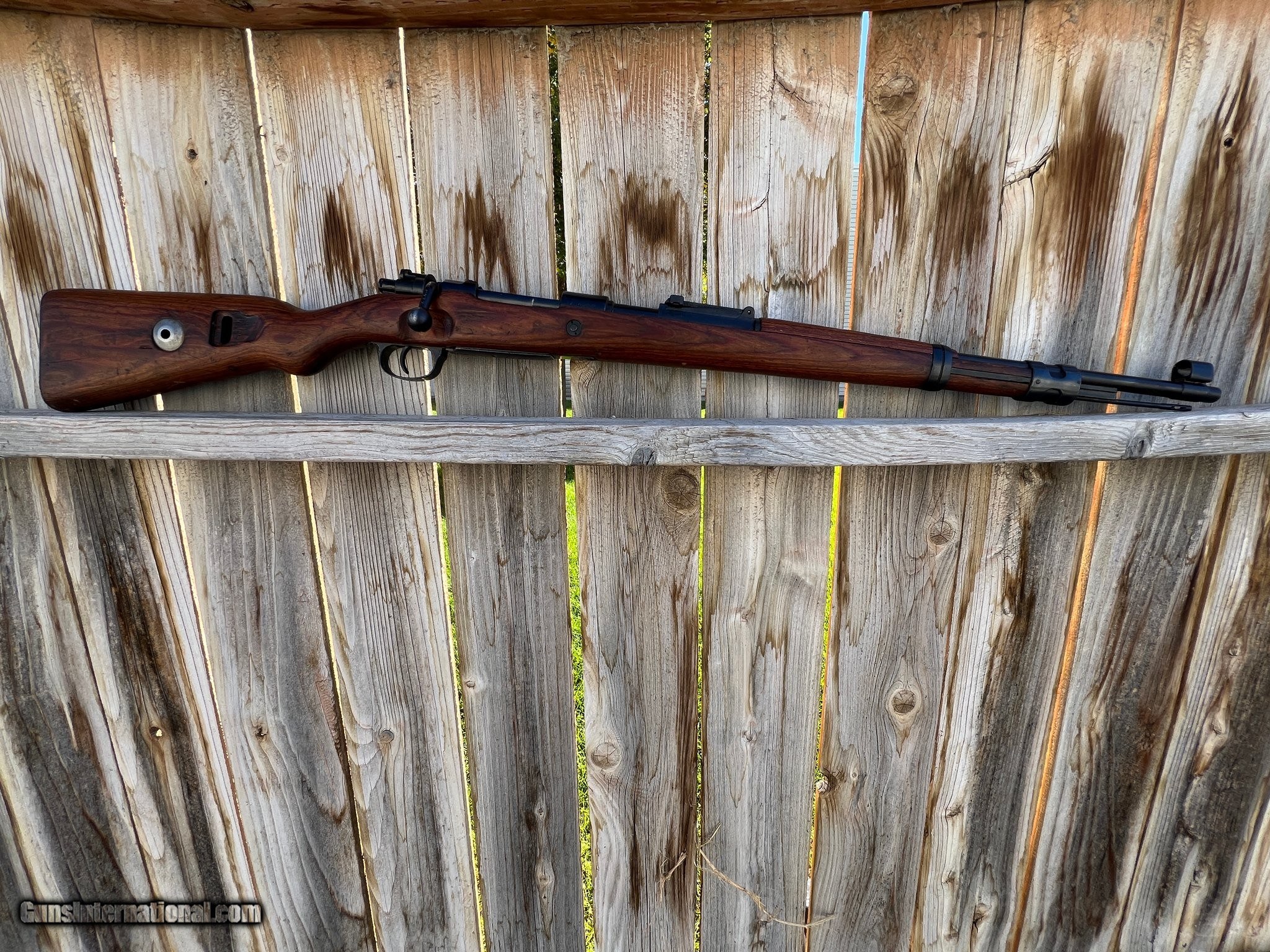 Description: Guns Listing ID: 573427 Yugo Capture K98 Mauser Item Specifics Make: Mauser (Original markings scrubbed) Model: K98 Caliber: 8mm Mauser Action: Bolt-action Finish: Blued Stock: Original Wood Stock with Original Metal Barrel Length: 23\" Sights: Rear tangent / hooded front Description For sale: a Yugo capture K98 Mauser in good condition. This is an example of a historic K98 pattern rifle that was obtained as a wartime capture and refinished in Yugoslav inventory. It is chambered in 8mm Mauser and functions as a bolt-action rifle with 3 position saftey. Receiver, bolt, and barrel show minor wear with only some scratches and dings that are common for wartime military surplus. Stock is in good shape and will show normal wear to be expected on a military surplus rifle. Mechanical condition: bolt cycles smoothly and safety operates correctly. This gun still has alot of cosmoline on it and will need to be deep cleaned before firing. Bore: Bright with strong rifling and no pitting. Proof marks: All original german markings have been scrubbed off this rifle and it will only have Yugo markings like the Yugo crest on it. SOLD Curio/Relic: Yes Manufacturer: GERMAN MILITARY Model: K98 Caliber Info: 8MM MAUSER Condition: Used - Non-Certified Barrels: 23" BARREL Action: BOLT ACTION Finish: black /w wood stock |