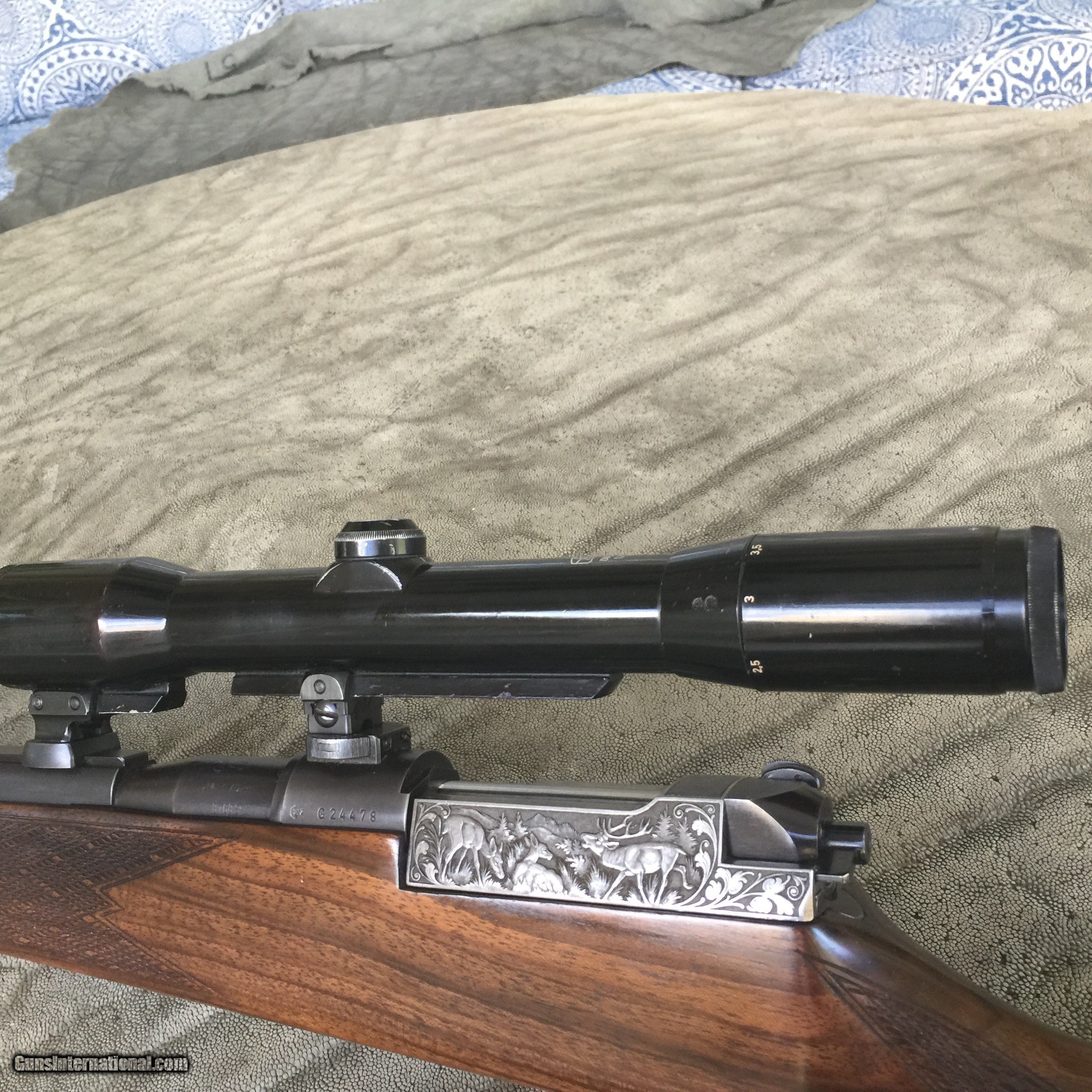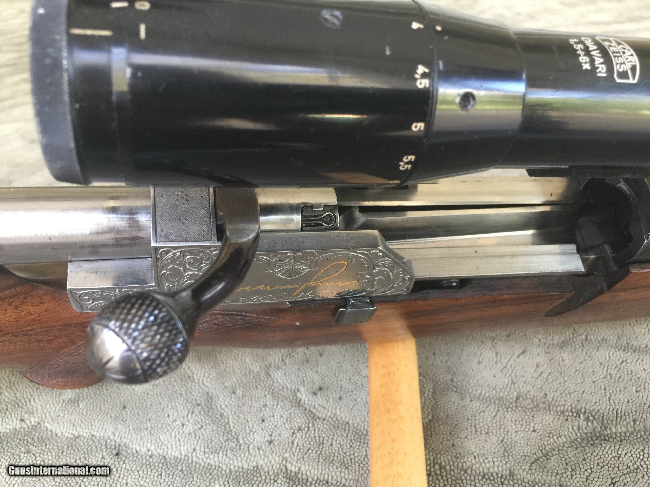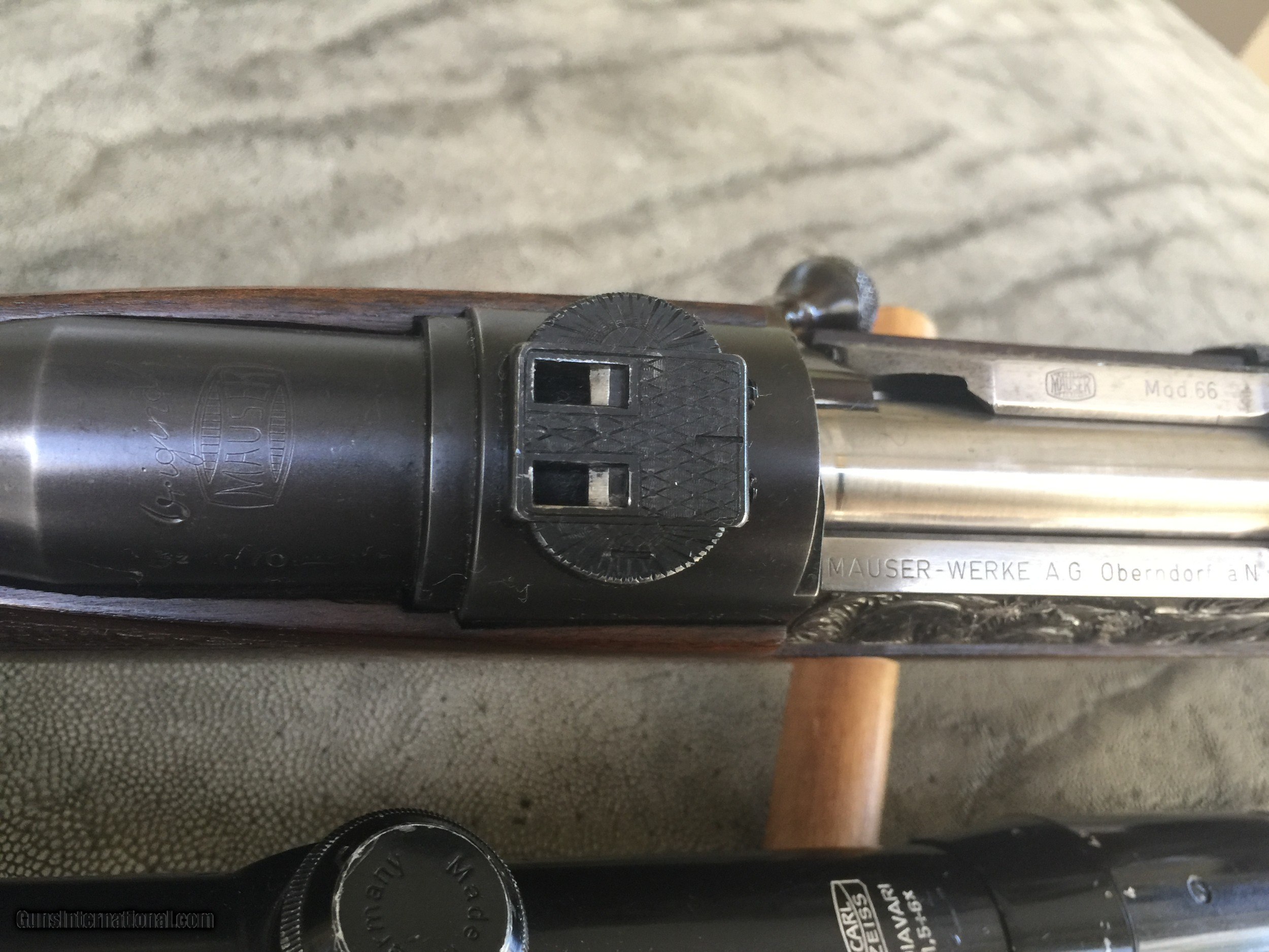 Description: Mauser 66 Magnum **DIPLOMAT** 8x68S Dangrous Game Rifle ***** DEEP CHISEL ENGRAVED ***** with a 25 inch mint bore. 8X68 MAGNUM IS A MAJOR PERFORMER JUST ABOVE A 338 WIN MAG. The barrel is semi-stainless flat finish, Interchangeable barrels are available for model 66 Mausers. Stock and checkering is excellent. Deep chisel engraved action, double set trigger, claw system with crystal clear **ZEISS 11/2 x 6 POWER* scope with duplex reticle. This is a great dangerous game rifle with all the features. THIS IS THE TOP END OF THE MAUSER RIFLE MODELS. INCLUDES BRASS AND BULLETS SOLD Rifle Caliber: 8x68mm S |