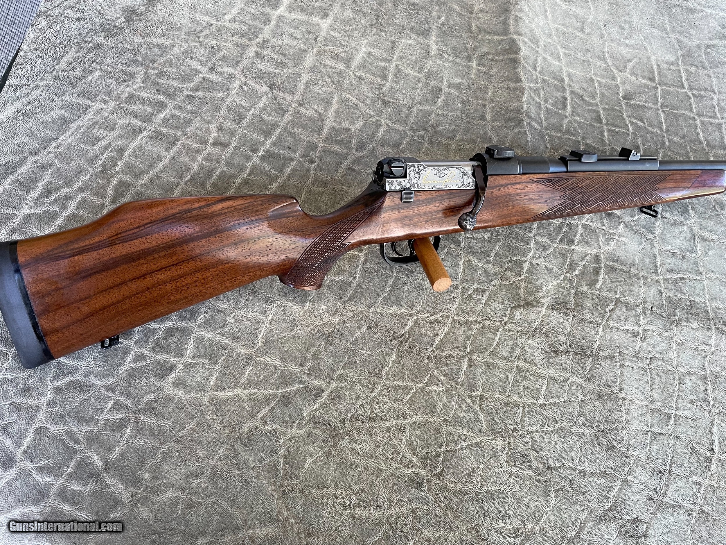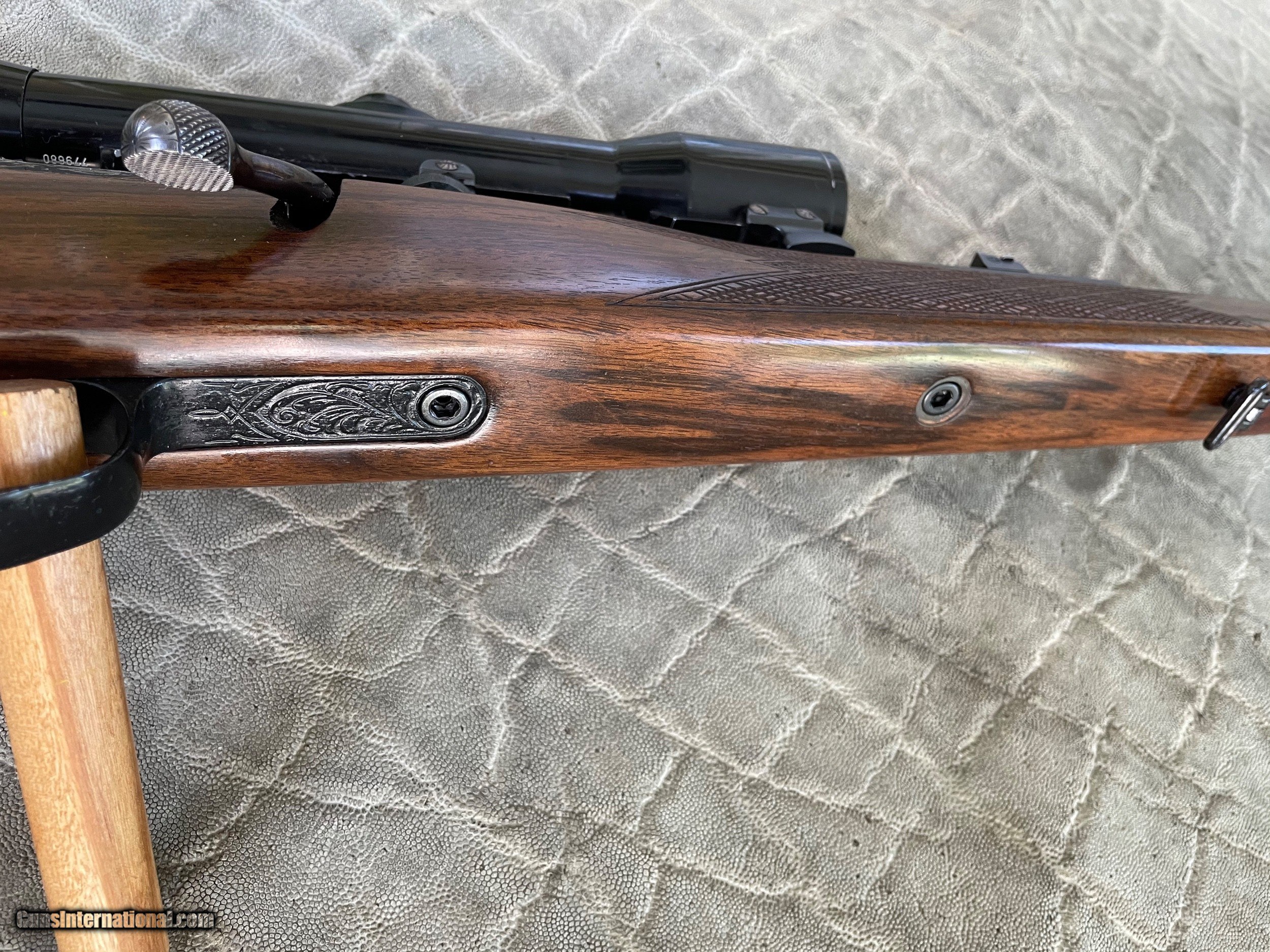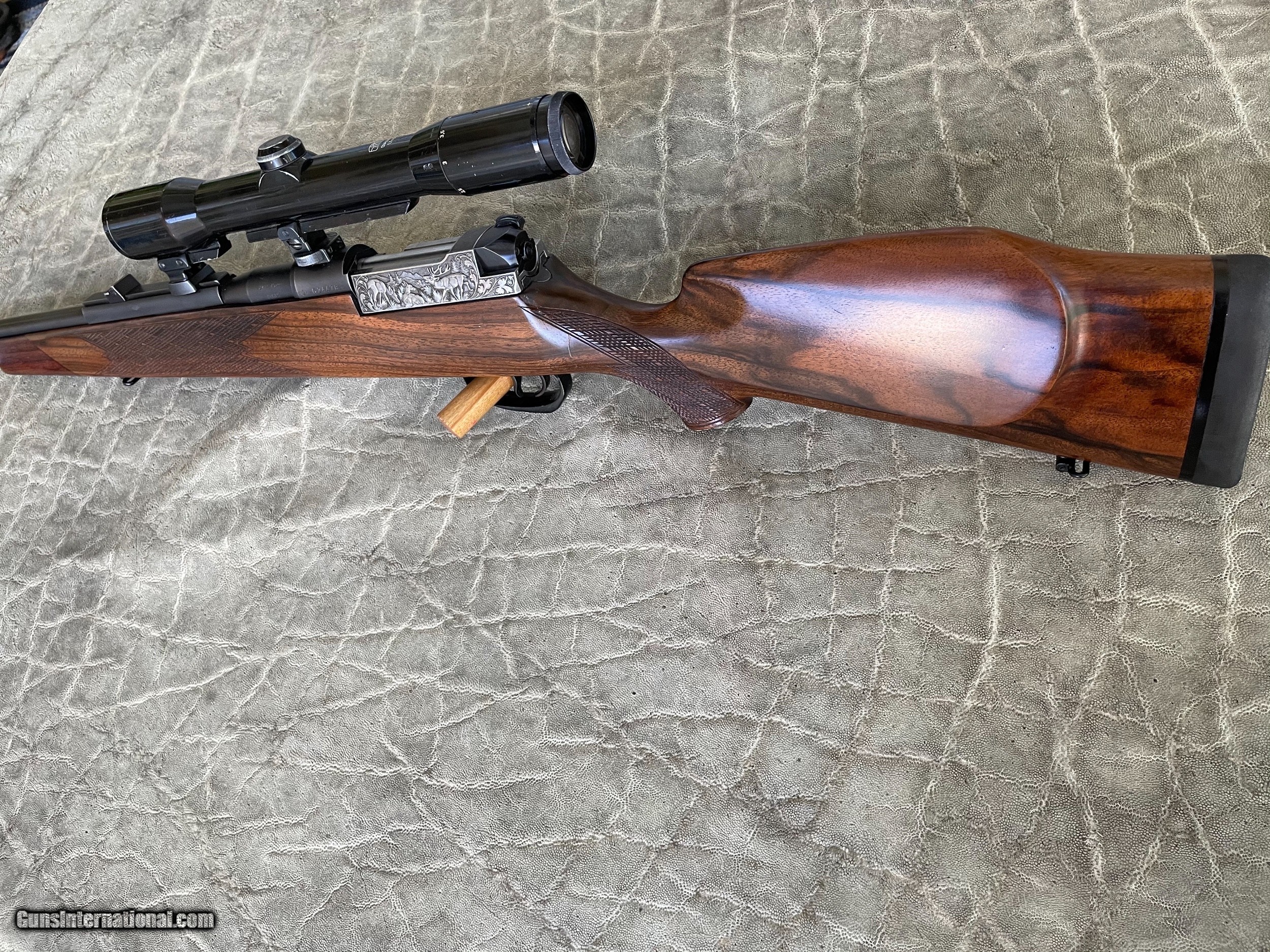 Description: Mauser 66 Magnum **DIPLOMAT** 8x68S Dangrous Game Rifle ***** DEEP CHISEL ENGRAVED ***** with a 25 inch mint bore. 8X68 MAGNUM IS A MAJOR PERFORMER JUST ABOVE A 338 WIN MAG. The barrel is semi-stainless flat finish, Interchangeable barrels are available for model 66 Mausers. Stock and checkering is excellent. Deep chisel engraved action, double set trigger, claw system with crystal clear **ZEISS 11/2 x 6 POWER* scope with duplex reticle. This is a great dangerous game rifle with all the features. THIS IS THE TOP END OF THE MAUSER RIFLE MODELS. INCLUDES BRASS AND BULLETS SOLD Rifle Caliber: 8x68mm S |