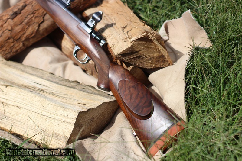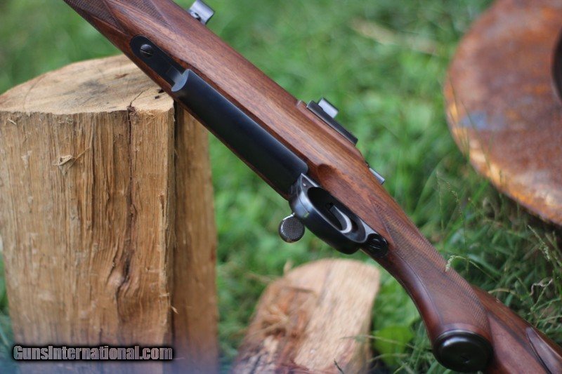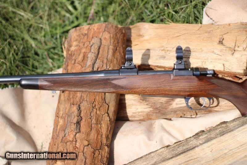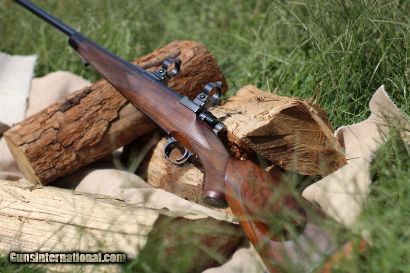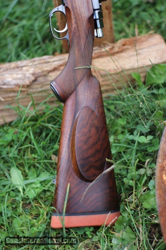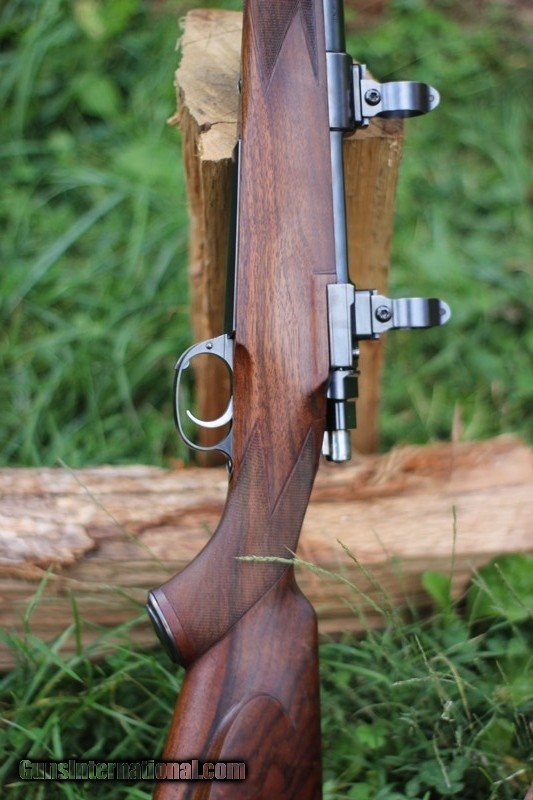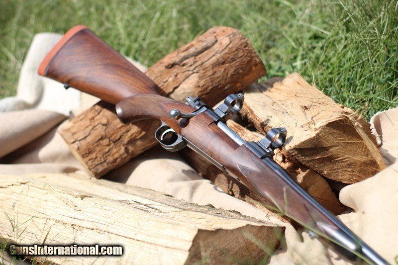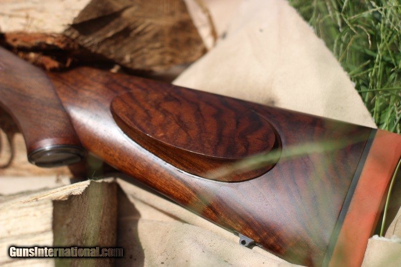 Description: 24” Mid taper barrel with excellent bore. Classic English style stock with pancake type cheek piece. 14” LOP over Silvers pad. Fine 26 LPI checkering with mullered borders. 3 position custom safety, Tally rings & bases, all metal rust blued oil finished wood. $1,759 SOLD |
