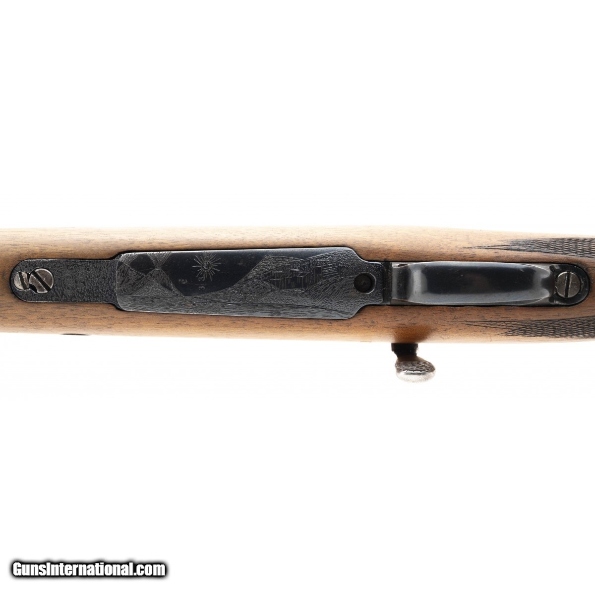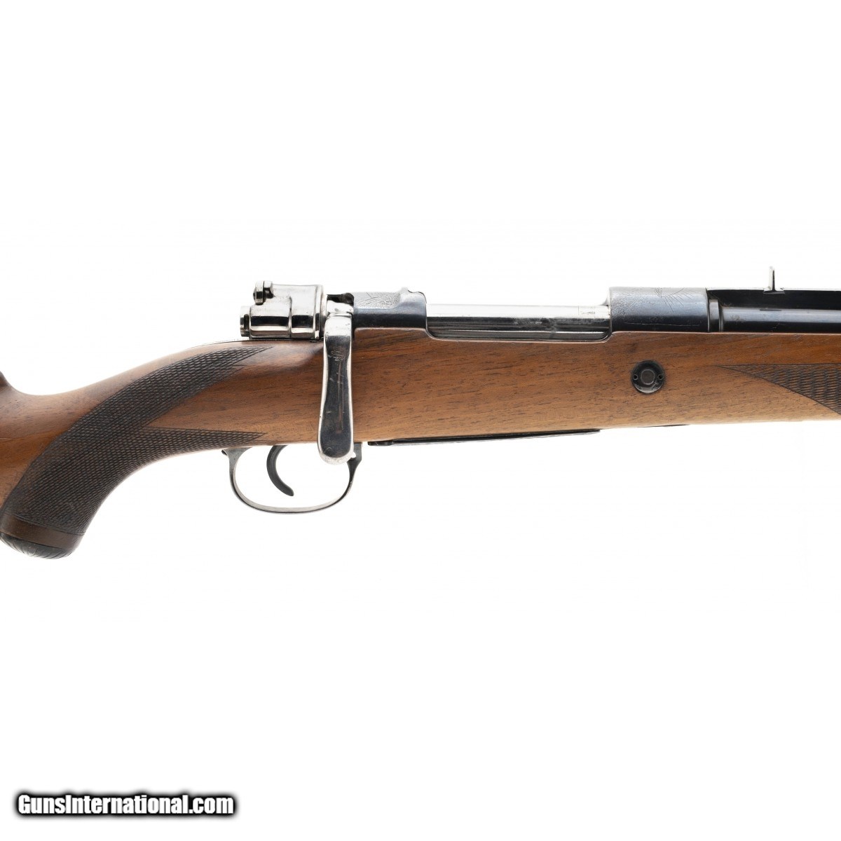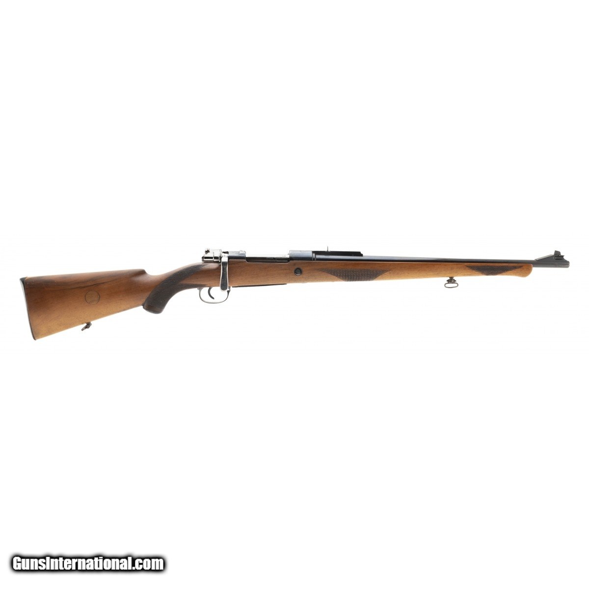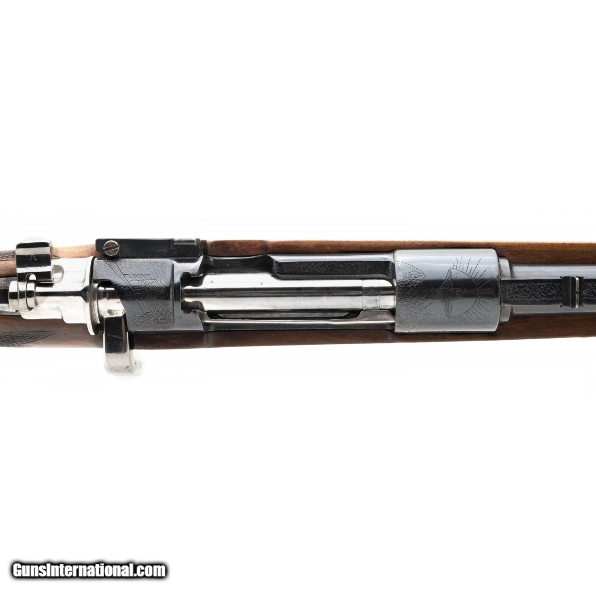 Military Mauser rifle that's been custom sporterized in the ""African"" style with long checkered stock. The barrel is 20"" and the action and floor plate have been engraved in a folksy style. The bolt is nickel plated and a quarter rib sight has been added. The bore is excellent. A neat and unusual Mauser carbine.