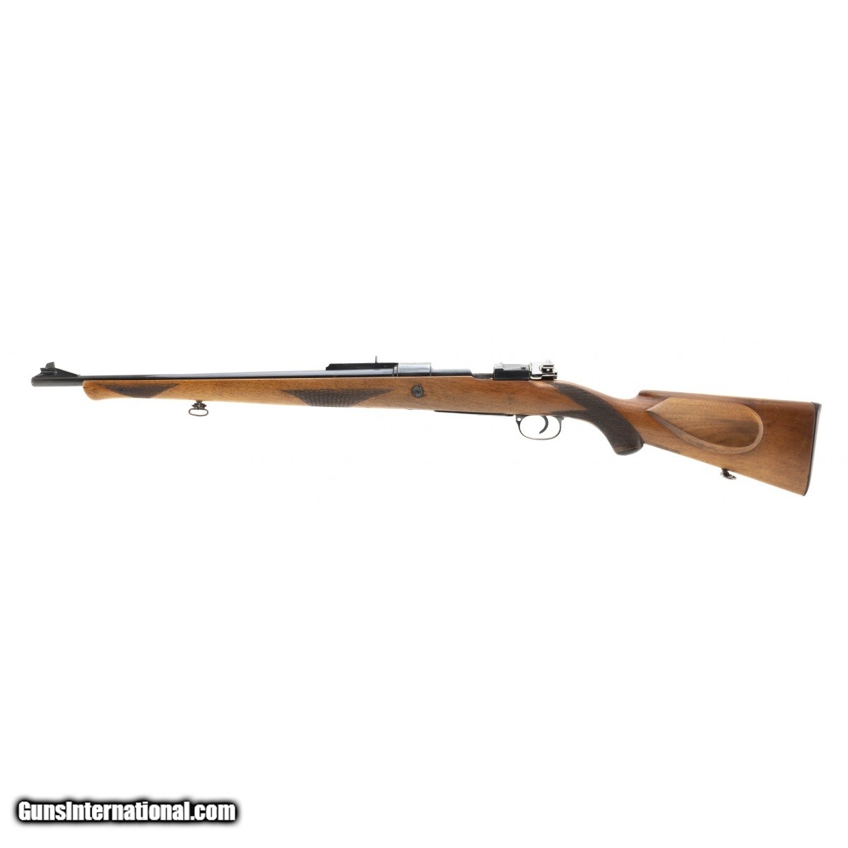 Description: " Military Mauser rifle that's been custom sporterized in the ""African"" style with long checkered stock. The barrel is 20"" and the action and floor plate have been engraved in a folksy style. The bolt is nickel plated and a quarter rib sight has been added. The bore is excellent. A neat and unusual Mauser carbine. SOLD |