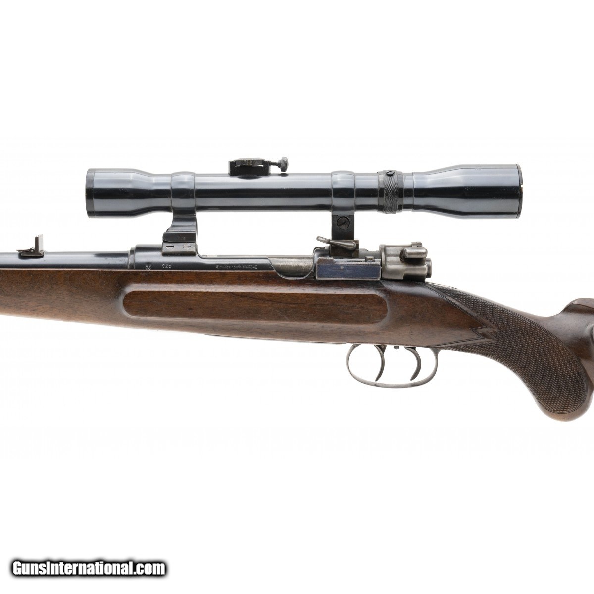 This 8mm Mauser caliber Model 98 sporting rifle was made from a military action after WWI. The overall length is approx. 43.5"". The approx. 24"" round stepped barrel has an excellent bore with bright, strong rifling. It is equipped with a ramped blade ftont sight and two leaf rear sight. The left side of the receiver is marked Gewhrfabrik Danzig at the center with an Austrian proof (also on the bolt handle root) and the serial number, 725, to the left front. The receiver, bolt, and scope mount numbers match. The scope is mounted on see through quick detach mounts. It is marke GERARD snd appears to have been refinished. The post and crosshair optics are clear. The gun has approx.. 92% blue with the floorplate and buttplate turning brown. The stock is excellent with no cracks or chips, a nicely defined cheekpiece, and sharp checkering at the wrist of the full pistoll grip. The rifle is equipped with European style sling swivels on the barrel and butt of the stock. The double set trigger action functions correctly. This is a fine example of a scoped Austrian sporting rifle fabricated from a WWI military Model 98 rifle action. It is ready for your European sporting rifle collection.