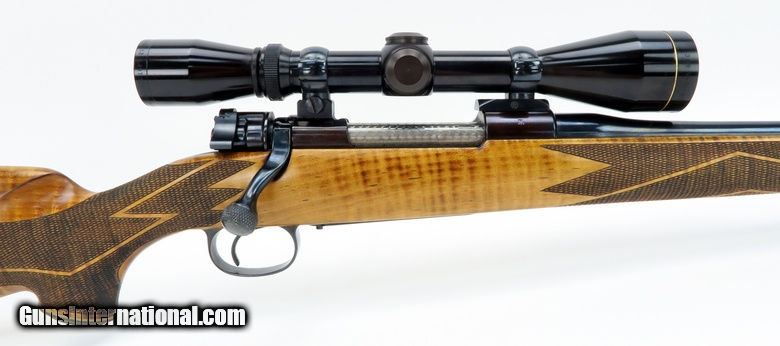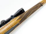 Description: W A Sukalle 98 7mm Mauser caliber rifle. Custom Mauser sporter built by Sukalle of Phoenix, AZ. Has a beautiful full length stock of tiger stripe maple, jeweled bolt and checkered bolt handle and trigger. The original floor plate is lightly engraved with a game scene, and the butt plate is profusely engraved. Excellent condition with a Leupold 3x9 scope.