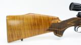 W A Sukalle 98 7mm Mauser caliber rifle. Custom Mauser sporter built by Sukalle of Phoenix, AZ. Has a beautiful full length stock of tiger stripe maple, jeweled bolt and checkered bolt handle and trigger. The original floor plate is lightly engraved with a game scene, and the butt plate is profusely engraved. Excellent condition with a Leupold 3x9 scope.