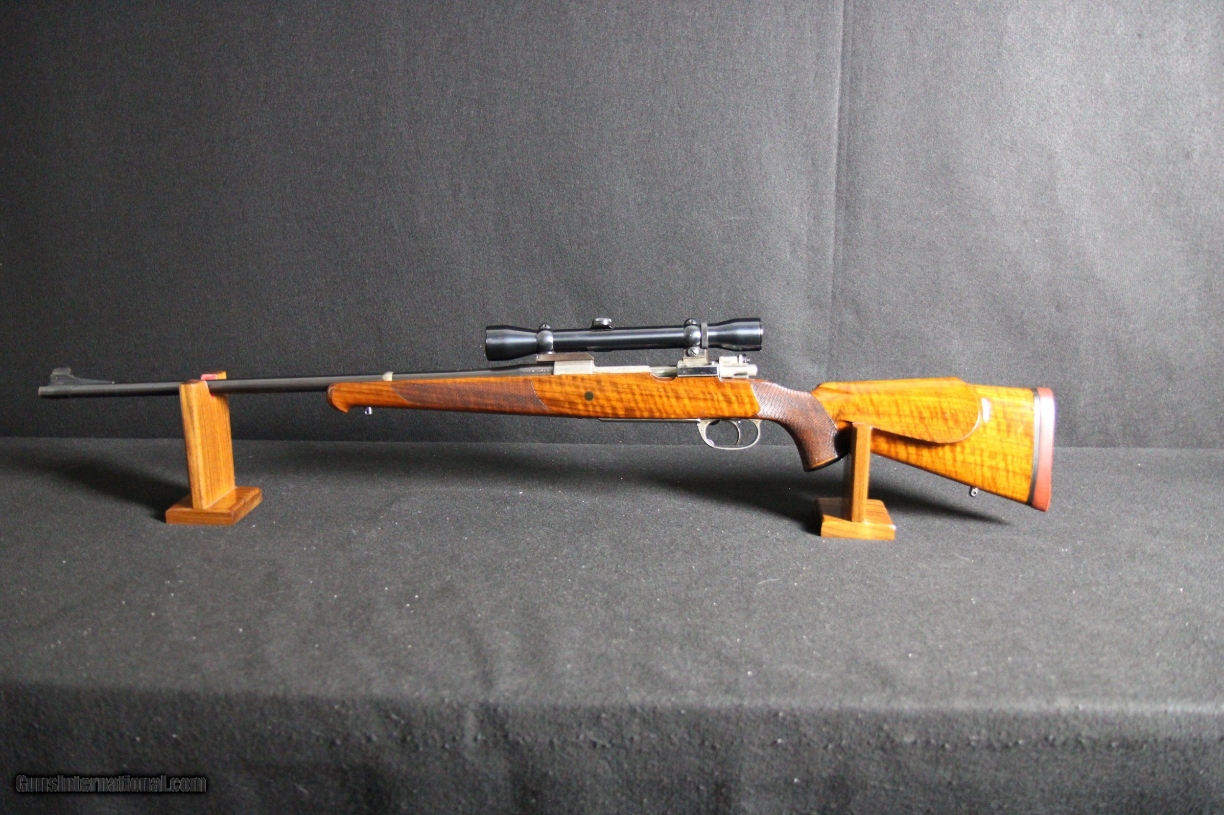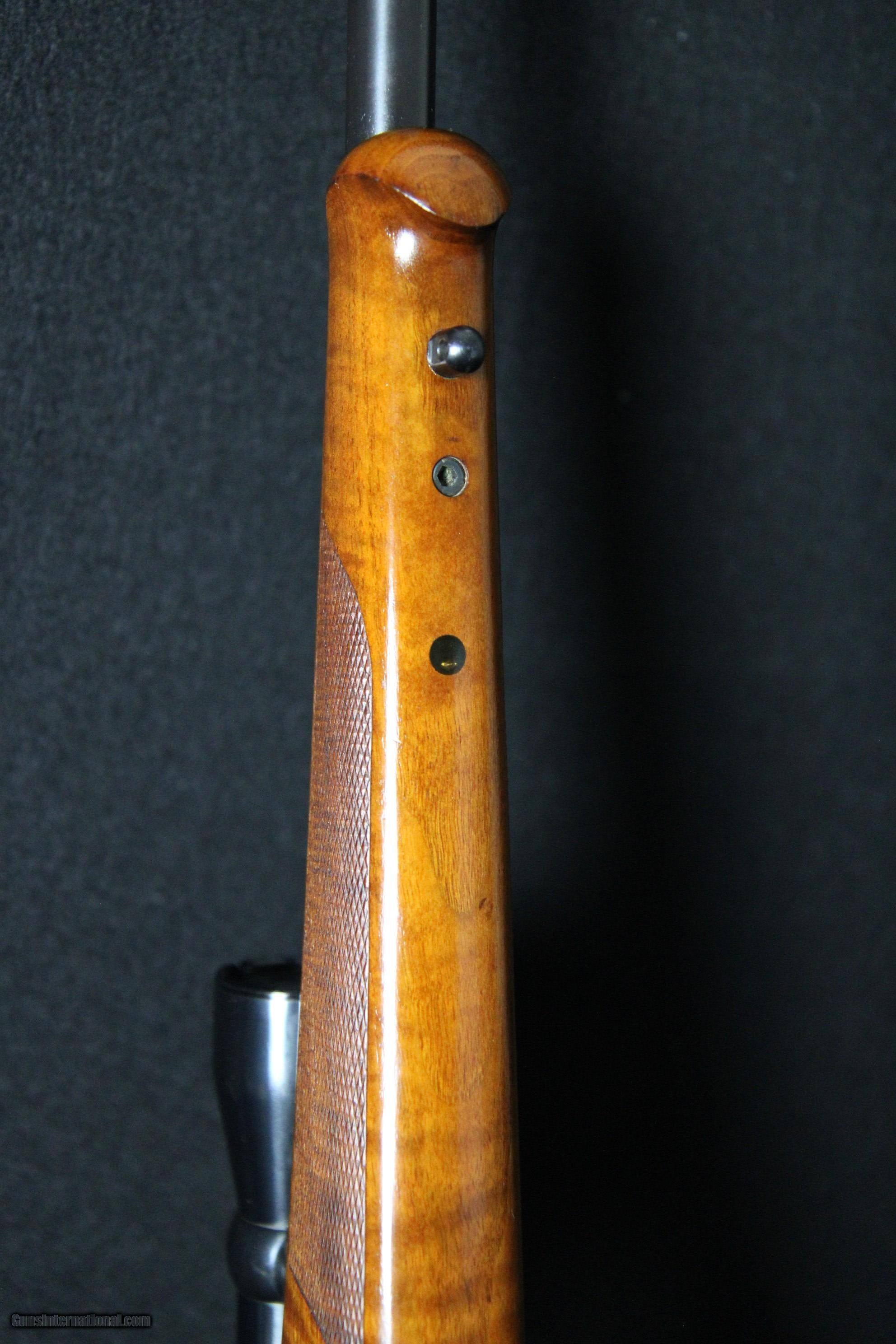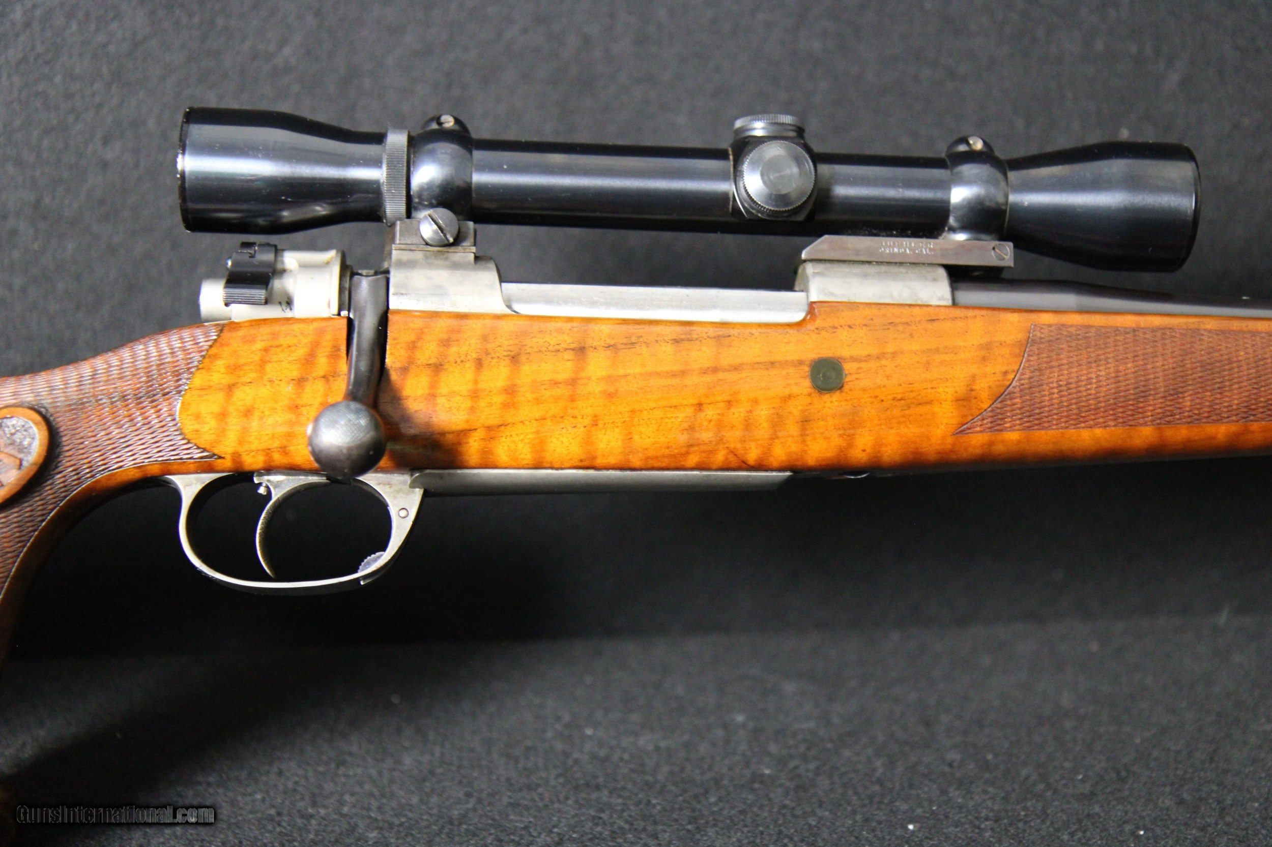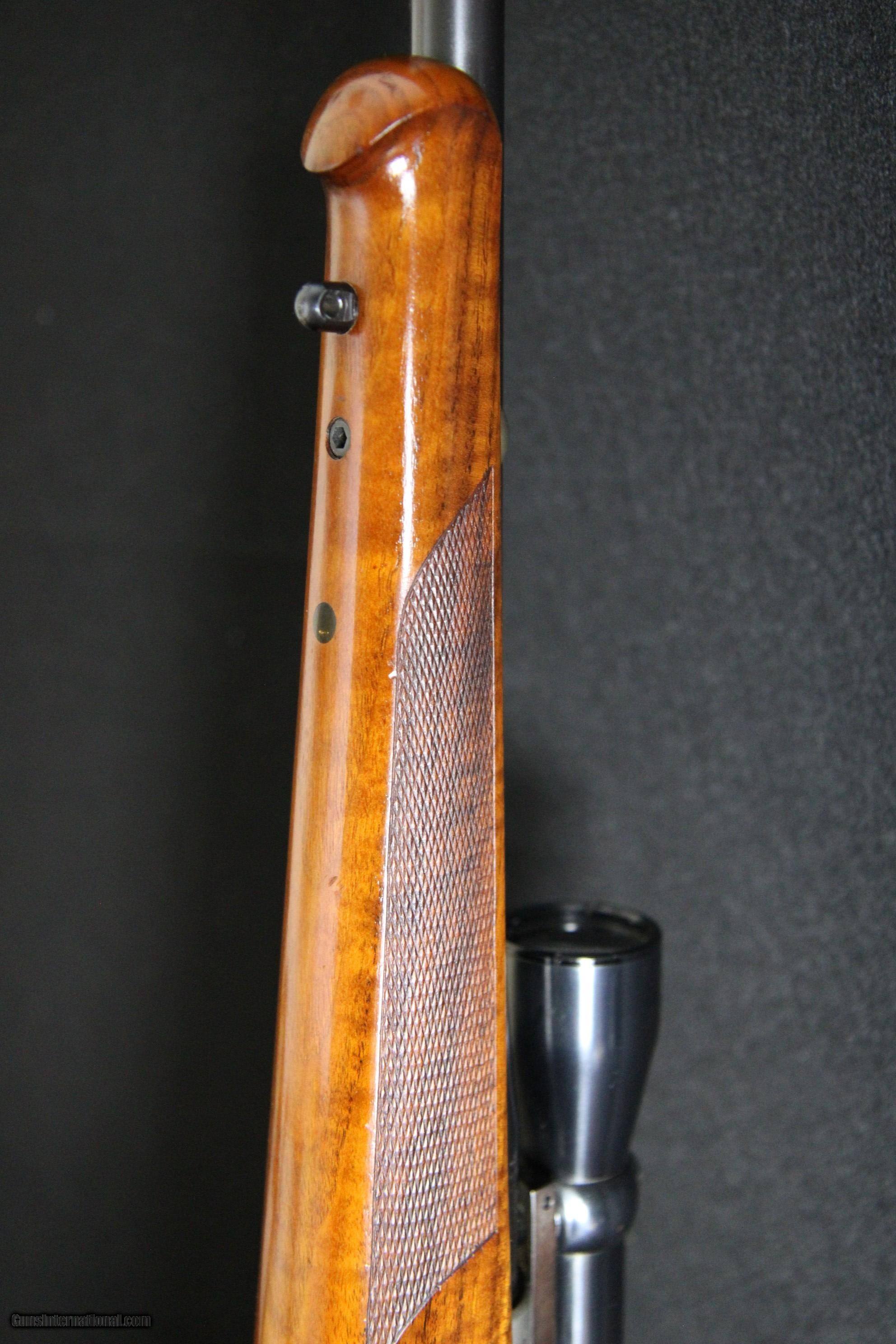 Description: Iver Henricksen was Elmer Keith's favorite gunmaker in the late 1950's and early 1960's and built this .338 Win Mag for Mr. Keith on a Single Square Bridge Magnum Mauser action. Originally built as a Hagler .280 Magnum ( and so marked ) the action and bottom metal of this rifle were color hardened which has since faded to a muted silver color, the Halger single set trigger is still in place and a Buehler scope safety has been fitted. The 24" barrel sports a Redfield barrel band front sight base with Sourdough blade sight, has no rear sight, and has a minty bore and chamber with no erosion in the lengthened throat. Stocked in a nicely fiddlebacked piece of English walnut to Mr. Keiths specifications with a Monte Carlo comb and sloping cheek piece Keith's initial "K" is relief carved into the right checkering pattern, the fore-end terminates in a graceful Schnabel and the butt is finished with a Noshoc pad with a length-of-pull of 13-1/8". The rifle is topped with what appears to be a Weaver K4 scope with Dual Range Reticle in Buehler rings on two piece bases. During Elmer Keith's tenure at "Guns" and "Guns & Ammo" magazines, this rifle was pictured and mentioned numerous times. The rifle also featured prominently in Keith's book "Hell I Was There", particularly in a Bering Sea Polar Bear hunt where it was used quite successfully. A classic sporting big-game rifle formerly the property of an icon in the Firearms writing industry. $15,950.00 SOLD |