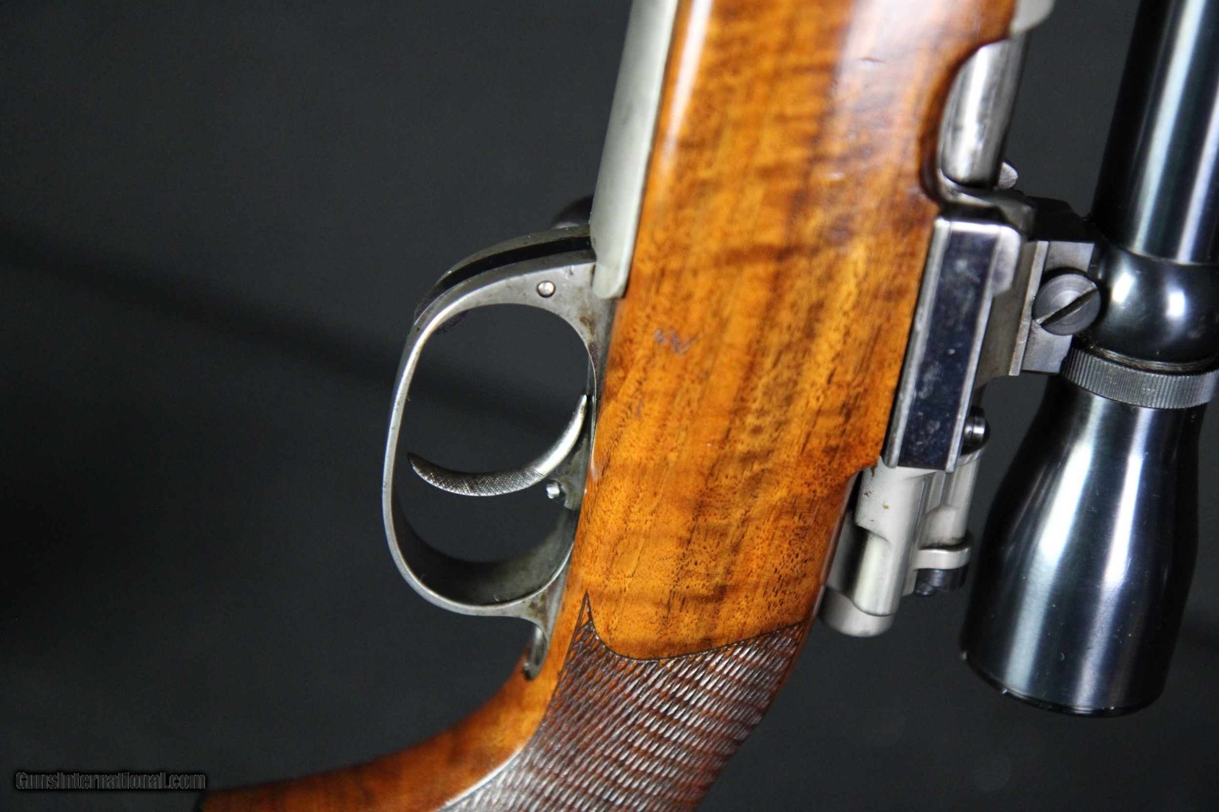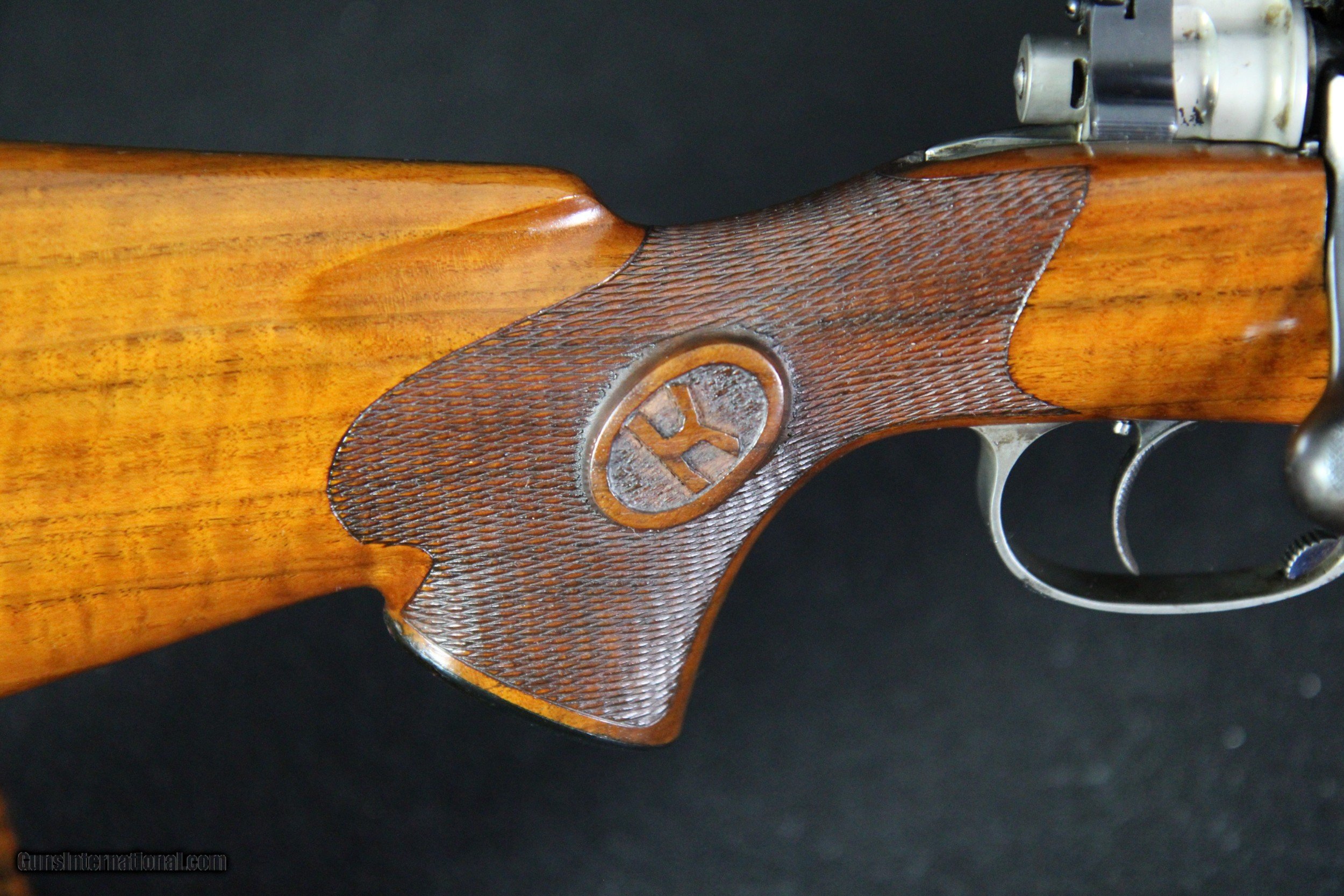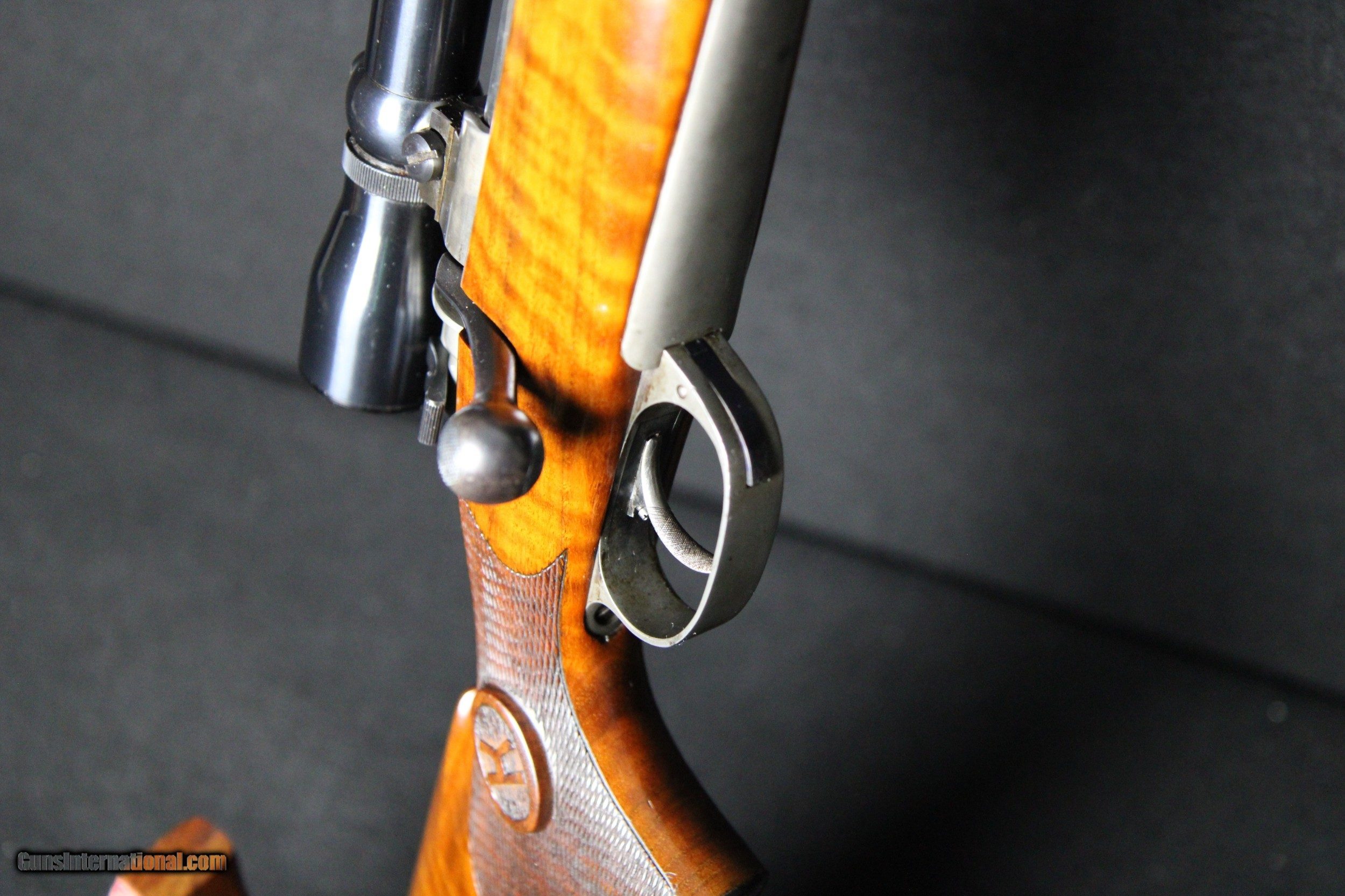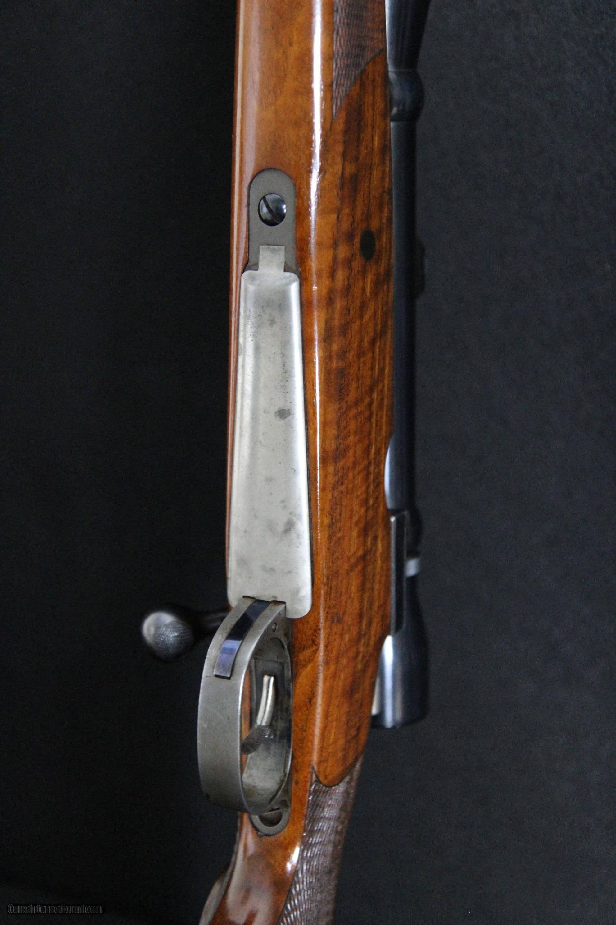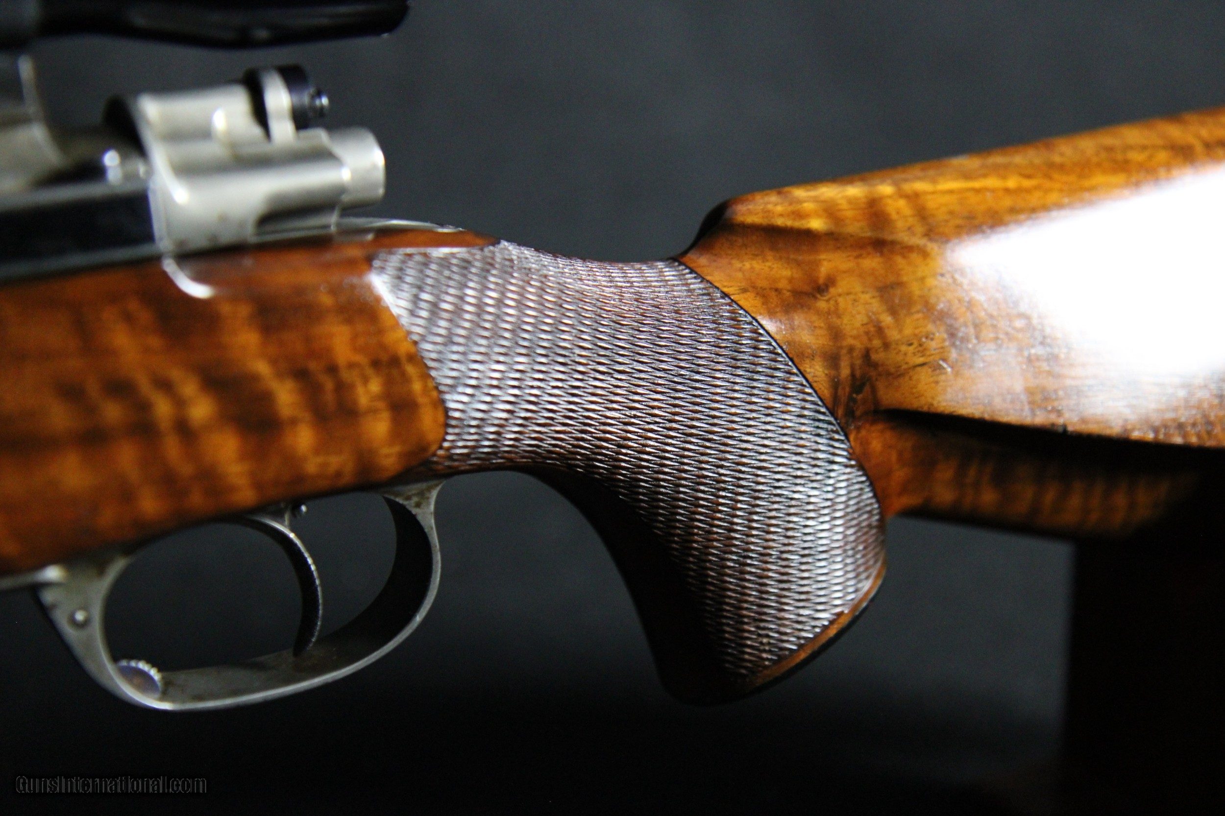 Description: Iver Henricksen was Elmer Keith's favorite gunmaker in the late 1950's and early 1960's and built this .338 Win Mag for Mr. Keith on a Single Square Bridge Magnum Mauser action. Originally built as a Hagler .280 Magnum ( and so marked ) the action and bottom metal of this rifle were color hardened which has since faded to a muted silver color, the Halger single set trigger is still in place and a Buehler scope safety has been fitted. The 24" barrel sports a Redfield barrel band front sight base with Sourdough blade sight, has no rear sight, and has a minty bore and chamber with no erosion in the lengthened throat. Stocked in a nicely fiddlebacked piece of English walnut to Mr. Keiths specifications with a Monte Carlo comb and sloping cheek piece Keith's initial "K" is relief carved into the right checkering pattern, the fore-end terminates in a graceful Schnabel and the butt is finished with a Noshoc pad with a length-of-pull of 13-1/8". The rifle is topped with what appears to be a Weaver K4 scope with Dual Range Reticle in Buehler rings on two piece bases. During Elmer Keith's tenure at "Guns" and "Guns & Ammo" magazines, this rifle was pictured and mentioned numerous times. The rifle also featured prominently in Keith's book "Hell I Was There", particularly in a Bering Sea Polar Bear hunt where it was used quite successfully. A classic sporting big-game rifle formerly the property of an icon in the Firearms writing industry. $15,950.00 SOLD |