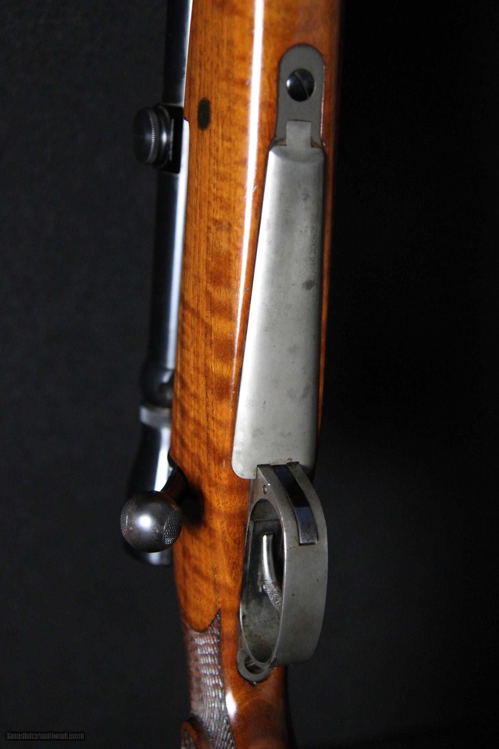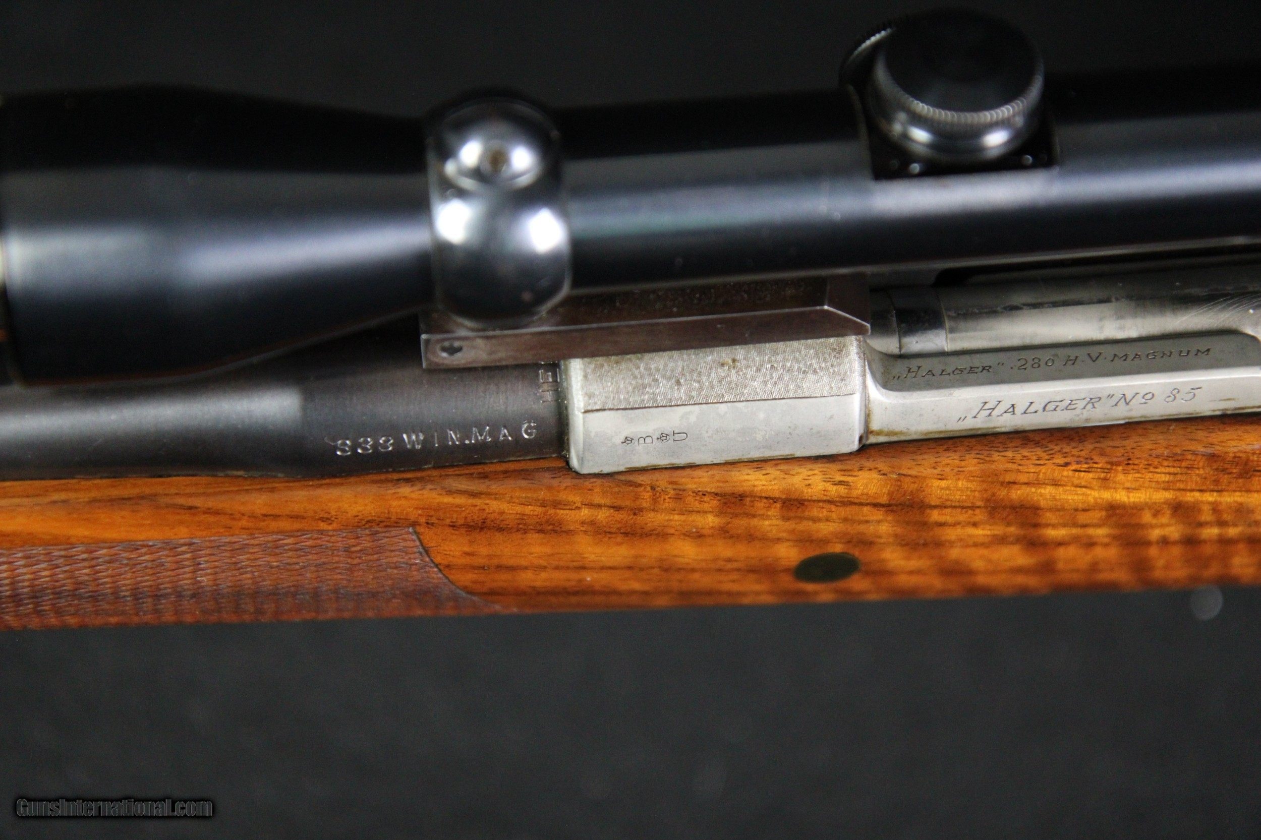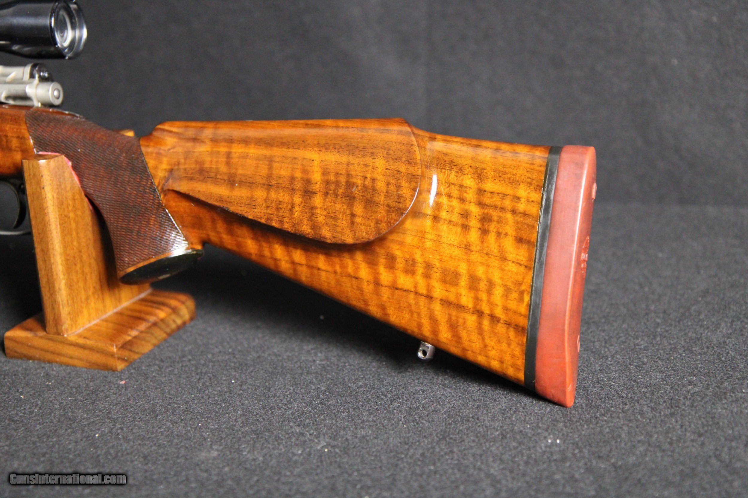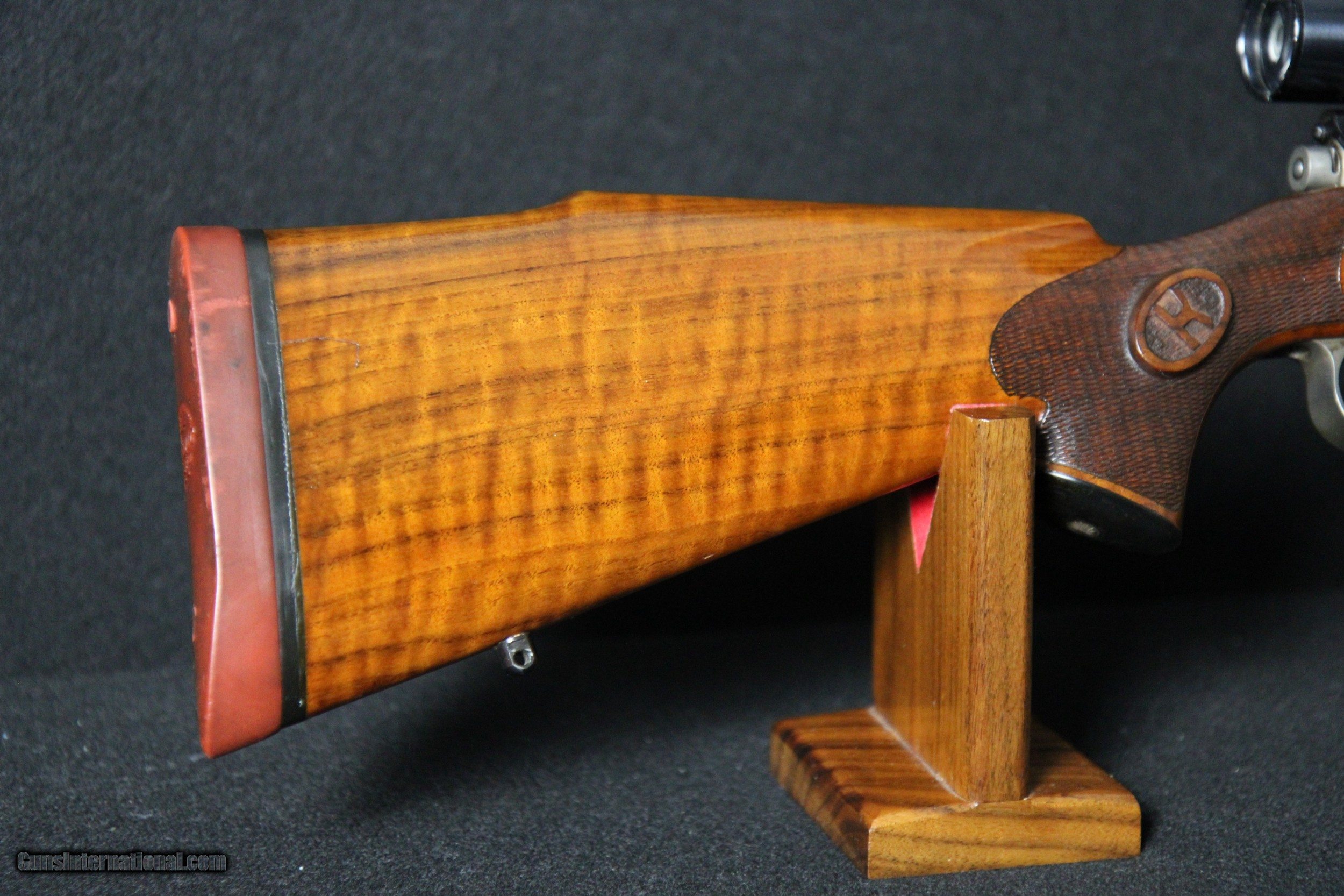 Description: Iver Henricksen was Elmer Keith's favorite gunmaker in the late 1950's and early 1960's and built this .338 Win Mag for Mr. Keith on a Single Square Bridge Magnum Mauser action. Originally built as a Hagler .280 Magnum ( and so marked ) the action and bottom metal of this rifle were color hardened which has since faded to a muted silver color, the Halger single set trigger is still in place and a Buehler scope safety has been fitted. The 24" barrel sports a Redfield barrel band front sight base with Sourdough blade sight, has no rear sight, and has a minty bore and chamber with no erosion in the lengthened throat. Stocked in a nicely fiddlebacked piece of English walnut to Mr. Keiths specifications with a Monte Carlo comb and sloping cheek piece Keith's initial "K" is relief carved into the right checkering pattern, the fore-end terminates in a graceful Schnabel and the butt is finished with a Noshoc pad with a length-of-pull of 13-1/8". The rifle is topped with what appears to be a Weaver K4 scope with Dual Range Reticle in Buehler rings on two piece bases. During Elmer Keith's tenure at "Guns" and "Guns & Ammo" magazines, this rifle was pictured and mentioned numerous times. The rifle also featured prominently in Keith's book "Hell I Was There", particularly in a Bering Sea Polar Bear hunt where it was used quite successfully. A classic sporting big-game rifle formerly the property of an icon in the Firearms writing industry. $15,950.00 SOLD |