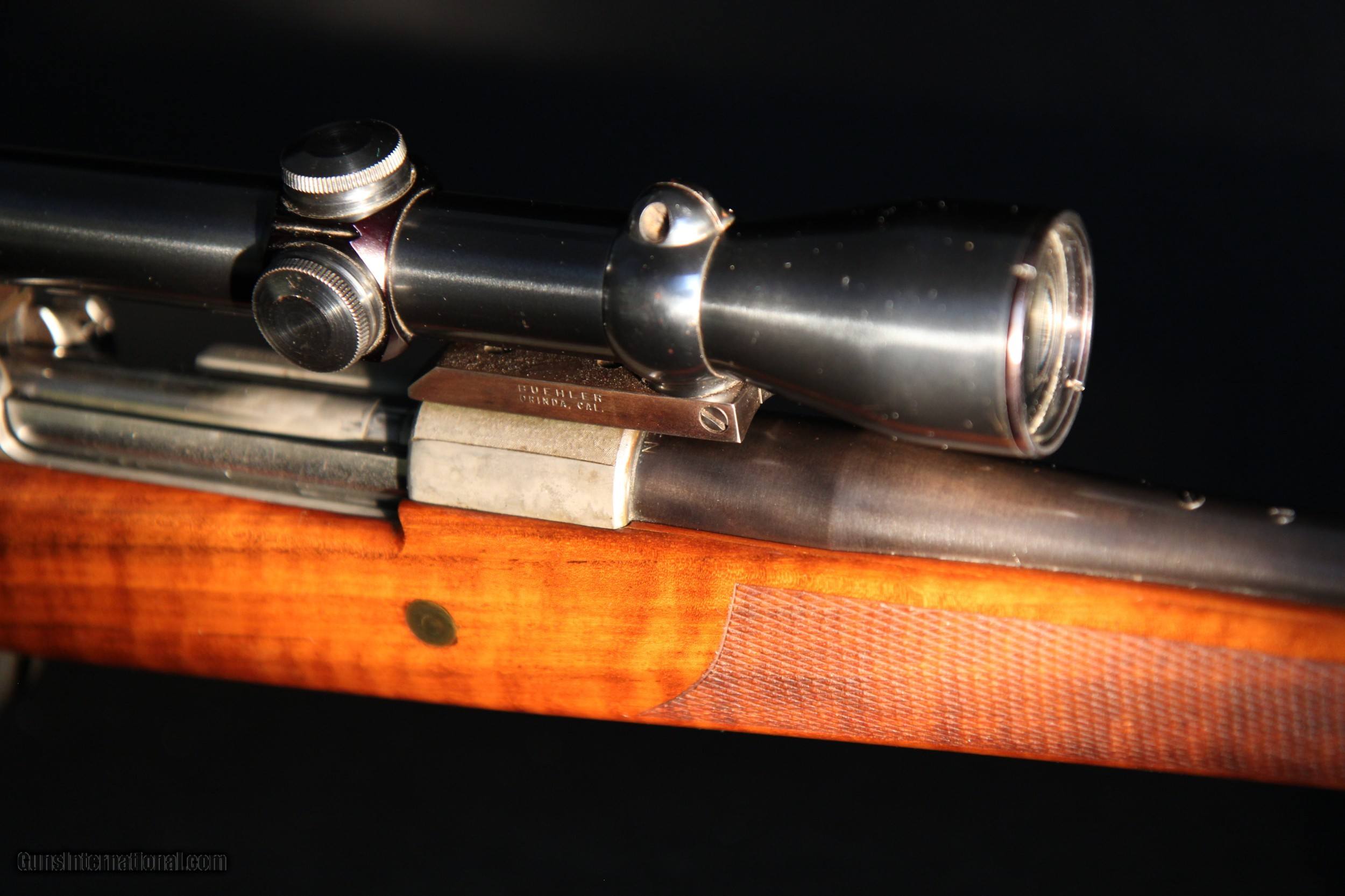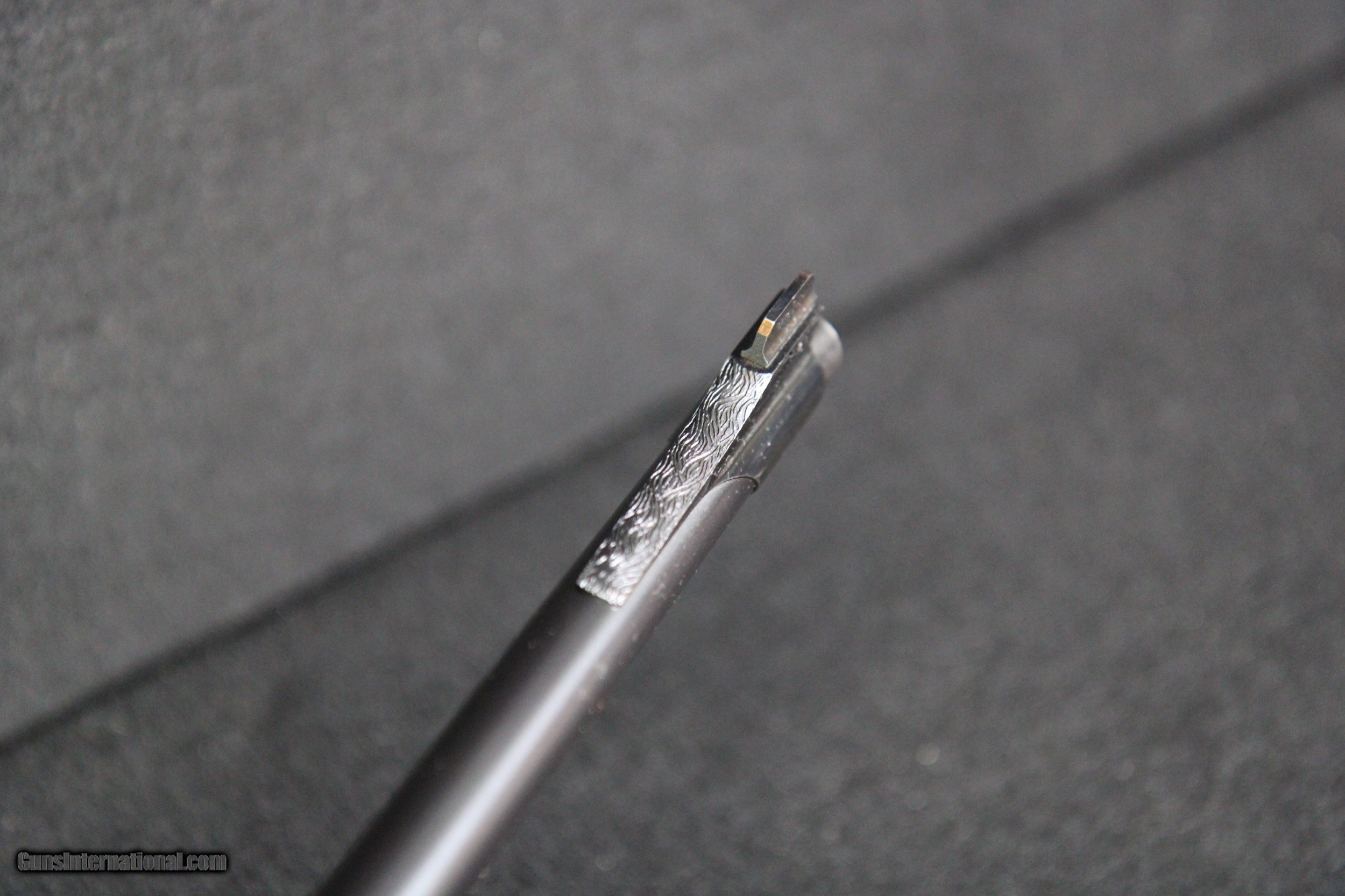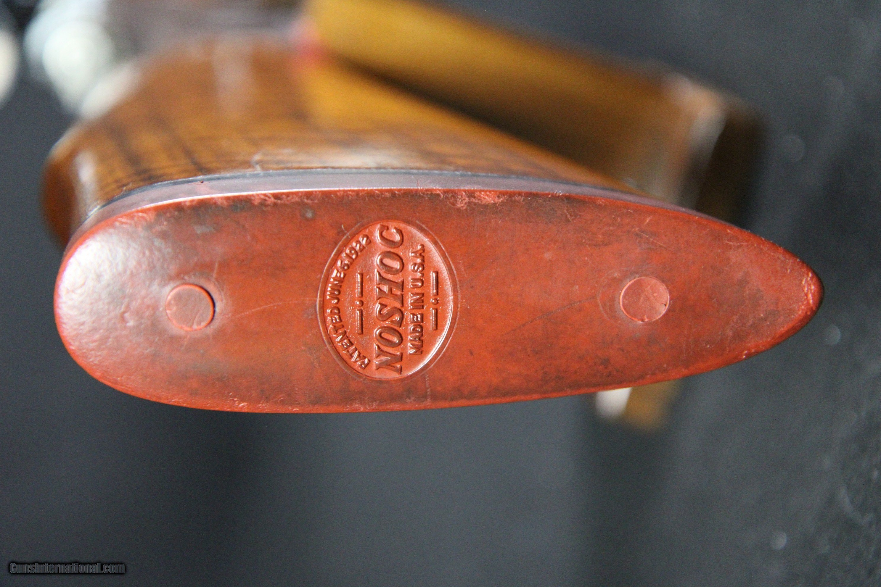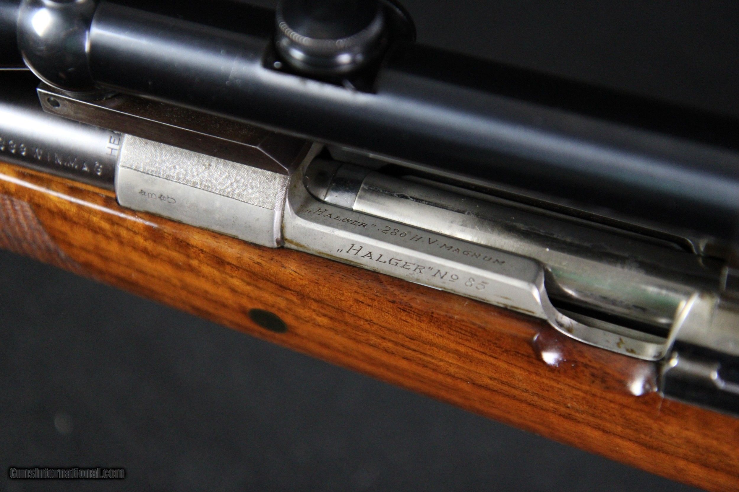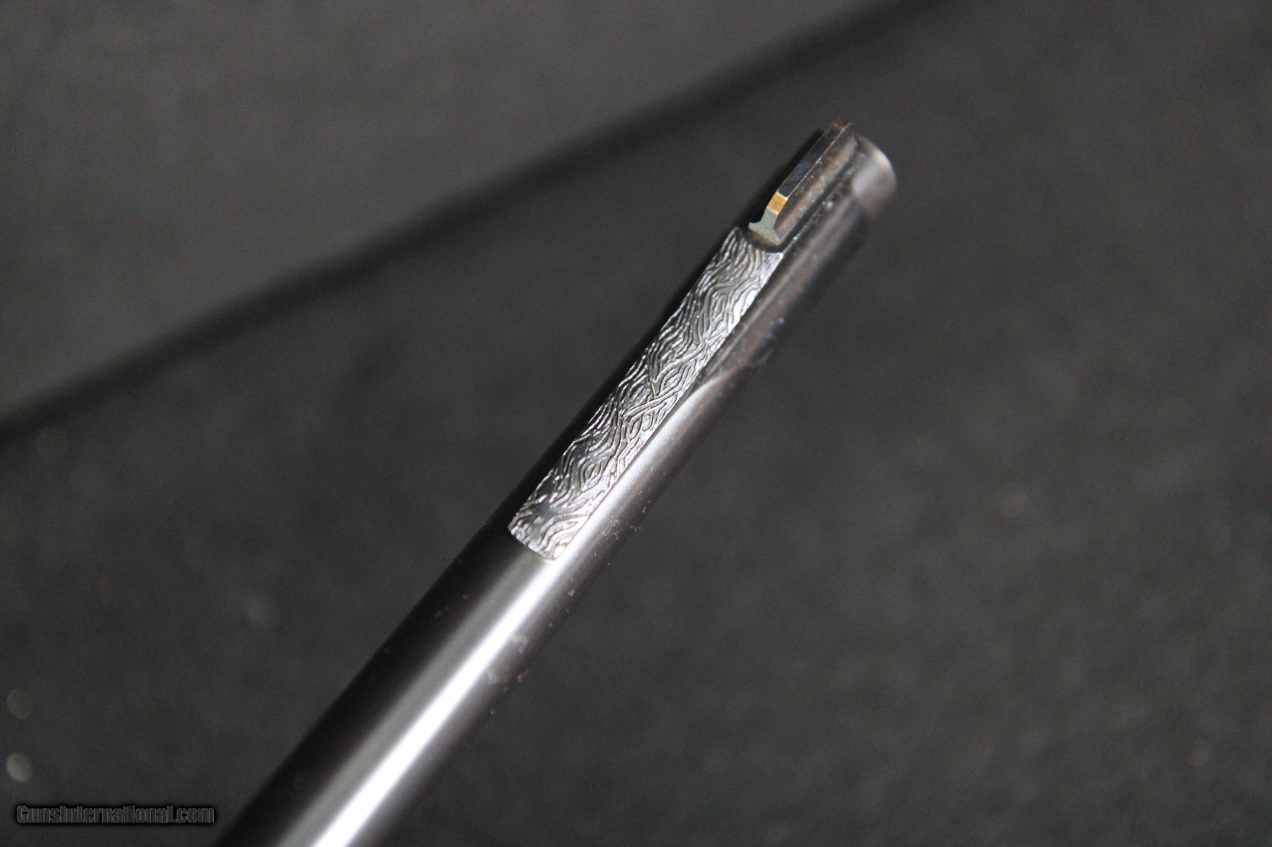 Description: Iver Henricksen was Elmer Keith's favorite gunmaker in the late 1950's and early 1960's and built this .338 Win Mag for Mr. Keith on a Single Square Bridge Magnum Mauser action. Originally built as a Hagler .280 Magnum ( and so marked ) the action and bottom metal of this rifle were color hardened which has since faded to a muted silver color, the Halger single set trigger is still in place and a Buehler scope safety has been fitted. The 24" barrel sports a Redfield barrel band front sight base with Sourdough blade sight, has no rear sight, and has a minty bore and chamber with no erosion in the lengthened throat. Stocked in a nicely fiddlebacked piece of English walnut to Mr. Keiths specifications with a Monte Carlo comb and sloping cheek piece Keith's initial "K" is relief carved into the right checkering pattern, the fore-end terminates in a graceful Schnabel and the butt is finished with a Noshoc pad with a length-of-pull of 13-1/8". The rifle is topped with what appears to be a Weaver K4 scope with Dual Range Reticle in Buehler rings on two piece bases. During Elmer Keith's tenure at "Guns" and "Guns & Ammo" magazines, this rifle was pictured and mentioned numerous times. The rifle also featured prominently in Keith's book "Hell I Was There", particularly in a Bering Sea Polar Bear hunt where it was used quite successfully. A classic sporting big-game rifle formerly the property of an icon in the Firearms writing industry. $15,950.00 SOLD |
