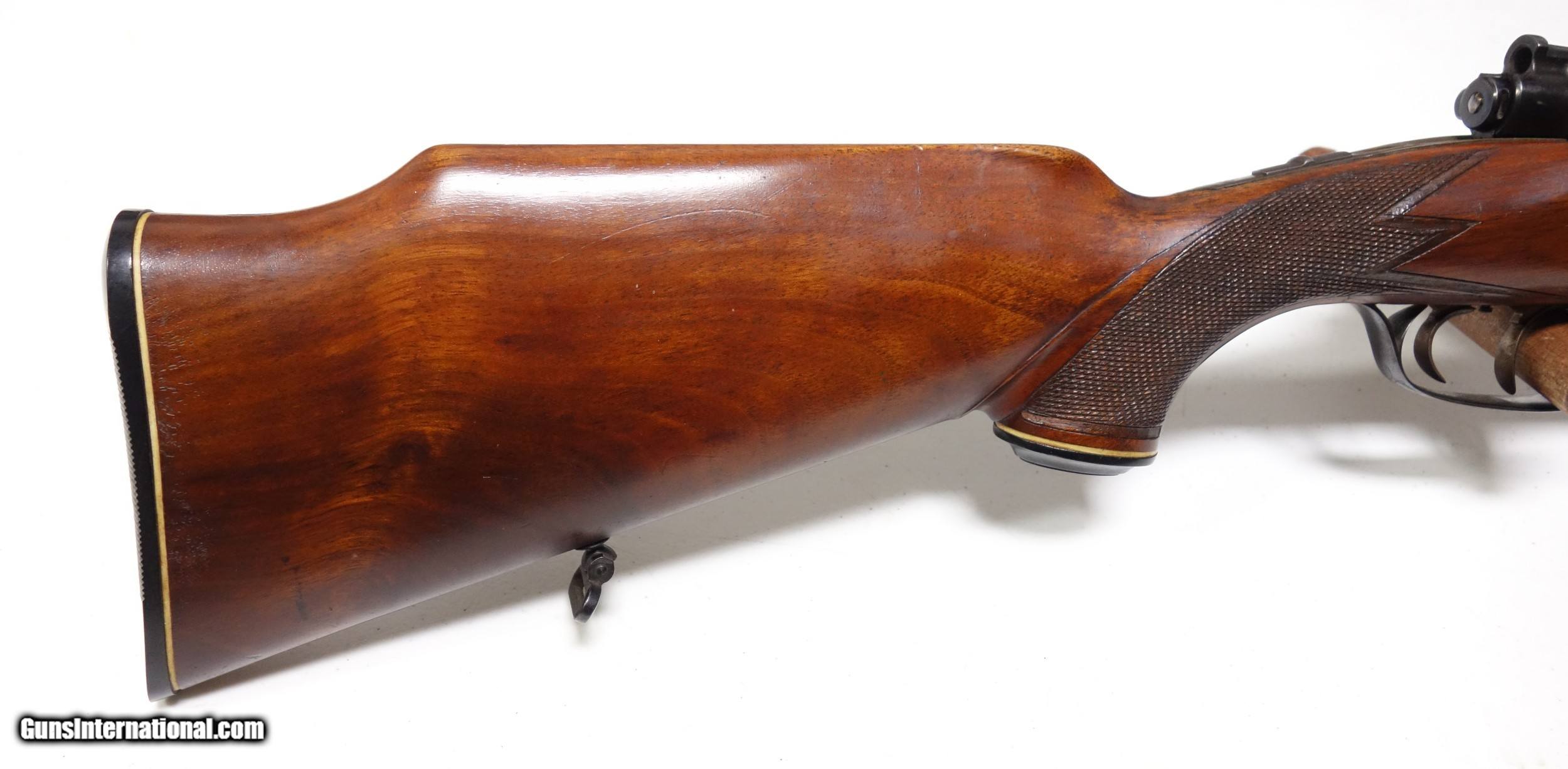 Description: Scarce commercial sporting rifle by Mahrholdt Innsbruck of Austria based on the famed Mauser 98 action. S/N 18312 believed to be manufactured in 1959. The exceptional quality of this rifle is more reminiscent of the Pre War era of fine rifles with many deluxe features such as a half octogon matted rib barrel, horn forend tip, fairly elaborate metal engraving and stock work, jeweled action components, Oberndorf style butter knife bolt handle, and a precision double set trigger. Barrel length is 24" with an excellent bore chambered in a very popular American caliber. All mechanical functions are smooth and working properly. LOP is 14 1/8" from forward trigger. This is a very clean and seldom seen rifle in all original condition rating about 95% overall. SOLD Curio/Relic: Yes |