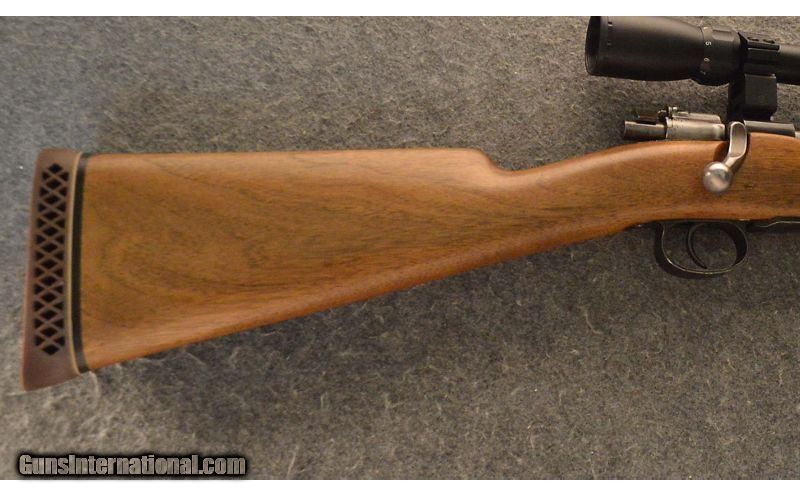 Description: This rifle has the Mauser action, the barrel and stock are aftermarket replacements with some repair work in the stock. 7x57 Mauser SOLD Chambers: Top fed bolt action with a 5 round internal magazine. Metal Condition: Scratches and blue fade. Wood Condition: Several scratches and wood patch repair. Bore Condition: Fair rifling. Barrels: 22" aftermarket barrel. Stock Dimensions: LOP 13 3/4". Fore End: Smooth walnut. Butt Pad: Pachmayr white line. Weight: 7.7 lbs. Sights: 3 x 9 x 40 scope. Item Location: Sidney, NE |
