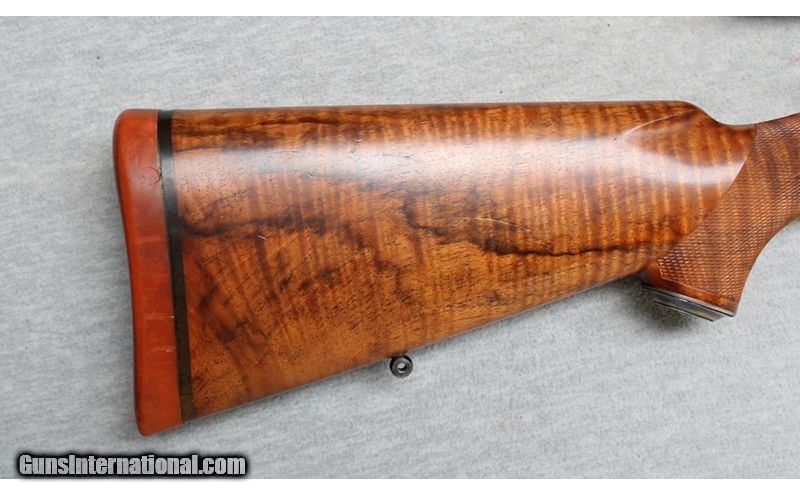Description: Receiver manufactured in Germany and subsequently upgraded by Mckinley Verne Highsmith of Memphis, Tennessee. The barrel is fitted with ramped beaded blade front and express rear sights, as well as having a scope base mounted to the chamber. The barrel is marked "M. HIGHSMITH MAKER, MEMPHIS, TENN. The action has a matted flat on the front ring and integral scope base on the bridge, and double set triggers. It is topped off with a Zeiss Diavari-Z 1.5-6x42 scope. Mounted in a wonderfully figured multi-point checkered walnut stock with rosewood forend cap, blued steel grip cap, and red solid rubber recoil pad. 7mm Remington Magnum SOLD Metal Condition: Excellent Wood Condition: Beautiful grained walnut with fine checkering and a few handling marks Bore Condition: Bright Barrels: 23 Inches Triggers: Double set trigger Stock Dimensions: LOP 14 1/4 Inches Fore End: Checkered walnut with Rose wood cap Butt Pad: Soild rubber pad Sights: Zeiss Diavari-Z 1.5-6x42 scope Item Location: La Vista, NE |