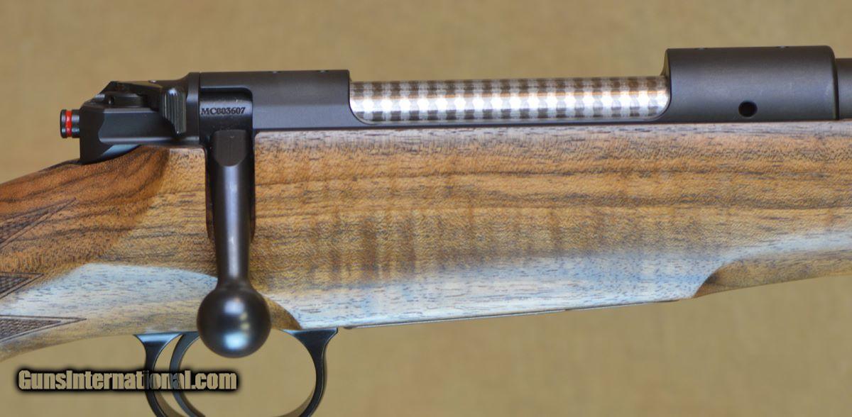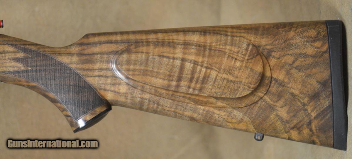 Description: New Mauser Model 12 "Expert" Hunting rifle chambered in .300 Win-Mag; factory 25" barrel, threaded for muzzle brake (includes thread protector). Outstanding factory upgraded Grade 5 walnut stock with shadowline cheek rest and ebony forearm tip and grip cap. Action is tapped and drilled for bases (not included). Includes factory box. SOLD |