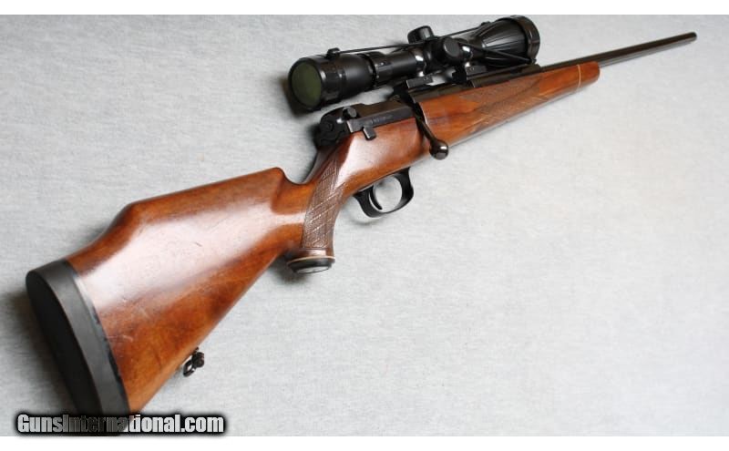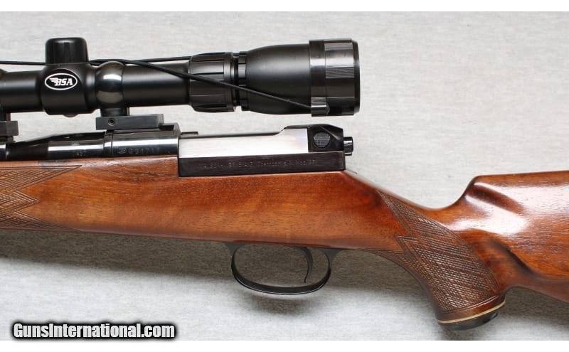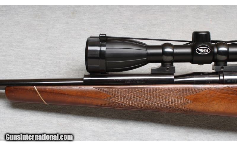 Description: Excellent condition, light wear, small nicks and scratches. Classic Mauser bolt action rifle, 24" barrel, blued metal, smooth action and crisp trigger. Checkered hardwood stock with RH cheekrest and contrasting forend tip & grip cap. BSA 3-9x scope and Decelerator recoil pad installed. 7x57 Mauser SOLD Chambers: Bolt action Metal Condition: Excellent Wood Condition: Excellent Bore Condition: Bright Barrels: 24 Triggers: Factory Stock Dimensions: 13 1/2" LOP Fore End: Checkered Butt Pad: Decelerator pad Sights: BSA 3-9x scope Item Location: La Vista, NE |