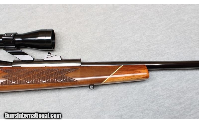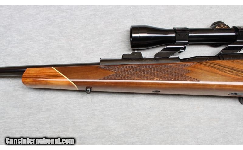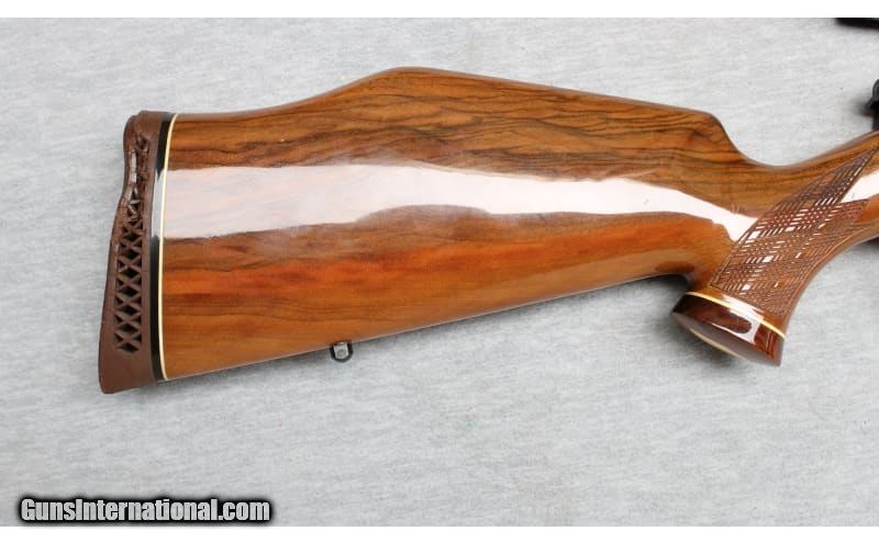 Description: Mauser Model 660 chambered in .270 Winchester. This unique action, Short Breech Telescoping Slide Action, was designed to use interchangeable barrels to change calibers. There is a cross pin safety at the rear of the action and an internal magazine that holds 3 cartridges. A 4 power Redfield scope is mounted on see-through rings that allow use of the iron sights. The beautifully grained European Walnut Monte Carlo stock with cheekpiece has a Rosewood cap on the pistol grip and a Rosewood tip on the forearm. It has hand skip-line checkering on the pistol grip and the forearm. The Length of Pull is 14 inches. The rubber pad is deformed and hard and with that exception this rare and beautiful rifle is in outstanding condition with only very minor handling marks. .270 Winchester SOLD Metal Condition: Excellent Wood Condition: Excellent Bore Condition: Bright Barrels: 23 inches Triggers: Factory Stock Dimensions: LOP 14 inches Fore End: Checkered walnut Butt Pad: Rubber pad Sights: Redfield 4x and adjustable iron sights Item Location: La Vista, NE |