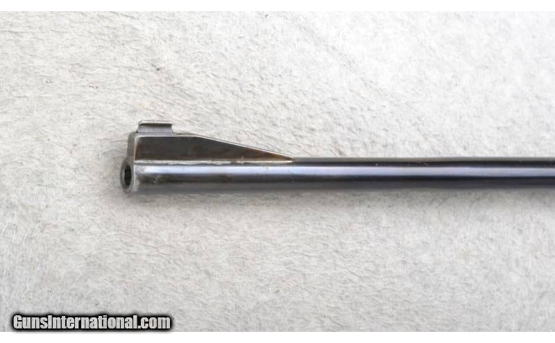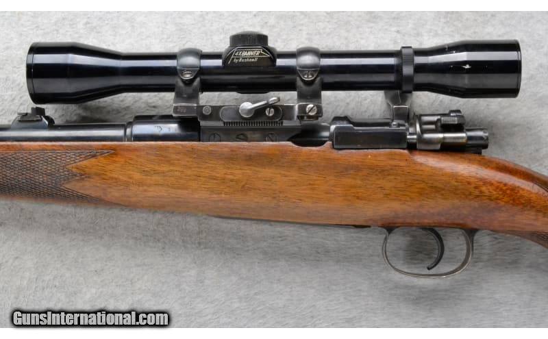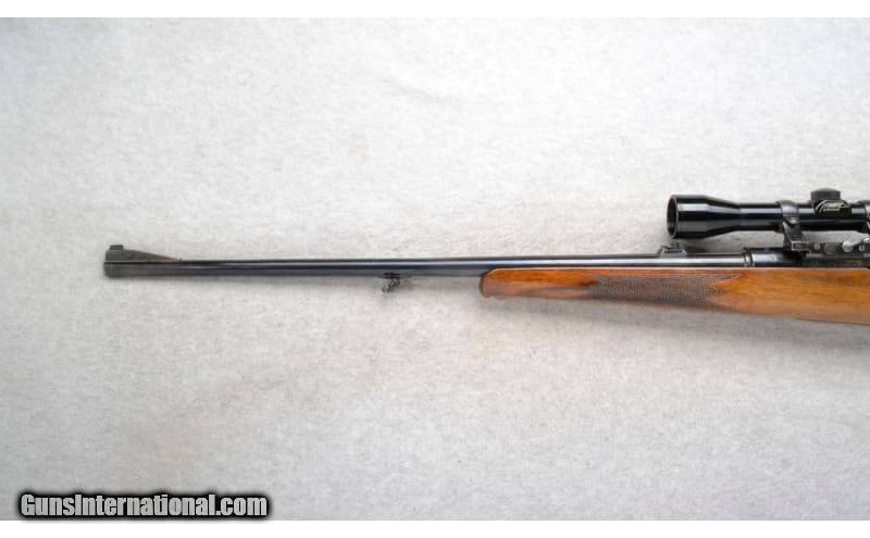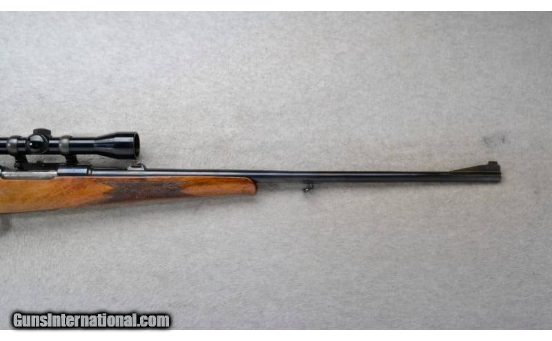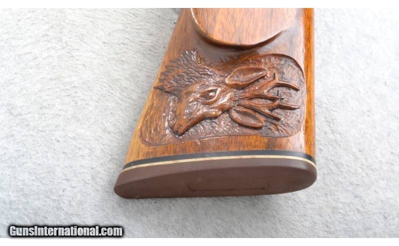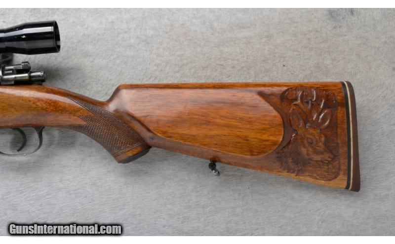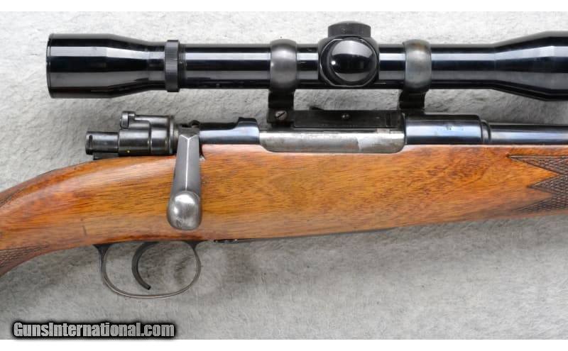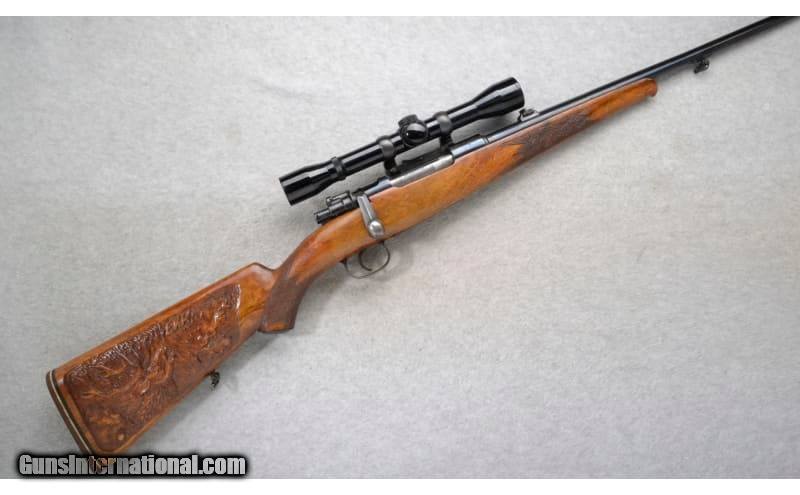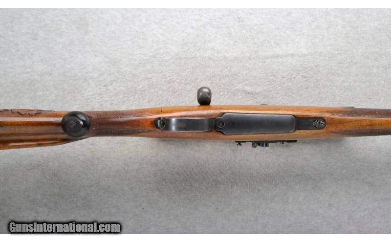 Description: This Mauser Model S/42 is a right hand bolt action rifle in 8mm Mauser Cal. It has a 24 inch barrel. A raised blade front sight and two position notch middle sight. It is outfitted with a Bushnell Banner Scope. The butt stock is a checkered grip walnut pistol grip with a raised cheekpiece. It has very nicely carved elk and deer on the sides. The forearm is a checkered grip walnut Schnabel style. S/N 3055E. 8mm Mauser SOLD Chambers: Internal magazine. Metal Condition: Fair. Light handling/use marks and minor freckling. Wood Condition: Good. Light handling marks. Bore Condition: Excellent. Barrels: 24 inch. Stock Dimensions: LOP 14 3/4 inches. Fore End: Checkered grip walnut Schnabel style. Butt Pad: Pachmayr White Line rubber recoil pad. Weight: 8 lb. 2 oz. Sights: Raised blade front. Two position notch middle. Bushnell Banner 4X Scope. Item Location: Richfield, WI |