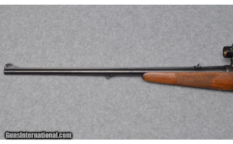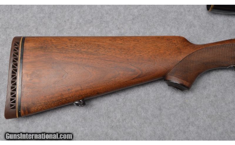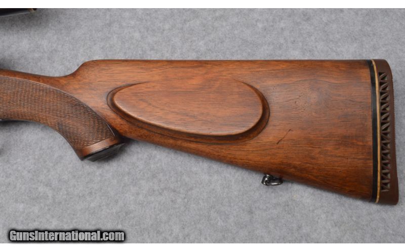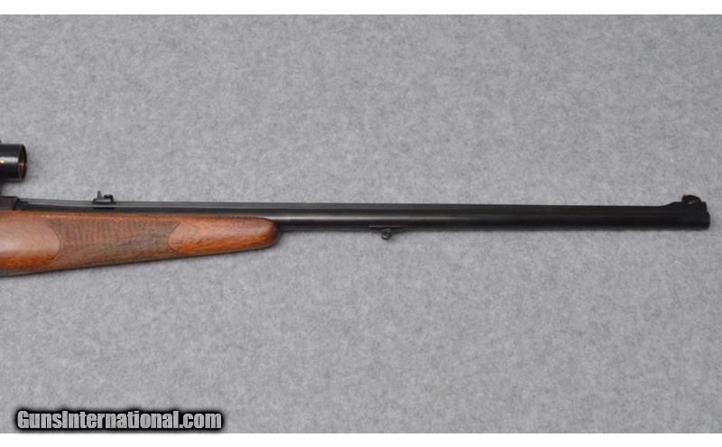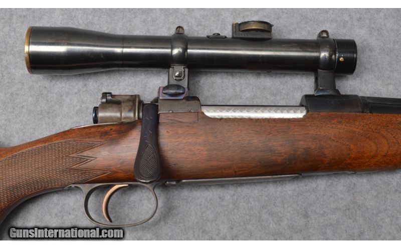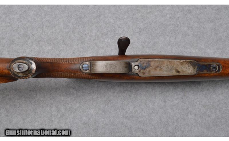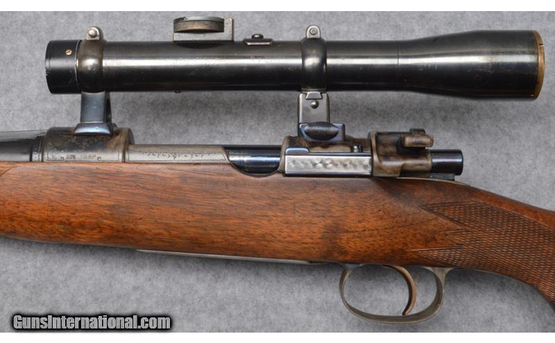 Description: This is a nice 1920's sporter rifle built on a Mauser action. The maker is unknown. The barrel is nicely blued with a solid rib and express sights. The action is color case hardened and has some scroll engraving. The bolt is fire blued and the extractor is jeweled. This nice rifle comes with a fixed power scope which looks period correct but there are no markings. 8MM Mauser SOLD Chambers: Bolt action repeater. Metal Condition: Excellent. Wood Condition: Very good with some light handling and use marks. Barrels: 22.5" blued with solid rib. Triggers: Gold plated trigger with wear. Stock Dimensions: 14" length of pull. Fore End: Matching checkered walnut fore end. Butt Pad: Brown rubber ventilated type. Sights: Blade front with brass bead, express rear sight. Also comes with a scope which has no markings. Item Location: West Chester, OH |