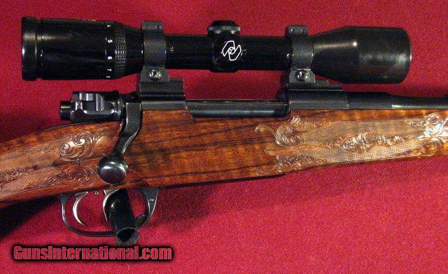 Description: Full custom 7x57 Mauser by Joe Rundell on a 1934 Commercial Oberndorf Mauser sporting action. This fine firearm has a 22" barrel with banded ramp front sight, barrel band sling swivel stud, and island ramp rear sight with one standing and one folding leaves. Action features double set triggers, cusom bolt handle, three position side swing safety, and custom square bridge style scope mount bases with Talley rings mounting a German Zeiss Diavari-C 3x9 scope with Duplex reticle. Stocked in a very nice piece of Turkish Walnut with strong fiddleback figure. Ebony schnauble forend tip. Shadow line pancake cheekpiece. Fisher steel grip cap. Checkered at 32 LPI with tasteful border carving. 13 3/4" LOP over a 1/2" Old English pad. A very neat cartridge trap in the buttstock. Weighs in at 9lb 8oz as scoped. This piece remains as new from the maker. The rear sight has not been filed in. Mr. Rundell is a Detroit machinest, gunmaker, stock carver, and engraver who late in his career did a series of life size sculptures of the automotive industry pioneers for the city of Flint, Michigan. His work has been extensively featured in The Gun Digest. He is a true Renaissance Man who can very capably accomplish all aspects of custom gun building. SOLD |