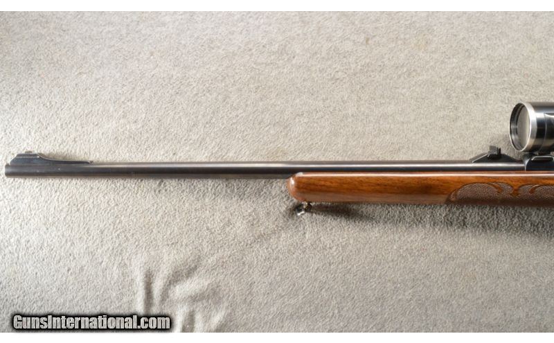 Description: Marked "WAFFEN DSCHULNIGG SALZBURG, AUSTRIA" on top of the barrel with ramped beaded blade front and 1standing and 1 folding rear along with a Pecar of Berlin 4-10 power rifle scope with QD scope mounts. The receiver has afully engravedring with wedges of fine decorative scroll, polished bolt with an engraved bolt handle, and double set triggers. The floorplate is engraved with a EuropeanRed Stagin a wooded scene and the trigger guard has a Roe deer. The rifle has a carved and checkered walnut stock with a raised cheek-piece. This is a very nice looking rifle with fine set triggers. .30-06 Springfield SOLD Caliber Info: .30-06 Sprg. Chambers: Bolt action repeater. Metal Condition: Excellent. Wood Condition: Excellent. Barrels: 24 inch blue with factory sights. Triggers: Adjustable double set triggers. Stock Dimensions: 14 3/8 inch LOP to the front trigger. Fore End: Matching carved and checkered walnut with a sling mount. Butt Pad: Curved black rubber vented butt pad. Sights: Ramped beaded blade front and1standing and 1 folding rear along with a Pecar of Berlin 4-10 power rifle scope with QD scope mounts. Item Location: Owatonna, MN |