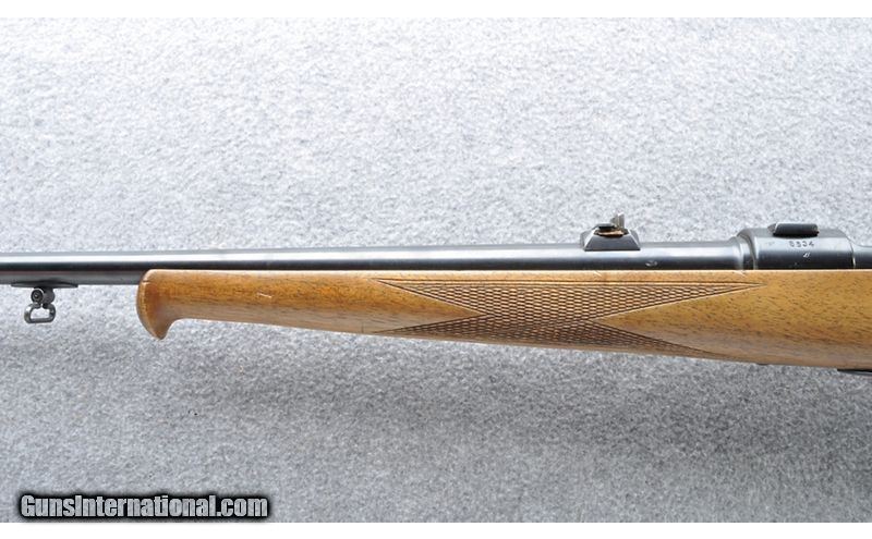 Description: This 98 Mauser was sporterized and refurbished by Waffen Weiss of Frankfurt Germany sometime post WW II. The receiver still shows a Waffenamt stamp 8x57mm Mauser SOLD Chambers: 8X57mm Mauser in a fixed box magazine five rounds Metal Condition: "Very good, shows little wear Wood Condition: Good. Shows very few marks Bore Condition: Bright with sharp rifling Barrels: 23 1/2" with sling swivel Triggers: Double set triggers Stock Dimensions: 14 1/2" LOP Fore End: Checkered with Schnabel fore end tip Butt Pad: Appears to be a micarta butt plate the grip cap appears to be the same material Weight: 6 Lbs. 12 Oz. Sights: "Ramped fixed blade front, Flip-up two leaf express rear, fitted with claw type scope mounts Item Location: Grand Junction, CO |
