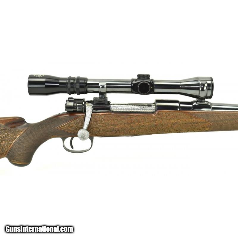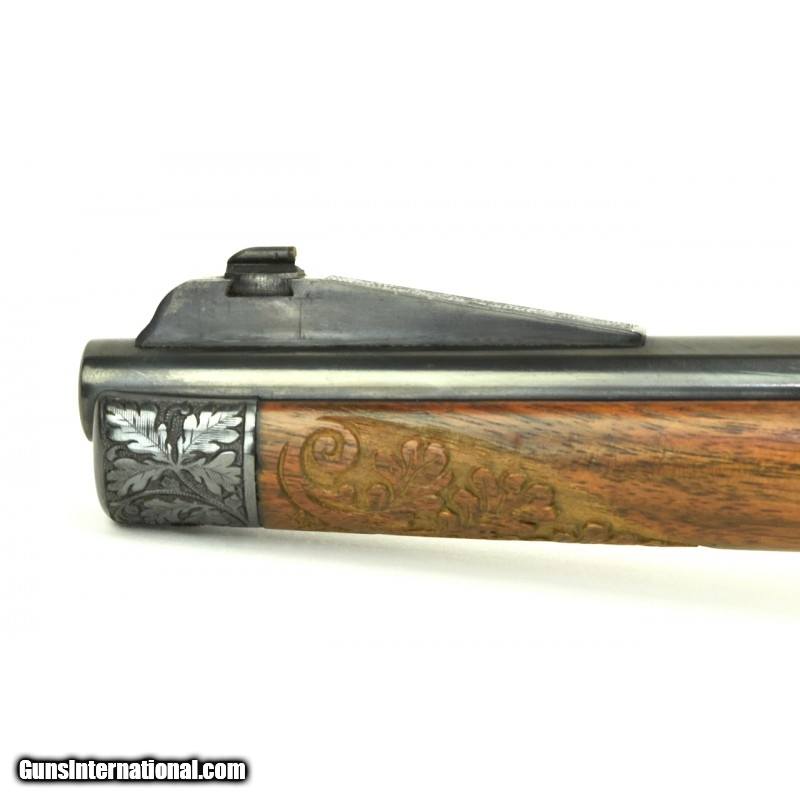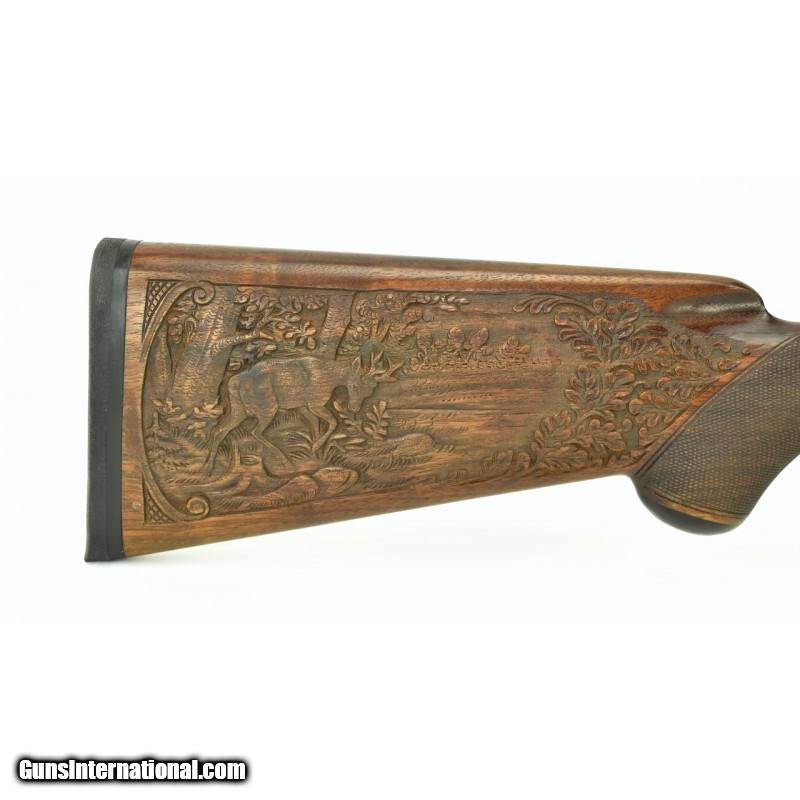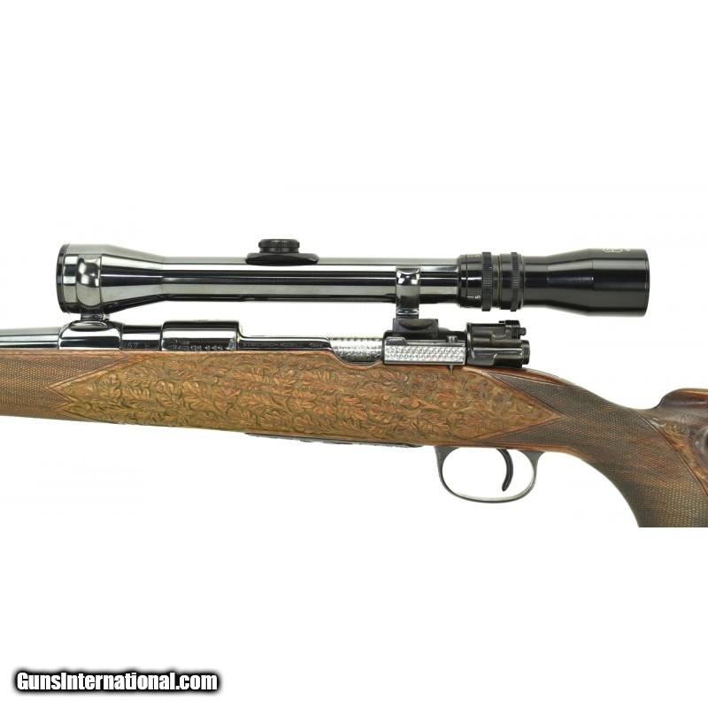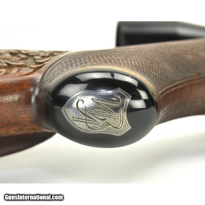 Description: "Mauser 1924 .257 Roberts Custom Sporter. Outstanding custom full stock “Mannlicher" style carbine made by well-known German gunmakers Waffen Reich in Darmstadt, built on a Standard Modell Mauser rifle. The gun is heavily and ornately customized. The bolt handle is oak leaf engraved and checkered, while the bolt and bolt release are jeweled. The floor plate is oak leaf engraved with a silver stag inlay. The stock is elaborately carved with oak leaves and has a carved game scene on the buttstock. A German made Pecar 3x7 scope is mounted on claw mounts, with excellent optics. Overall condition is excellent, as is the bore. A gorgeous example of old world German artistry. SOLD |