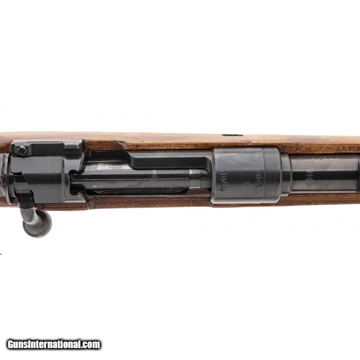 SN 72458. Bolt-action military rifle made in occupied Czechoslovakia in 1944. No import mark. Non-matching bolt with plum-colored extractor. Wood and metal have been refinished/reblued. Correct buttplate, which has been cleaned. Bore has bright lands and dark rifling. Comes with reproduction leather sling.