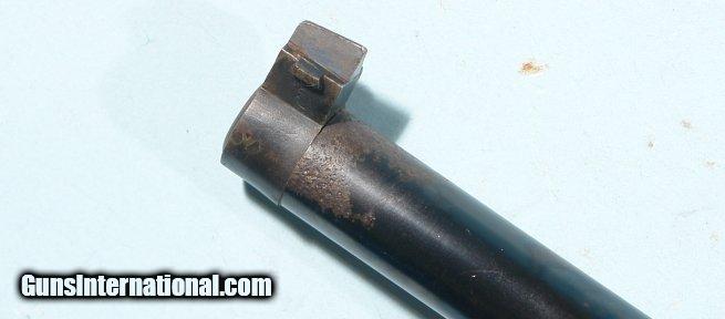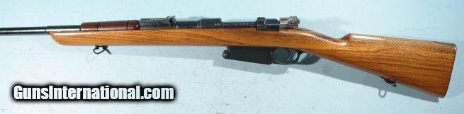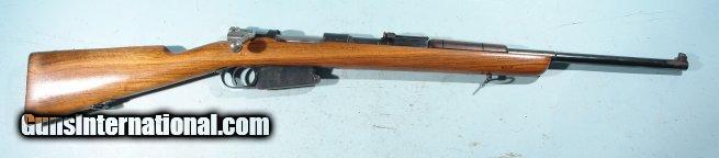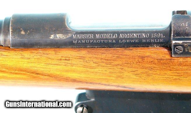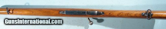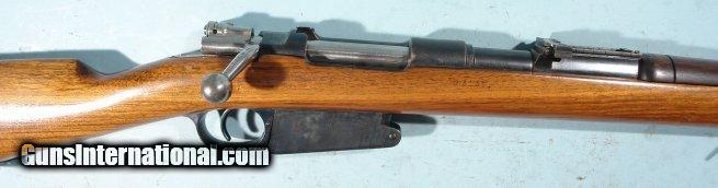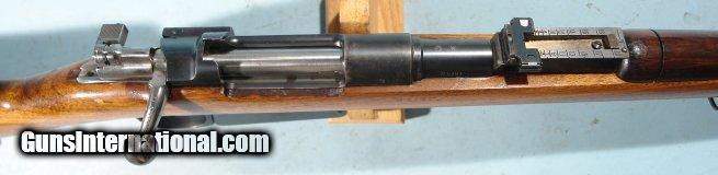 Description: ANTIQUE ARGENTINE MAUSER MODEL 1891 LUDWIG LOEWE 7.65X53 MONTGOMERY WARD CUTDOWN RIFLE OR CARBINE. Early B prefix 4-digit serial number. Montgomery Ward imported these in the late '50's and early 60's so no import marks. As a result the crests were ground off by Argentina before exporting. Once in country the bolts were turned down a little and length shortened to around 23" barrel length. Often some parts or stocks were mixed and matched to make presentable rifles. This one has all the original matching parts to the gun except the stock which is incredible because the inletting is so tight like a custom stock job. Beautiful European walnut with original stock finish and only a few tiny storage checks that should lift. All markings on metal parts including screws crisp and matching. Built like a watch(typical Berlin craftsmanship), perfect working order and mint bore. Some salt and pepper about front sight should clean to nil. Would make a great shooter for no money. SOLD Antique: Yes |