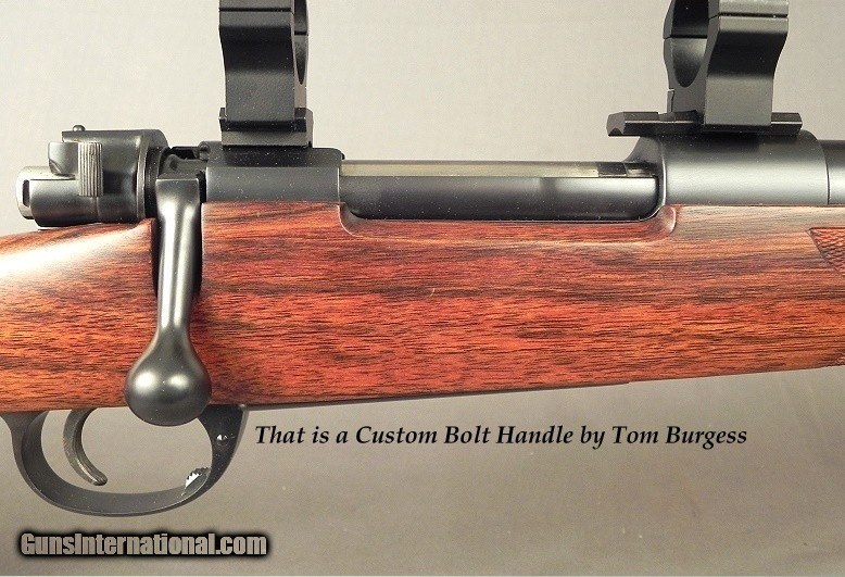 Description: Mauser 6.5 x 55 Custom 98 Mauser that has Excellent Metal Work with some by Tom Burgess, 22" Krieger Barrel with a 1 in 8" Twist Installed by Roger Ferrell from Fayetteville, Georgia, Mr. Ferrrell is a top notch custom gun maker that stands with the best, Timeny trigger, 2 position wing safety, I am uncertain how much metal work was done by Tom Burgess but I can assure you he did the bolt handle, Excellent bottom metal with a straddle hinged floorplate with a center bow release, Warne scope bases with 30mm Warne rings, A nice custom stock by an unknown stocker using a decent of wood, A Classic stock with a nice shadowline cheekpiece, Jerry Fisher steel grip cap, Ebony forend tip, Wrap around checkering with a Fleur-De-Lis pattern that is very well done, Custom sling eyes, 13 3/4" lop over a Niedner checkered steel buttplate, 7 lbs. 15 oz., The bore is new, The overall condition on both metal and wood is 99% plus since built as a custom. The gun has no appearance it ever left the house. I can assure you this was not the stocker's first attempt at custom stocking a bolt rifle. It has nice workmanship along with the classic lines of what an American classic styled bolt rifle is all about. The internal inletting is well done with the barrel channel, recoil lug and rear guard screw all glass bedded. The piece has very nice checkering and very nice attention to detail. SOLD Rifle Caliber: 6.5x55mm Swedish |