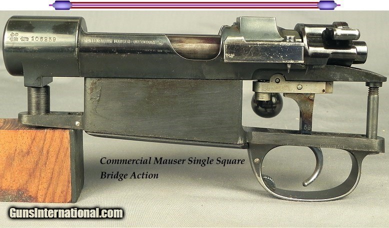 Description: #106259, Waffenfabrik Mauser - Oberndorf a/n: A Commercial Mauser Single Square Bridge Sporter Action in Standard Length, Made in 1930 and was the action for a 9.3 x 62 Model B Commercial Sporter Rifle ordered by Charles Heyer in Nairobi, Bolt face for standard cartridges like 7x57 - 30-06 etc., Not drilled or tapped on top or for any side mount, Magazine box with a center bow release for a hinged floorplate; All serial numbers match on the receiver, bolt, trigger, bolt stop, safety, floorplate, cocking piece, bolt sleeve and extractor, This action remains totally original except the top of the square bridge was polished without any dimension change, It is in excellent condition, The original blue still remains at 88%, The bolt face looks like the day it left the banks of the Neckar River 89 years ago. Jon Speed, the author of the famous Mauser book has this #106259 listed on record as going to Chas. A. Heyer & Co. in Nairobi. He was an importer for Mauser Rifles into British and German East Africa. SOLD Curio/Relic: Yes |