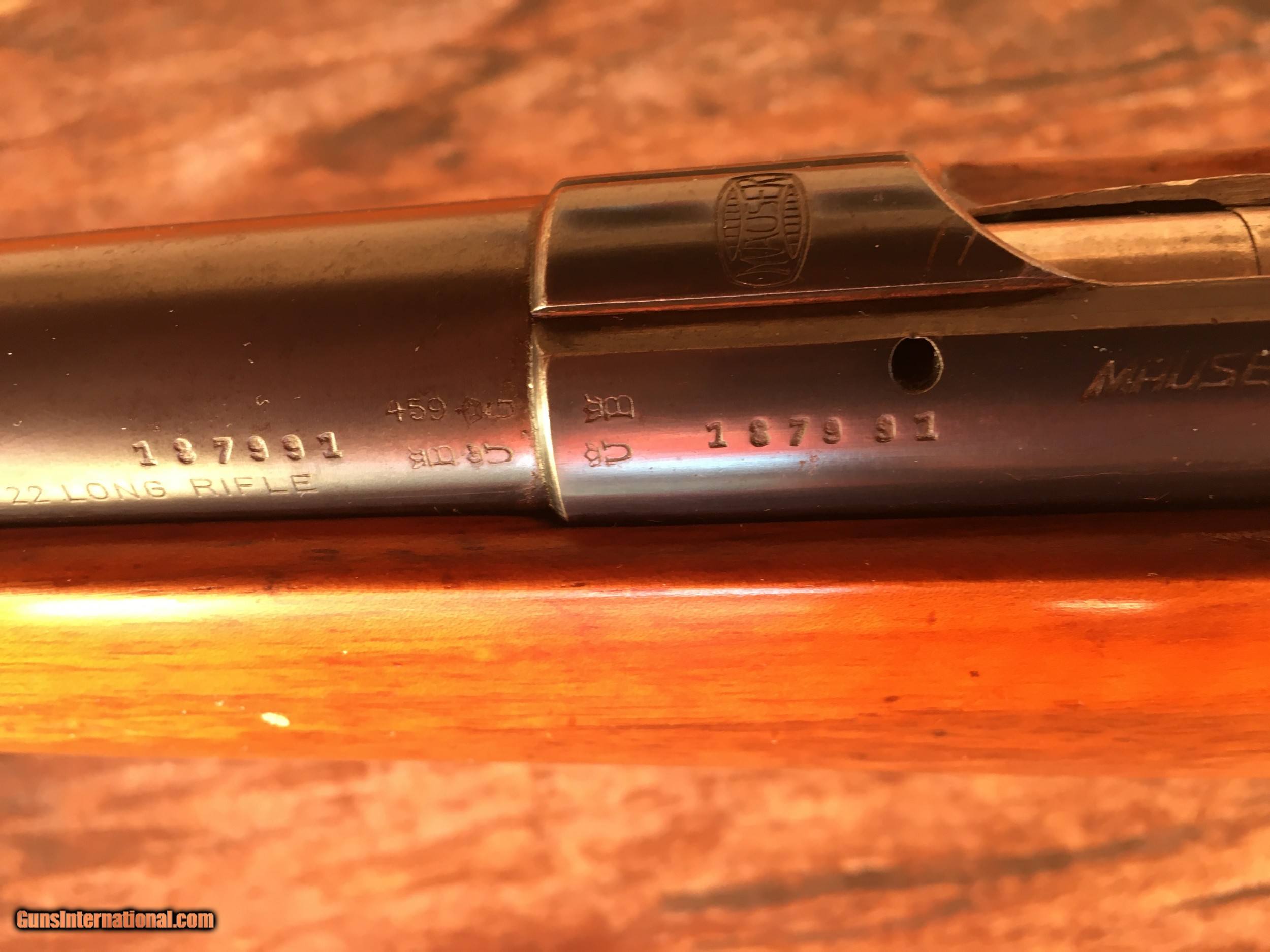 Description: Mauser Model Patrone - .22 LR . Single Shot Training / Sporting Rifle - Smooth Mauser walnut golden honey colored stock with sling swivels and Mauser Cartouche on the right side. Mauser stamped metal butt plate in very good condition. 26 in. long barrel with A.G. Oberndorf A.N. and D.R.P. DRG.M stamped, with matching serial numbers on barrel, receiver and stock. Military style target rear sight adj. for windage and elevation from 30 to 200 meters and a fixed inverted front sight. Receiver grooved for scope. Milled trigger guard with checkering on the bow to aid in off hand shooting. Bore is clean and bright. Barrel and receiver are retaining approx. 80 - 85 % bluing. Stock is solid no cracks or dents, does have a number of small handling marks. Manufactured circa 1938 . Used as both a military training rifle as well as a civilian sporting rifle. Overall condition is very good . Nice addition to any collection. All of our rifles have been cleaned and lubricated. We can ship to C&R holders or to your FFL dealer at a flat rate of $50.00 S&I to lower 48 states. SOLD Curio/Relic: Yes Rifle Caliber: .22 Long Rifle Manufacturer: Mauser Model: Patrone Serial Number: 187991 Barrel Length: 26 in. Condition: Very Good Butt Pad: Metal / Mauser Weight: 7 Sights: Military style Engraving: Mauser / Cartouche |