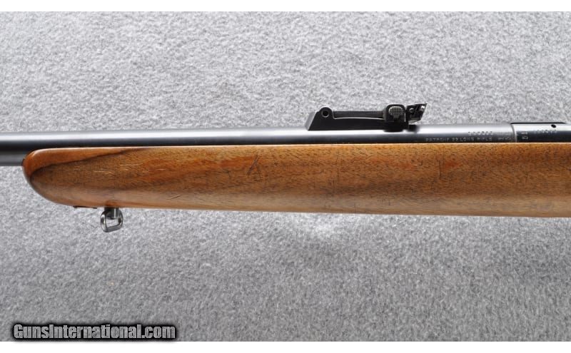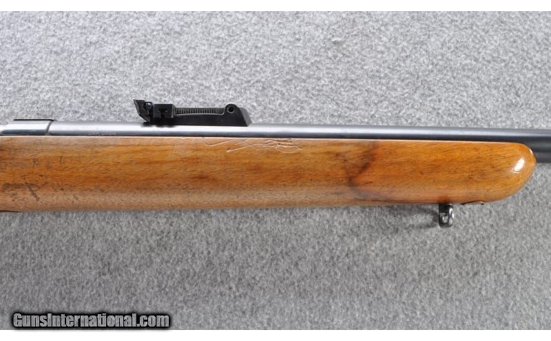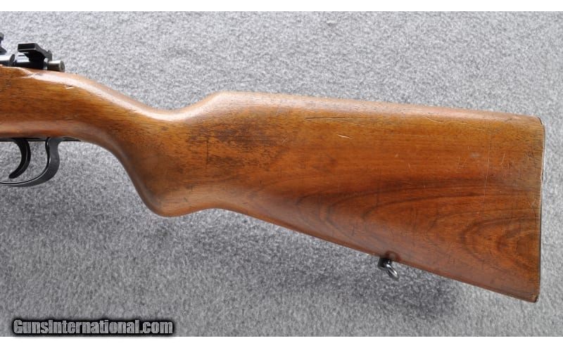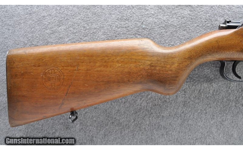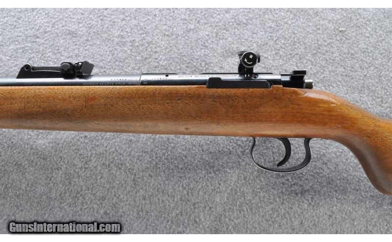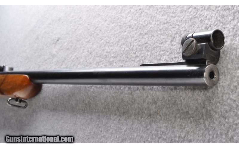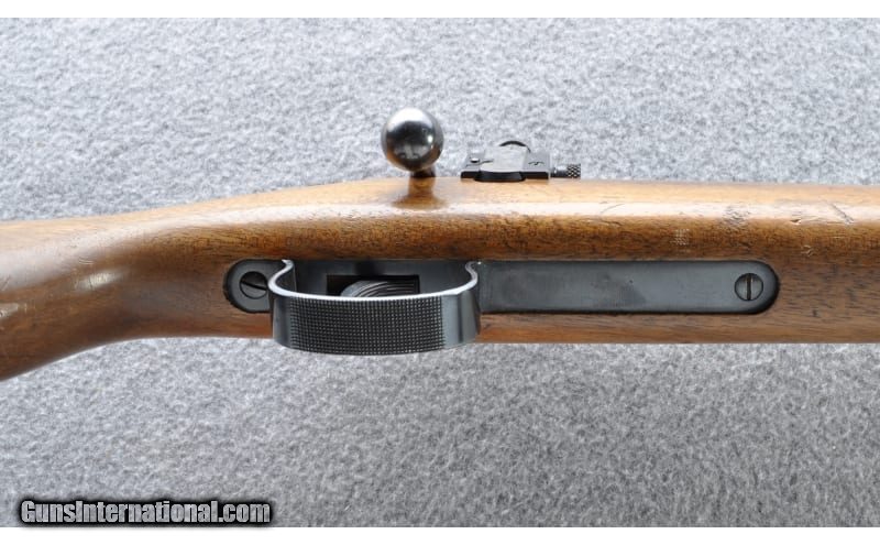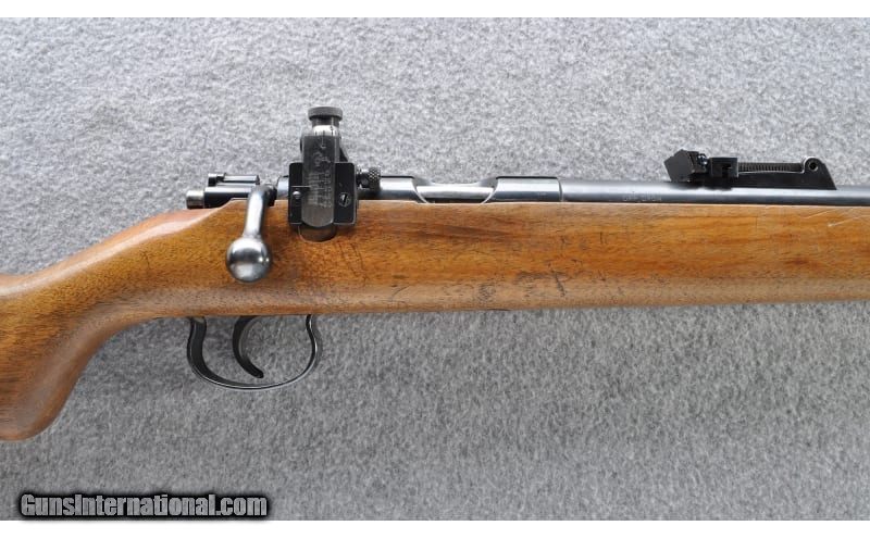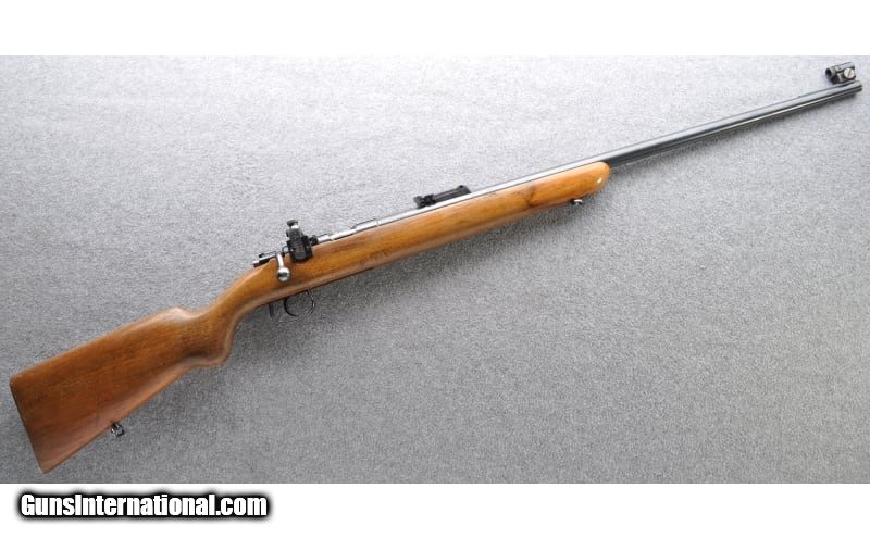 Description: The Mauser ES340B is one of a series of rimfire rifles made at the Oberndorf plant in Germany. This one was manufactured before World War II about 1937. All numbers matching, and exhibits excellent pre-war build quality. These rifles were used at shooting clubs and for training. This one has a brass rack tag attached in front of the fore end swivel #4 .22 Long Rifle SOLD Chambers: .22 Long Rifle Single-Shot Bolt Action Metal Condition: "Good, showing light blue wear at the muzzle, sharp edges and some rust spots at the butt plate Wood Condition: "Good, various compression creases and dents, with a noticeable gouge on the right side of the fore end near the leaf sight. Mauser logo is stamped on the right side of the butt stock Bore Condition: Bore is bright & sharp Barrels: 26.8" heavy contour Triggers: Match Grade Stock Dimensions: 14" LOP Fore End: Plain semi-beavertail with sling swivel and rack tag #4 Butt Pad: Metal with Mauser logo Weight: 8 Lbs. 4 Oz. Sights: "Globe front with insert, tangent leaf rear & a Lyman receiver aperture with target knobs. Receiver is grooved for scope mounting. Item Location: Grand Junction, CO |