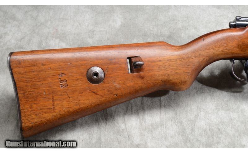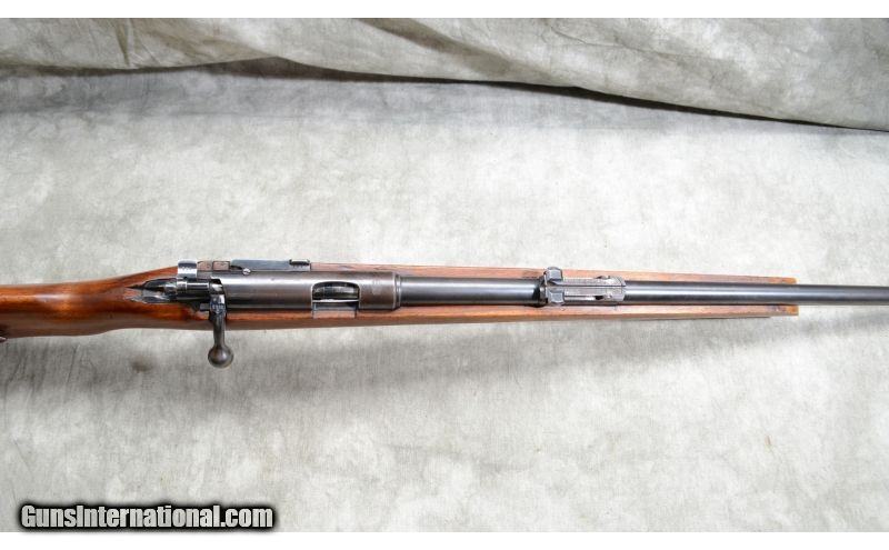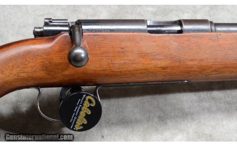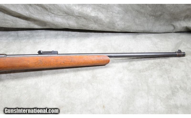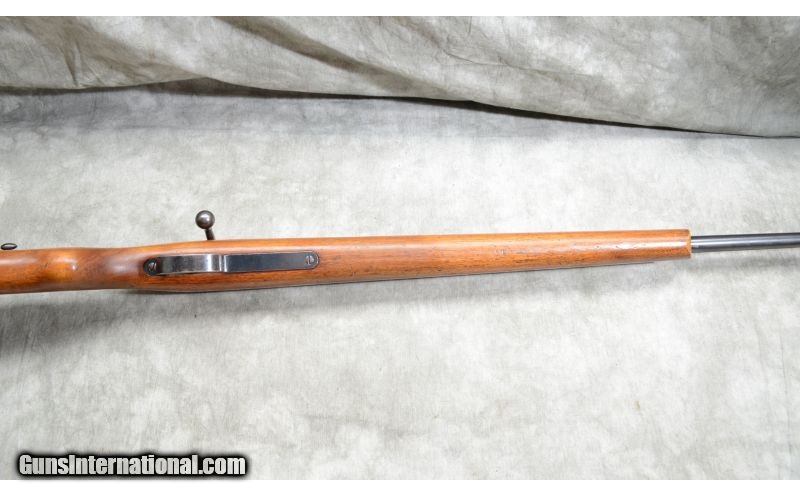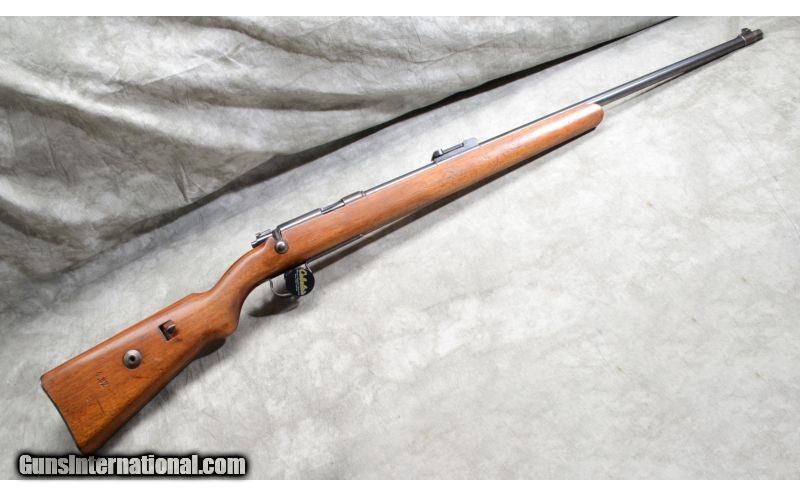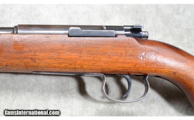 Description: This single shot bolt action features 26 inch blue barrel with post and ladder style open sights with calibrations from 25 to 200 meters. Most of the blue remains on the metal parts and the stock retains many cartouches. It has matching s/n's on barrel, receiver, and bolt. SOLD Caliber Info: .22 Long Rifle. Chambers: Single shot bolt action. Metal Condition: Good. Blue is faded a bit and there are a number of shallow scratches and pits. Wood Condition: Good. The cartouches are intact but there are a large number of shallow scratches and dents. Bore Condition: Shiny and bright with good rifling. Barrels: 26 Inch - blue. Triggers: Factory trigger. Stock: Pistol grip hardwood with plain but nice grain. Stock Dimensions: 12 -3/4 Inch LOP. Butt Pad: Slightly curved steel plate. Weight: 6 lb. - 15 oz. Sights: Post and ladder style rear sights with calibrations from 25 to 200 meters. Item Location: Rogers,, MN |