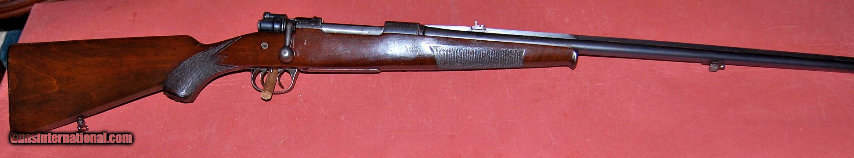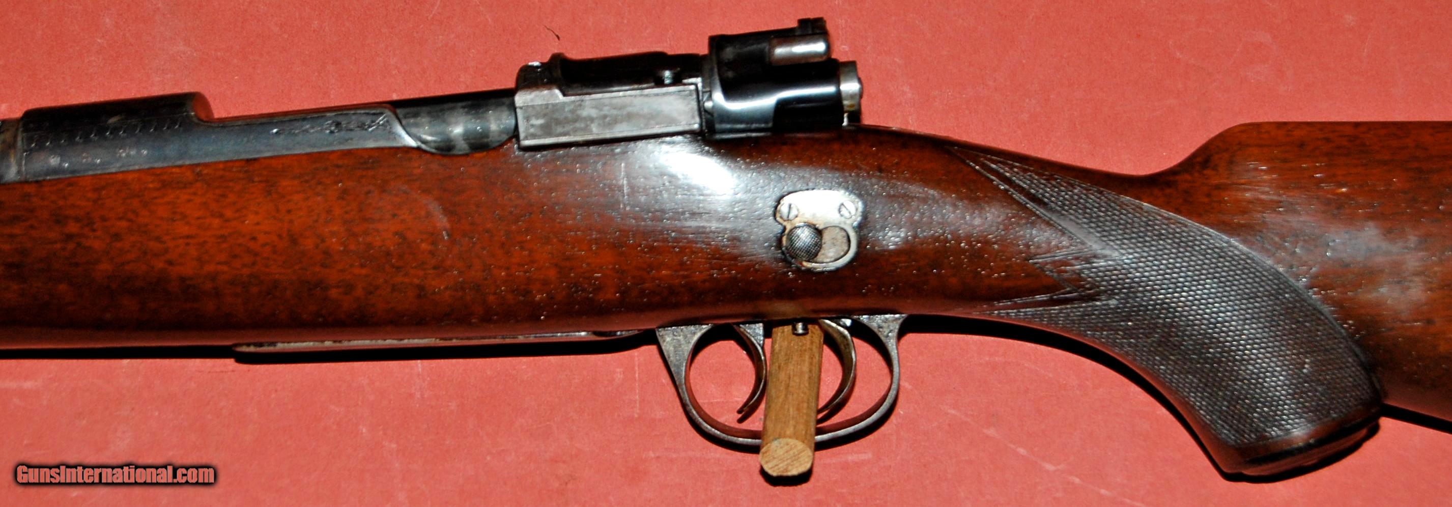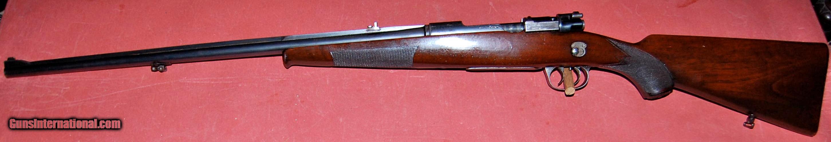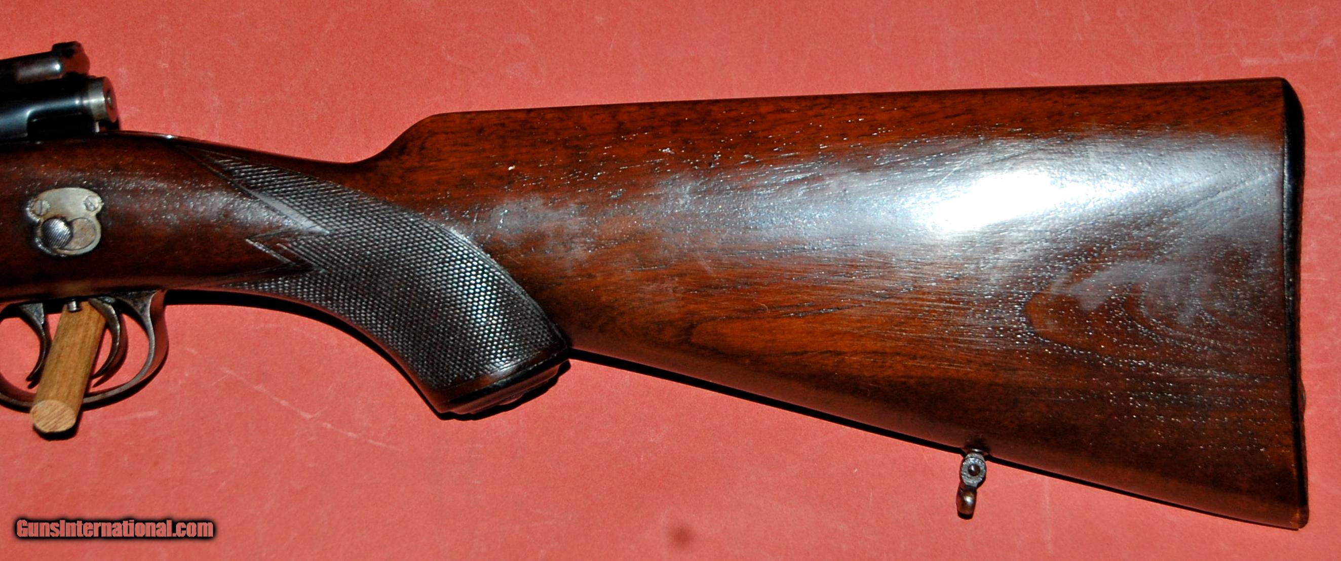 Description: Mauser action pre war stalking rifle built for Edwuard Kettner sporting goods.This fine rifle has a full length integral solid rib on a 24" barrel.It is chambered in 30-06.The rifle has several quality features including double set triggers,double safety,one stading ne folding express sight,sling swivels,scroll engraving,and a horn buttplate.The bore is mint and sharp.The receiver has not been drilled for a scope.This is a very nice all original pre war rifle with all the classic features in a U.S. caliber.C&R eligible. SOLD Curio/Relic: Yes Manufacturer: built for Edwuard Kettner Inc. Model: Sporter Caliber Info: 30-06 Metal Condition: excellent Wood Condition: excellent Bore Condition: mint Action: bolt Triggers: double set Rib: full length integral Sights: express |