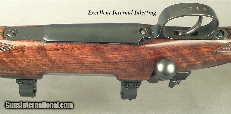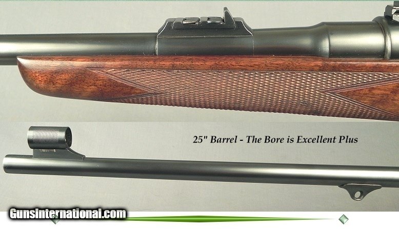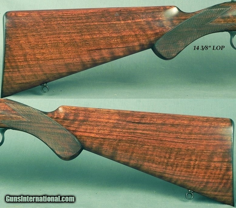 Description: #5959, John Rigby & Co. 43 Sackville St. London W: A John Rigby Intermediate Mauser Action in 275 Rigby (7x57 Mauser) built in 1951, 25" barrel with a band island rear sight with 1 standing & 2 folding rear sights, Front ramp with a sight protector, Barrel sling eye, Talley quick detachable lever bases and 1" rings, Mauser Action, Modern bolt sleeve with a 3-position Model 70 type safety, Non-hinged floorplate, A lightning cut inside on the front tang of the magazine box, Nitro proved in London, The stock inside has the Rigby number, It has a classic Rigby stock, Wrap around point pattern checkering, A fairly nice piece of wood, 14 3/8" L.O.P. over a checkered steel buttplate, 7 lbs. 11 oz., Nice internal inletting, Glass bedded at the recoil lug, The blue overall at 98% on the barrel and action, The wood finish remains at 97%, The checkering remains at 99%, The bore is excellent from throat to muzzle. The whole is cased in a full-length canvas trunk with a trade label. I don't know where this gun has been, but it wasn't hauled around India or Africa. SOLD Curio/Relic: Yes Rifle Caliber: 7x57mm Mauser |