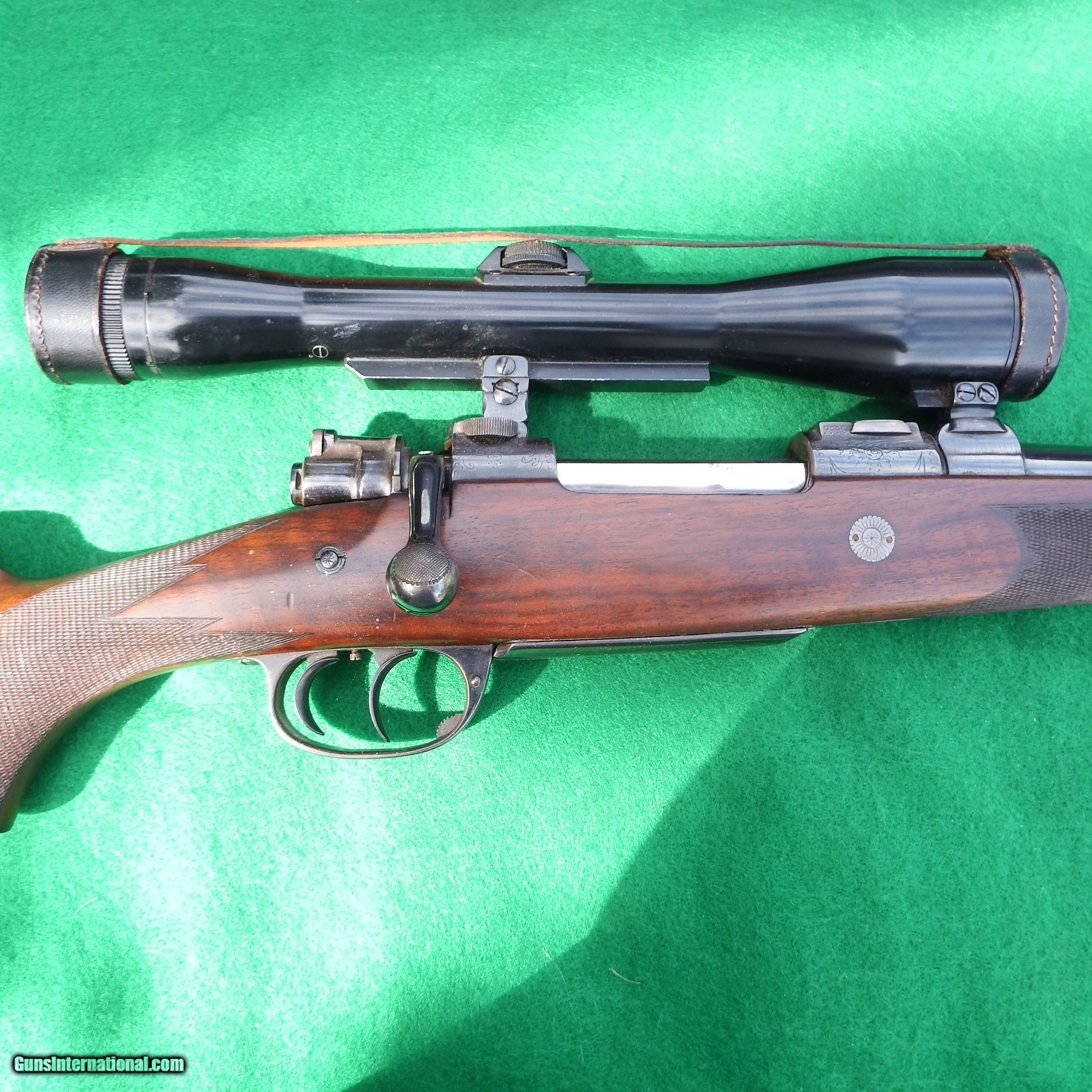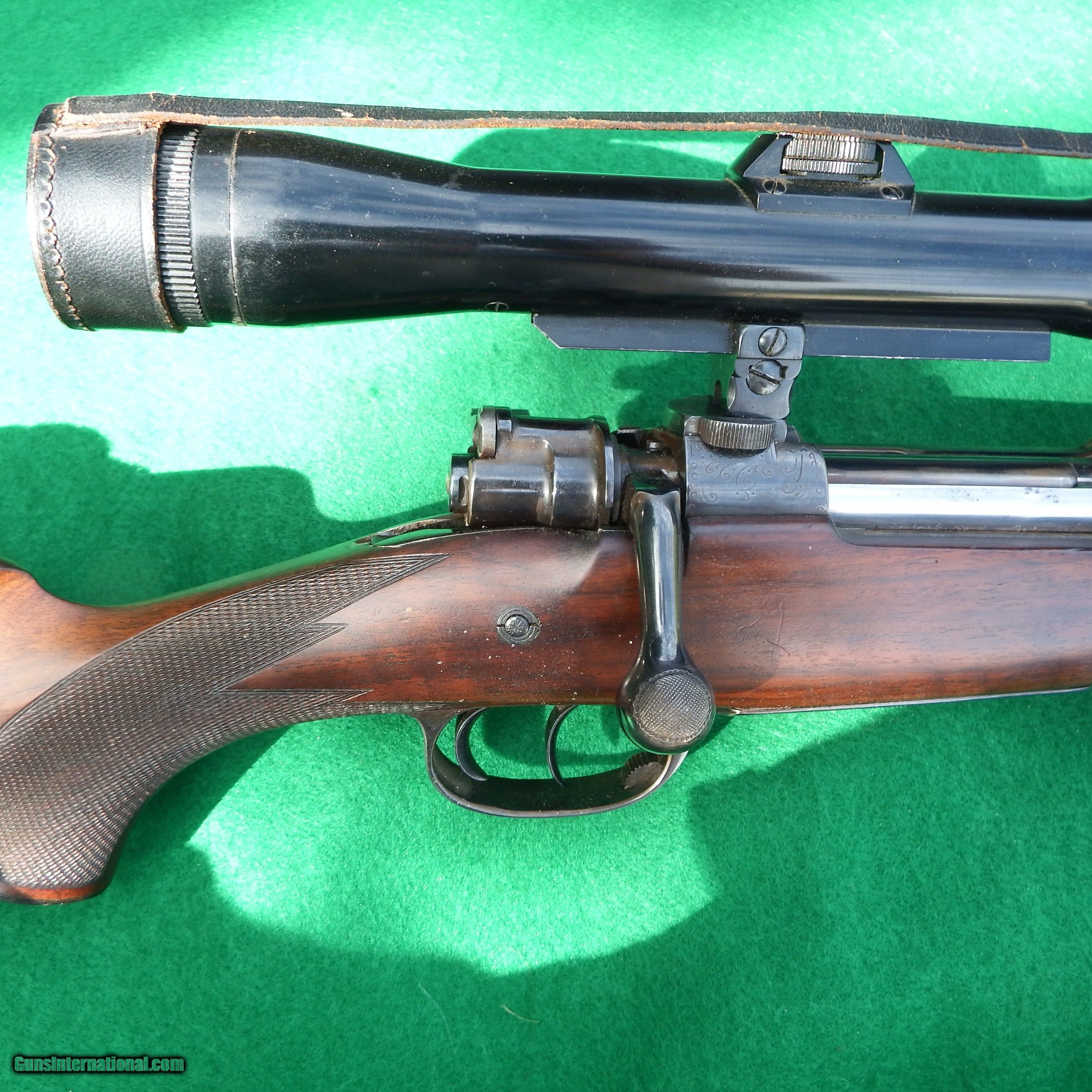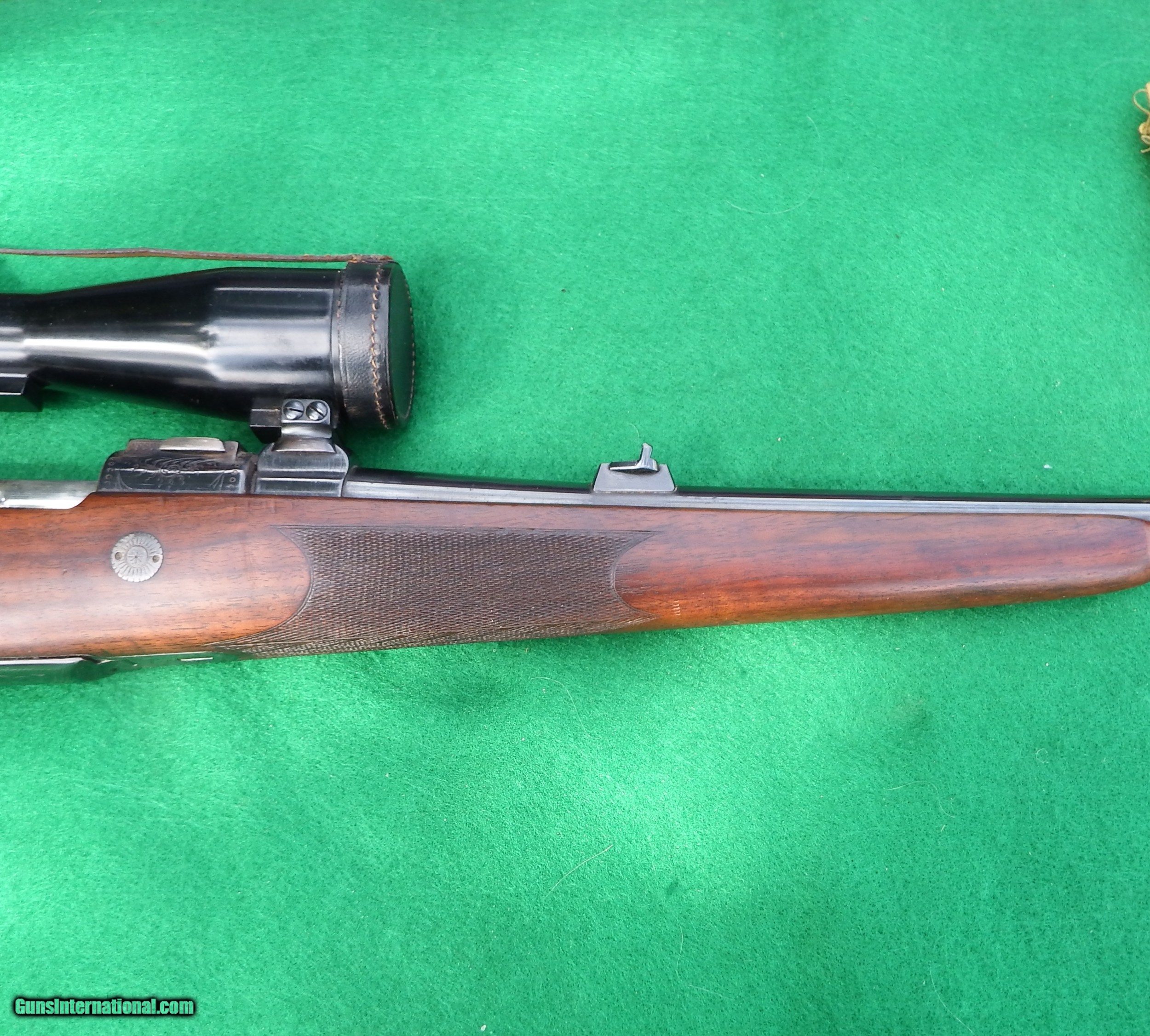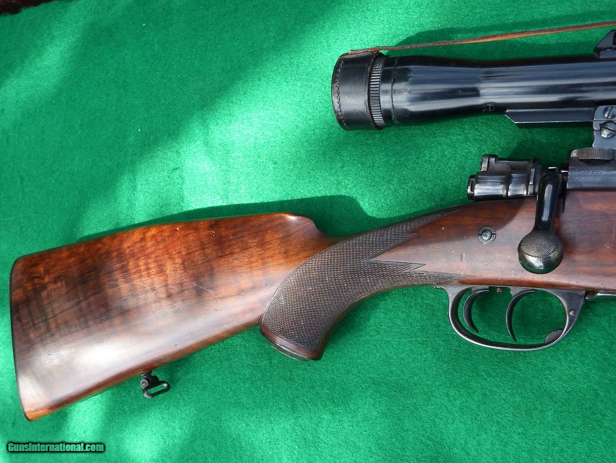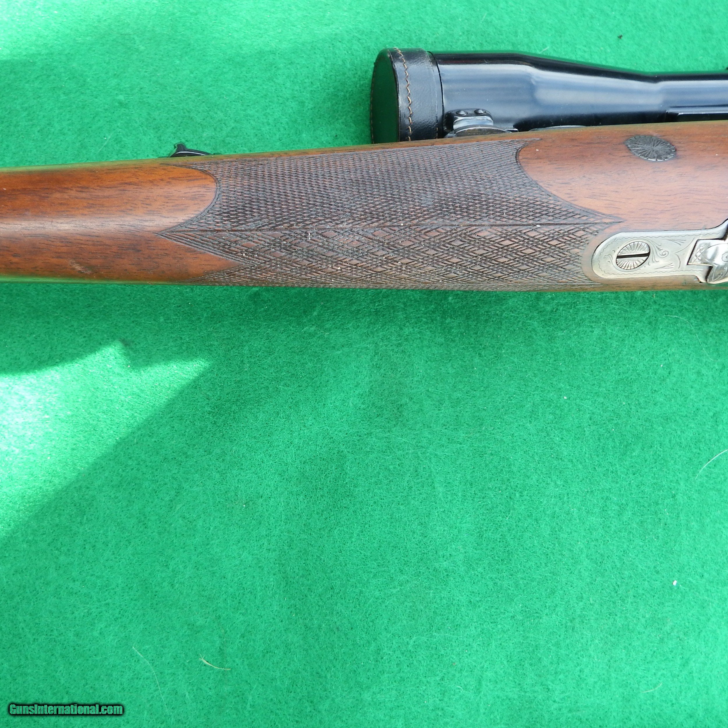 Description: SOLD - BUT I HAVE SEVERAL MORE VINTAGE GERMAN MADE SPORTERS AVAILABLE -----This one of rare finds of the prewar legendary hyper-vel square bridge Mauser rifles. It has it all. Exra fancy checkering - set triggers - Greener safety – Finest of Ernst Leitz Wetzlar ( of Leica fame) claw mt optics - Genuine horn grip cap and butt plate. Sling & strap swivels – classic German scroll engraving – mint bore - perfect optics. Rochlng – Sundrstahl R 7 L – finest German gun steel. Action reinforcing lug in stock. The stock has some tiger stripe – unusual for walnut German rifles. This rare piece looks like it has been meticulously cared for the whole time. To my knowledge - it is the only Vom Hofe for sale currently on the entire market place. Performance? - 93 grain near 4000 FPS! That is almost twice the bullet wt at the same velocity as a 50 grian 220 Swift , and it was developed over 80 years ago by German engineering. That is ‘smoking’ performance by even modern standards. Good news – is that Ammo is still available through RWS. The pictures tell the story. OWN a GERMAN LEGEND . Offer a 3 day inspection guarantee. Please phone for any questions. Joe 813-2430588 Tampa SOLD Curio/Relic: Yes |
