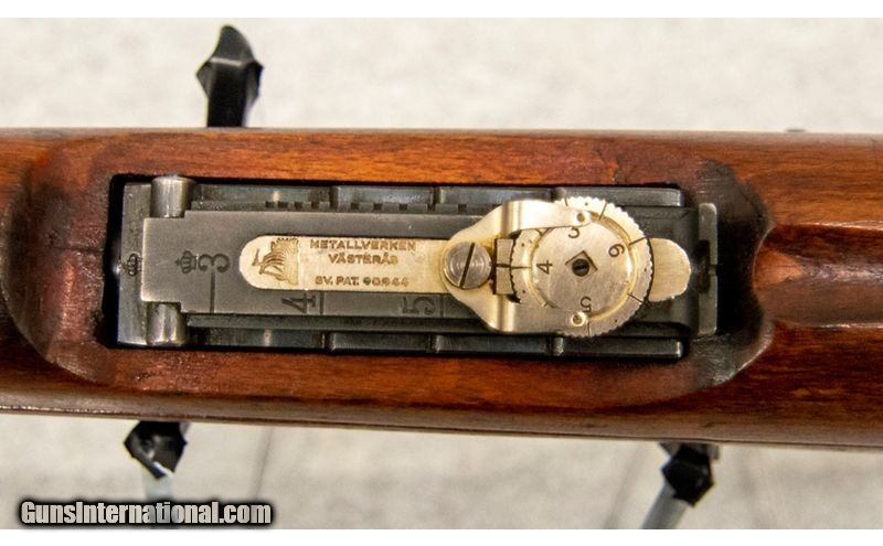Description: Carl Gustafs Model 38 Short Rifle, chambered in 6.5 MM Swedish, with a 5 round internal magazine. A fine example of Swedish craftsmanship, this Model 38 short rifle, made in 1915, has several interesting features. The horizontal bolt indicates infantry use. The brass marking disc shows bore size and condition. The rotary disc was an alternative for the usual slide elevation adjustment mechanism commonly found at the time, and it was made by the Metallverken firm as can be clearly seen. Almost all the serial numbers appear to match along with the proof marks on various pieces of the rifle. Lastly the rifle was made by the Carl Gustaf City Rifle Factory as indicated by the words Carl Gustafs Stads Gevarsfaktori and the crowned seal can be easily seen above that. 6.5 SWEDE SOLD Chambers: 6.5 MM Metal Condition: Very Good Wood Condition: Very Good Bore Condition: Very Good Barrels: 23.60' Stock Dimensions: 14' Butt Pad: Metal Sights: "Iron, Rotary Disc Item Location: Fort Mill, SC |