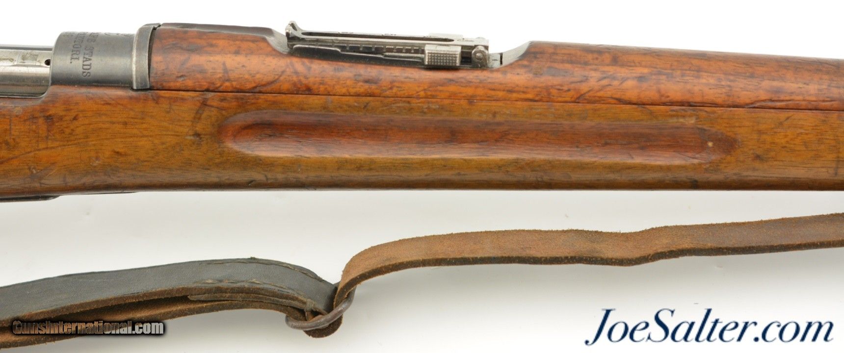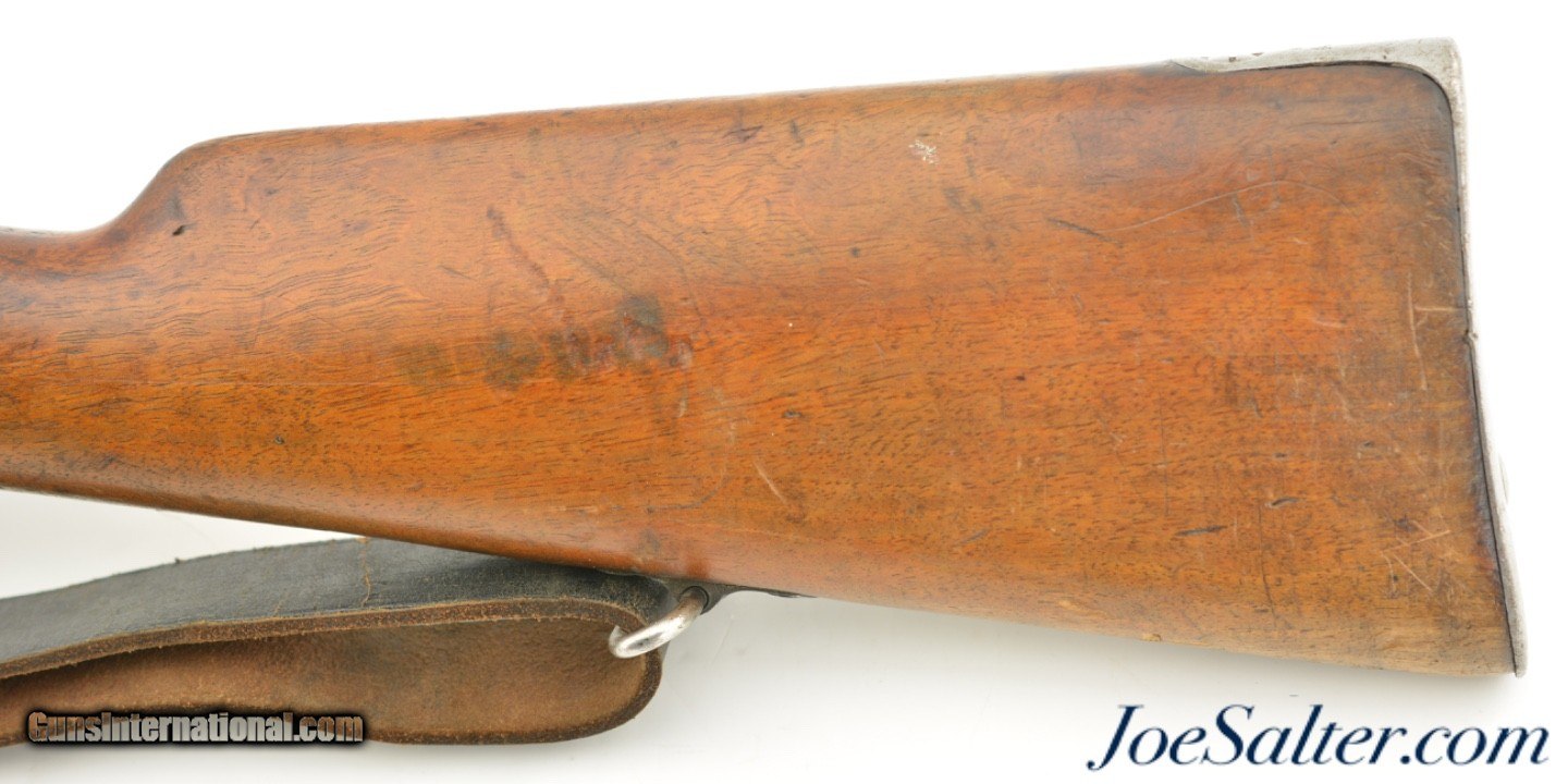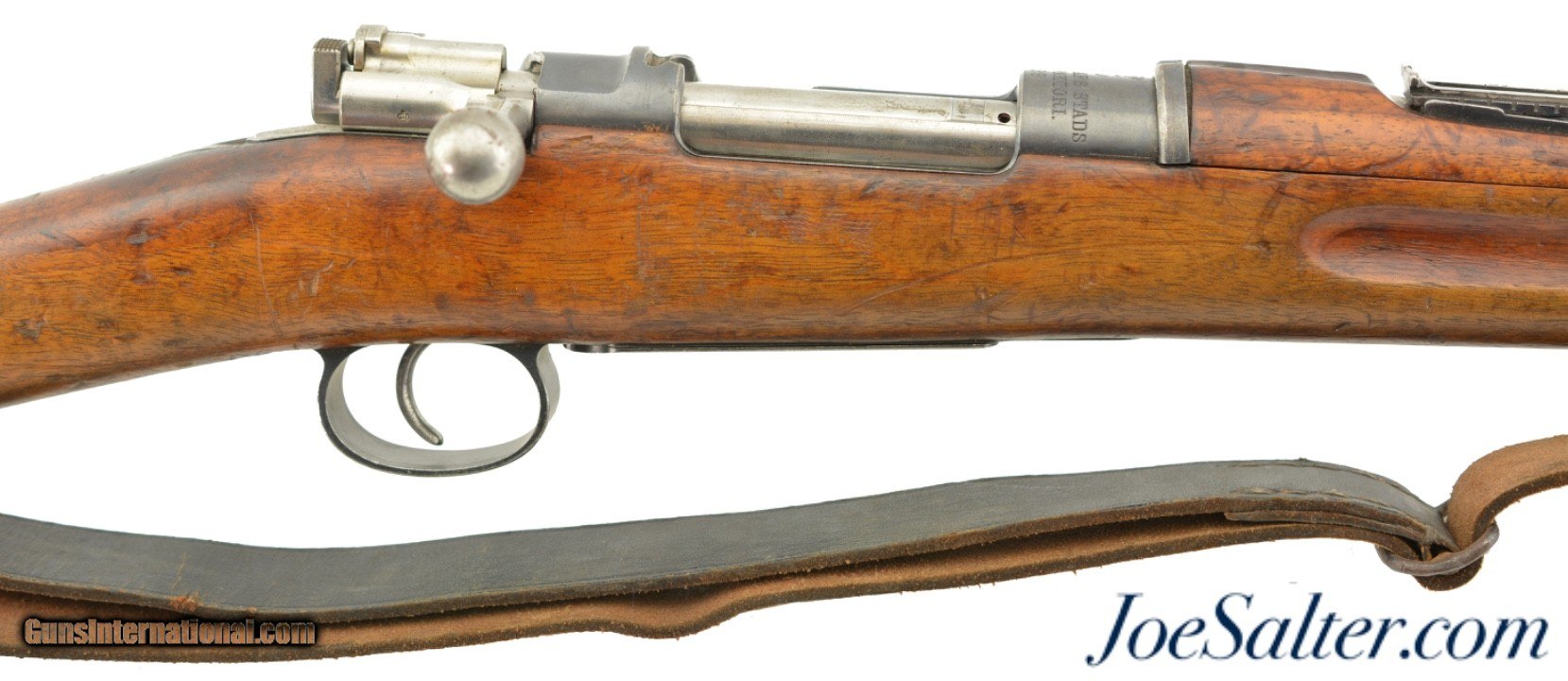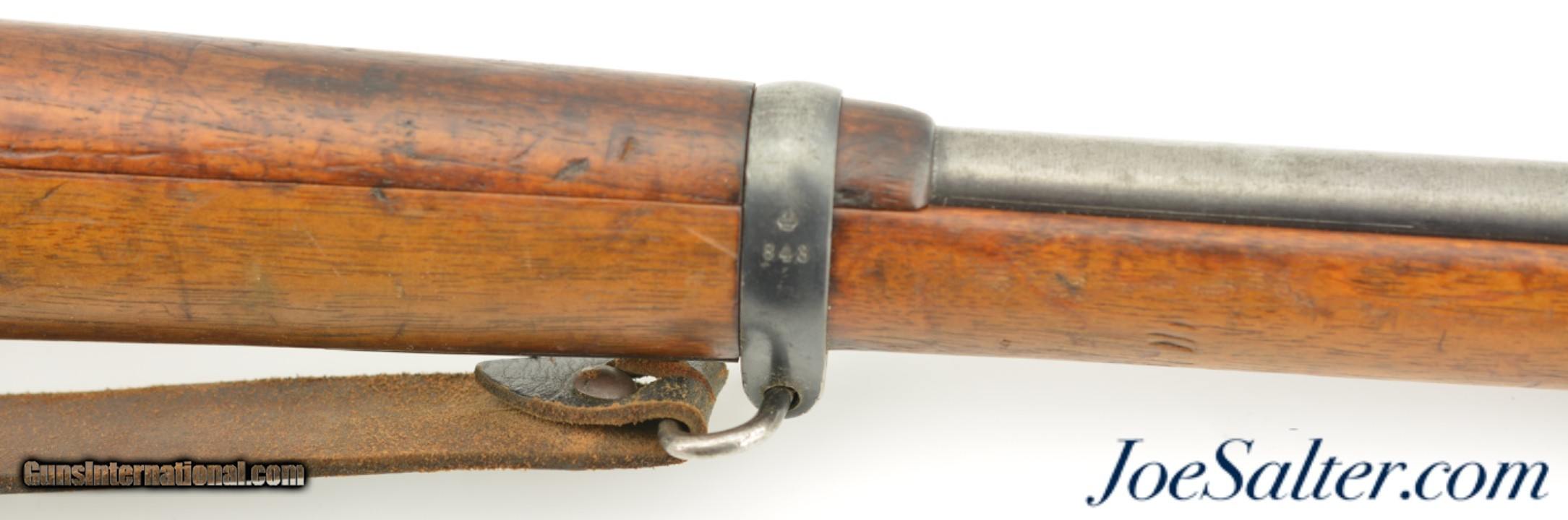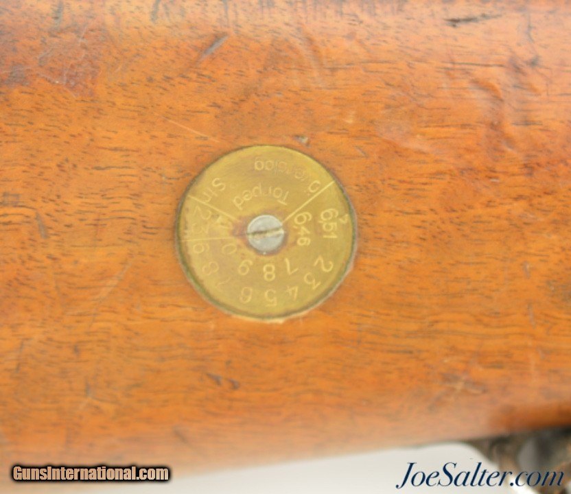 Description: Serial #7843, 6.5 x 55mm, 29" barrel with a fine, bright bore that has some mild freckling within the grooves. This is an 1899-dated rifle that has 75-80% of the original blue remaining, and a pewter gray patina on the balance, along with some scattered spots of plum-brown freckling. The bolt is numbered to a different gun and has some areas of mild pitting on the handle, and plum-brown freckling on a few spots along the otherwise arsenal bright body. An import stamp is present on the right side of the barrel. The stock and handguard are in very good shape, with numerous minor handling marks and blemishes scattered about the added military oil finish. The stock disk lists a nominal bore diameter of 6.51mm, and grade 2 classification. The rifle has an original leather sling installed, that is moderately flaked and worn, but still fully serviceable. The rifle also comes with an unmarked cleaning rod and a removable blank firing adapter. This is a good looking Swedish Mauser, and is in very good-near fine condition. FFL or C&R; Curio/Relic: Yes Price: $695.00 Contact Seller |