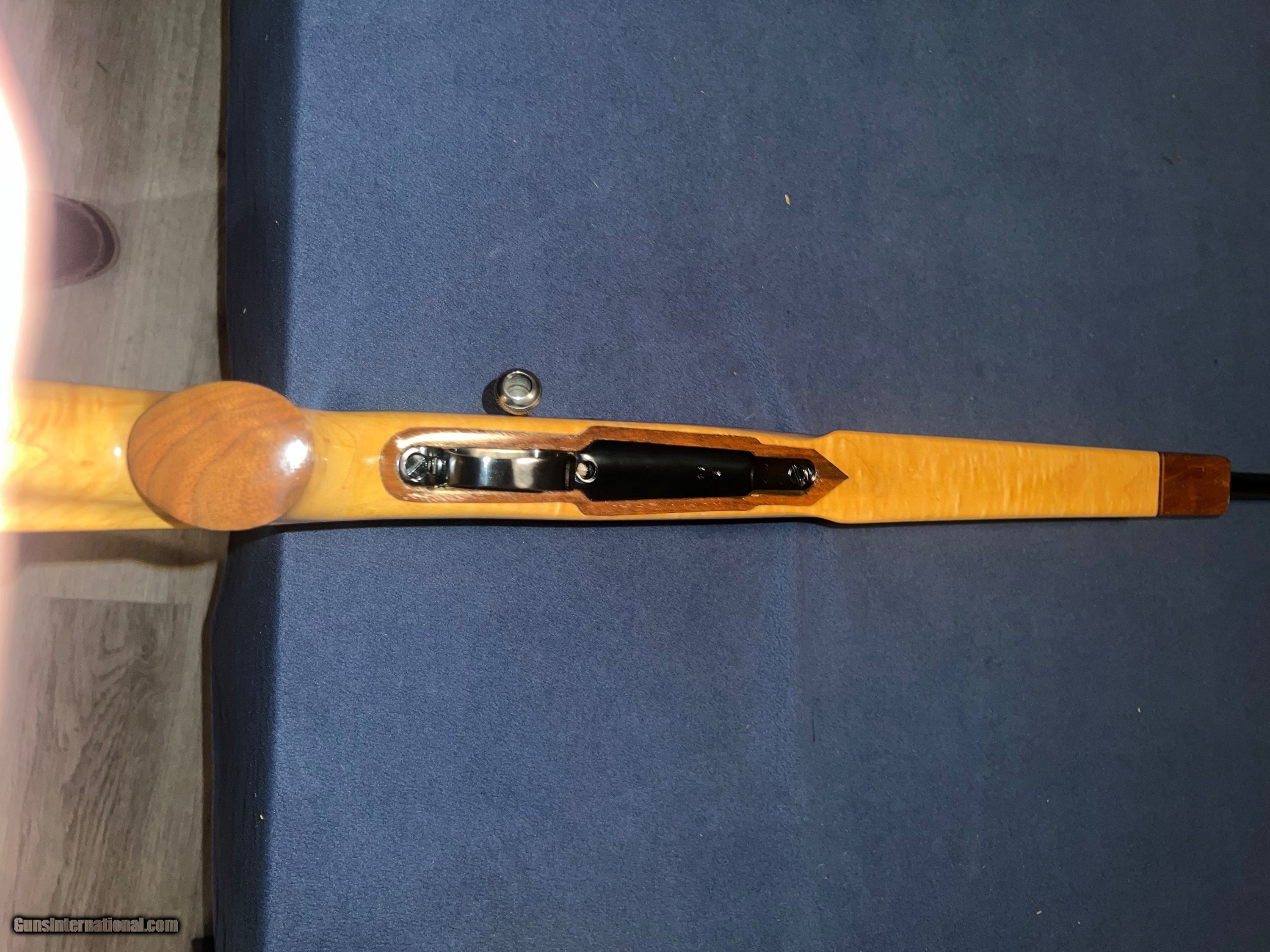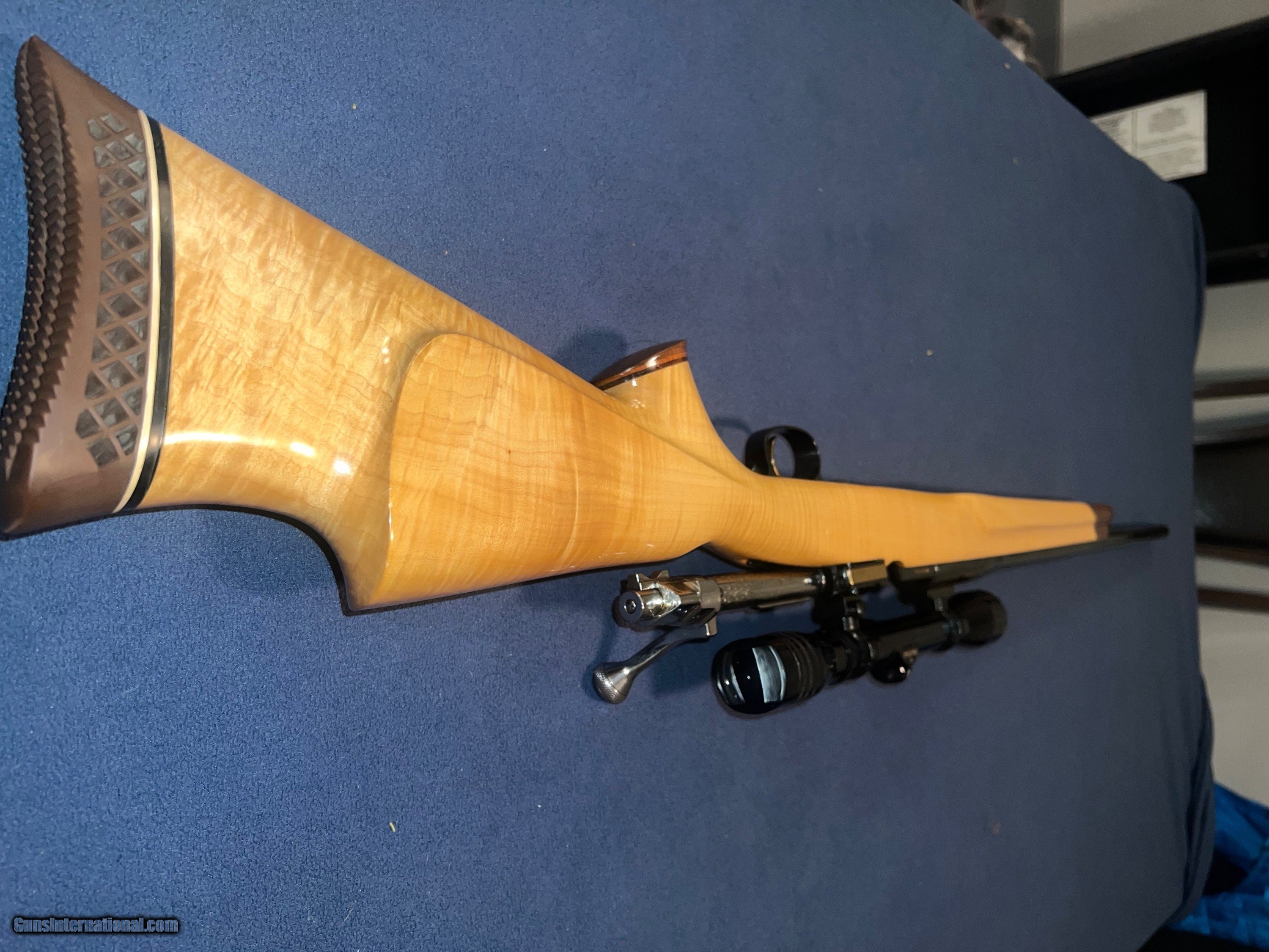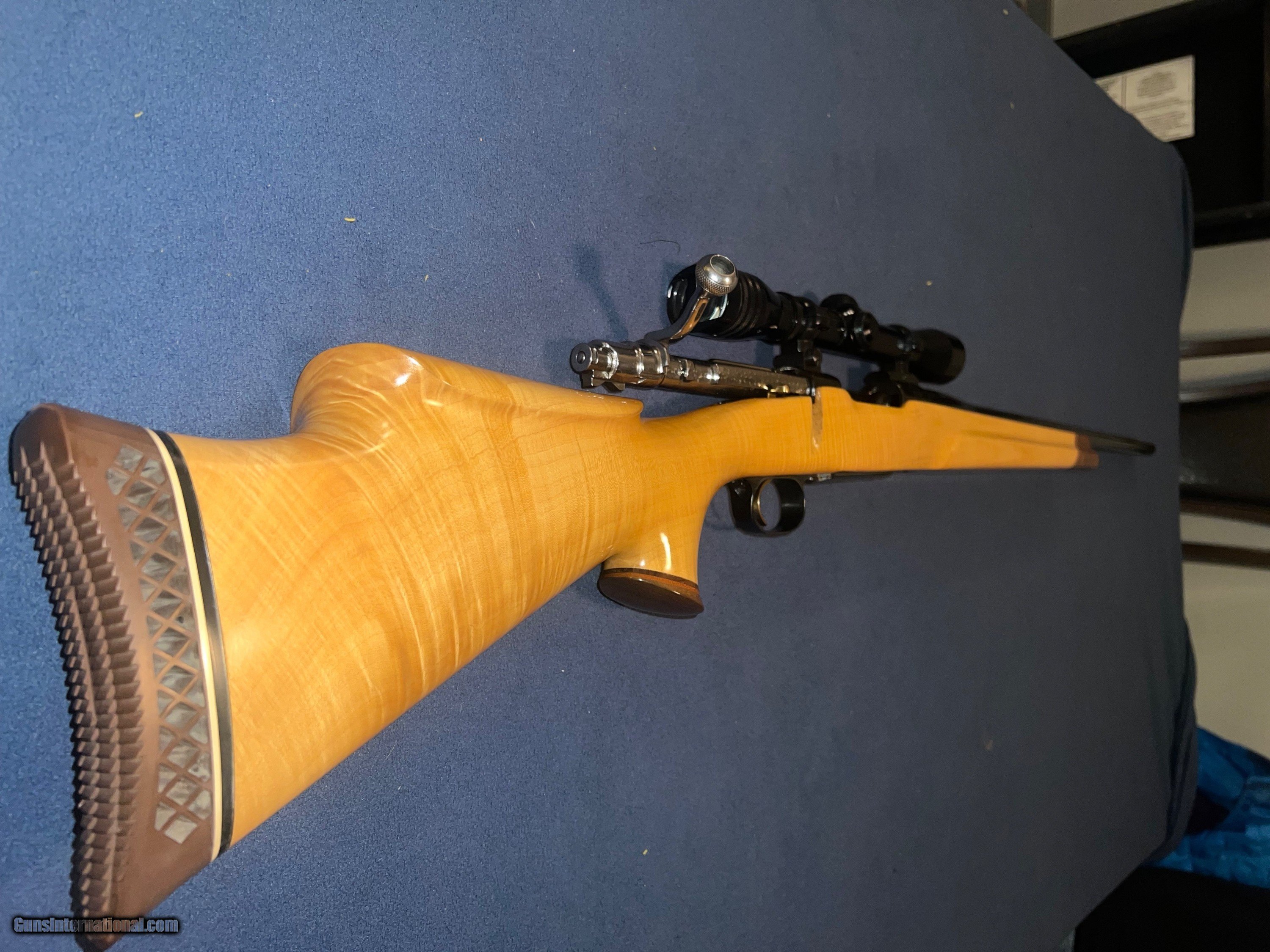 Description: Rare custom .458 win mag with Mauser action, custom safety, and bolt. Its beautiful rifle is built from Maple stock Monte Carlo style with oversize pistol grip. A floating bull barrel into a custom Mauser action. The bolt lever was dropped along with safety relocation for optic mount. 27in barrel 13.75 in pull SOLD Rifle Caliber: .458 Winchester Magnum Bore: .458 Chambers: 1 Condition: Mint Metal Condition: Mint Wood Condition: Great Bore Condition: Mint Barrels: 1 Action: Bolt Stock Heel: Oversized pistol grip Stock Cast: Monte carlo |