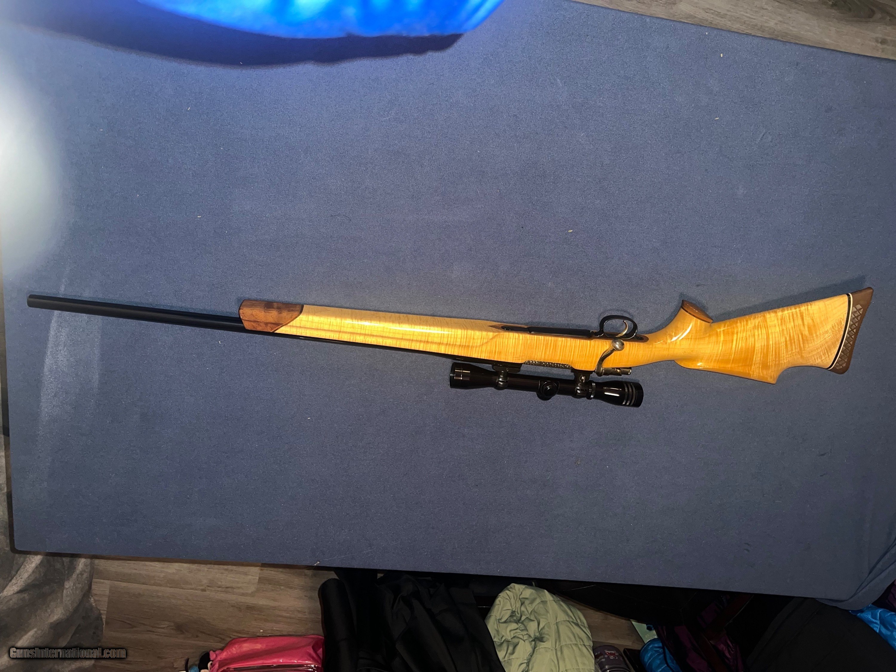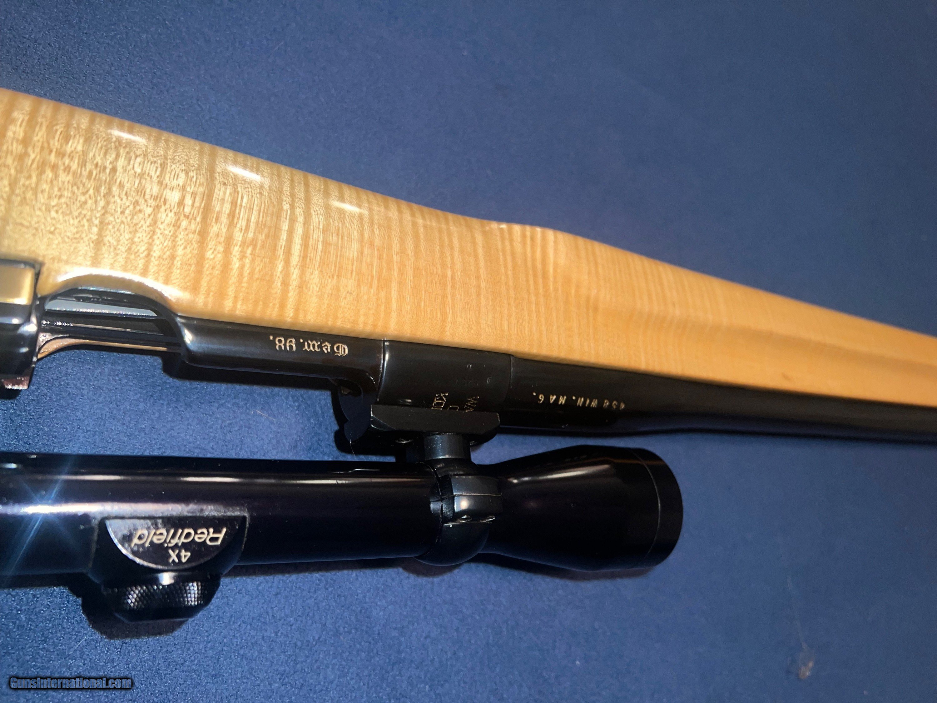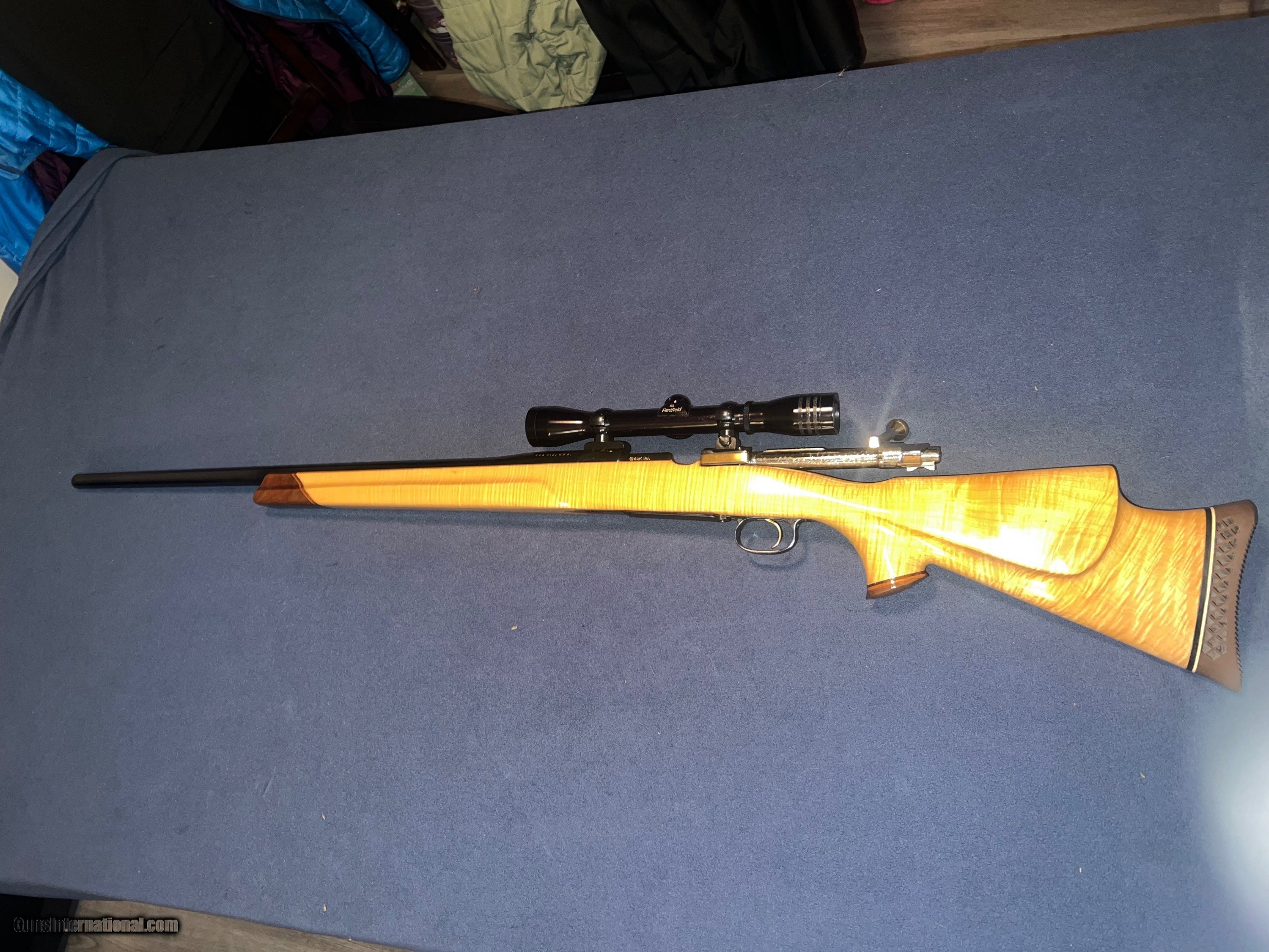 Description: Rare custom .458 win mag with Mauser action, custom safety, and bolt. Its beautiful rifle is built from Maple stock Monte Carlo style with oversize pistol grip. A floating bull barrel into a custom Mauser action. The bolt lever was dropped along with safety relocation for optic mount. 27in barrel 13.75 in pull SOLD Rifle Caliber: .458 Winchester Magnum Bore: .458 Chambers: 1 Condition: Mint Metal Condition: Mint Wood Condition: Great Bore Condition: Mint Barrels: 1 Action: Bolt Stock Heel: Oversized pistol grip Stock Cast: Monte carlo |
