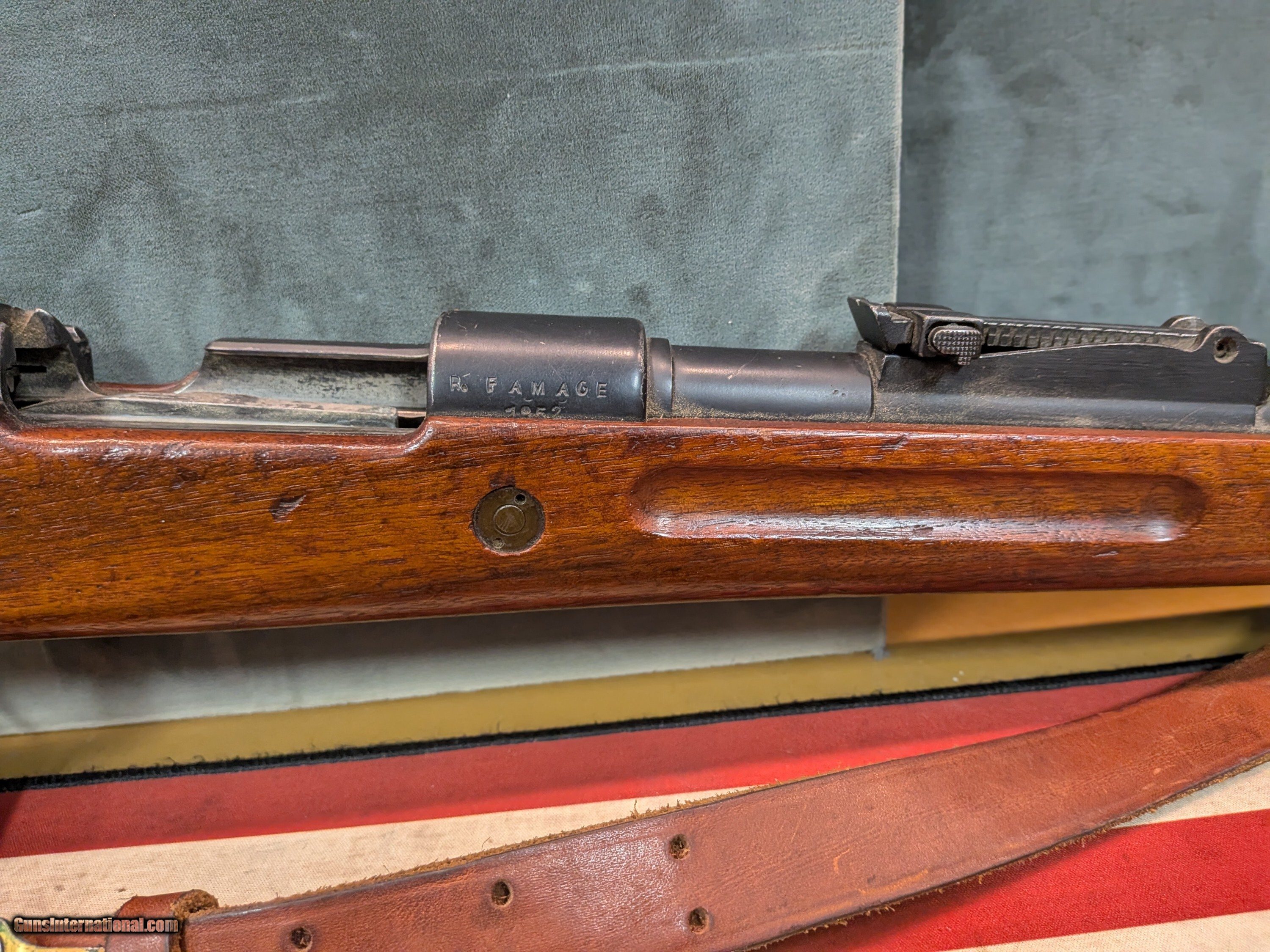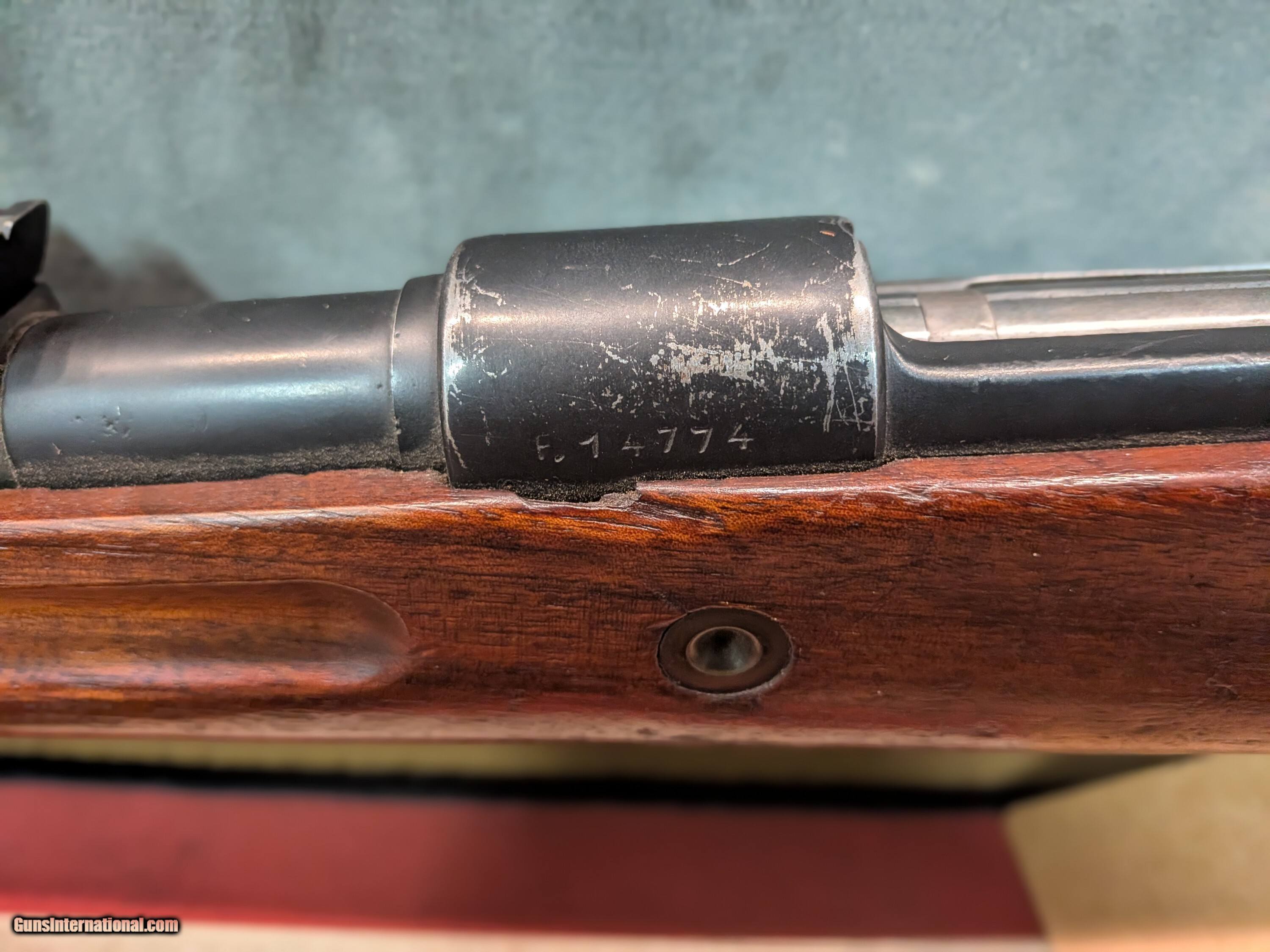 Description: Brazilian Mauser 1908-pattern bolt-action rifle chambered in .30-06 Springfield. Stock retains the correct military profile with steel buttplate, proper sling hardware, and original barrel/stock relationship. Receiver is marked R. FAMAGE, with matching Brazilian military characteristics. Bolt-action operates smoothly, bore shows strong rifling, and all major components appear correct for this pattern. Finish shows honest wear consistent with age and service. Wood is solid with no structural cracks or repairs. An excellent example of a South American military Mauser, suitable for collectors, historical shooters, or display. Chambering: .30-06 Springfield Action: Bolt-Action Stock: Good no cracks normal wear for age Overall Condition: Good Rifle Caliber: .30-06 Springfield Condition: Good Metal Condition: Good Wood Condition: Good Bore Condition: Good Action: Bolt Price: $735.00 Buy Now Pay with