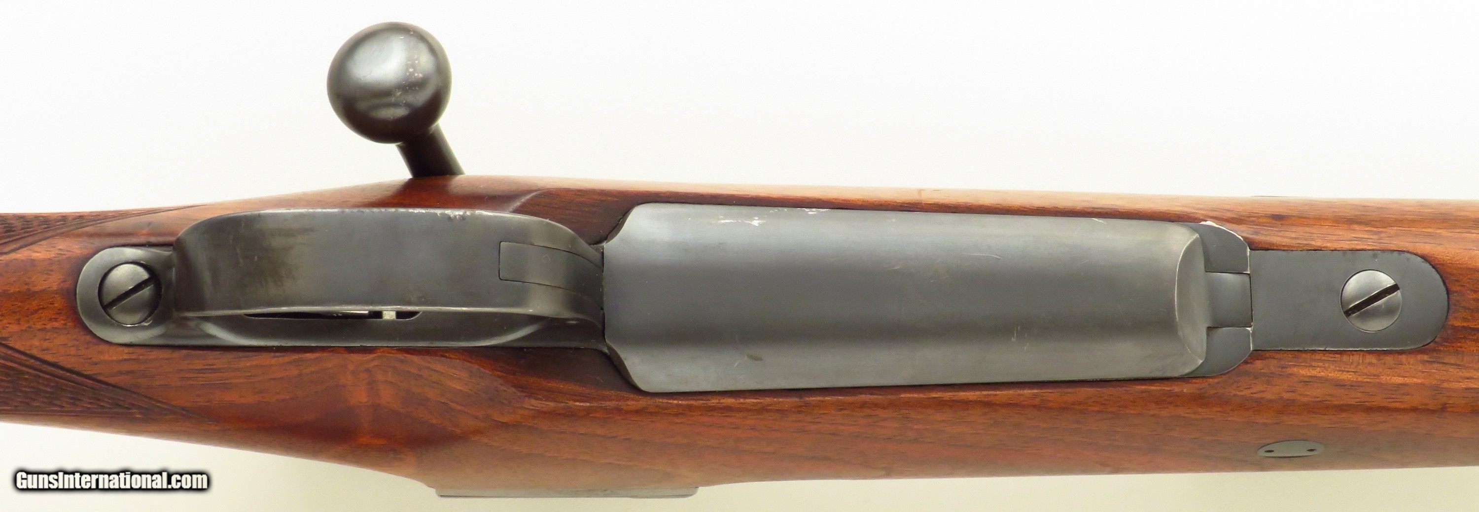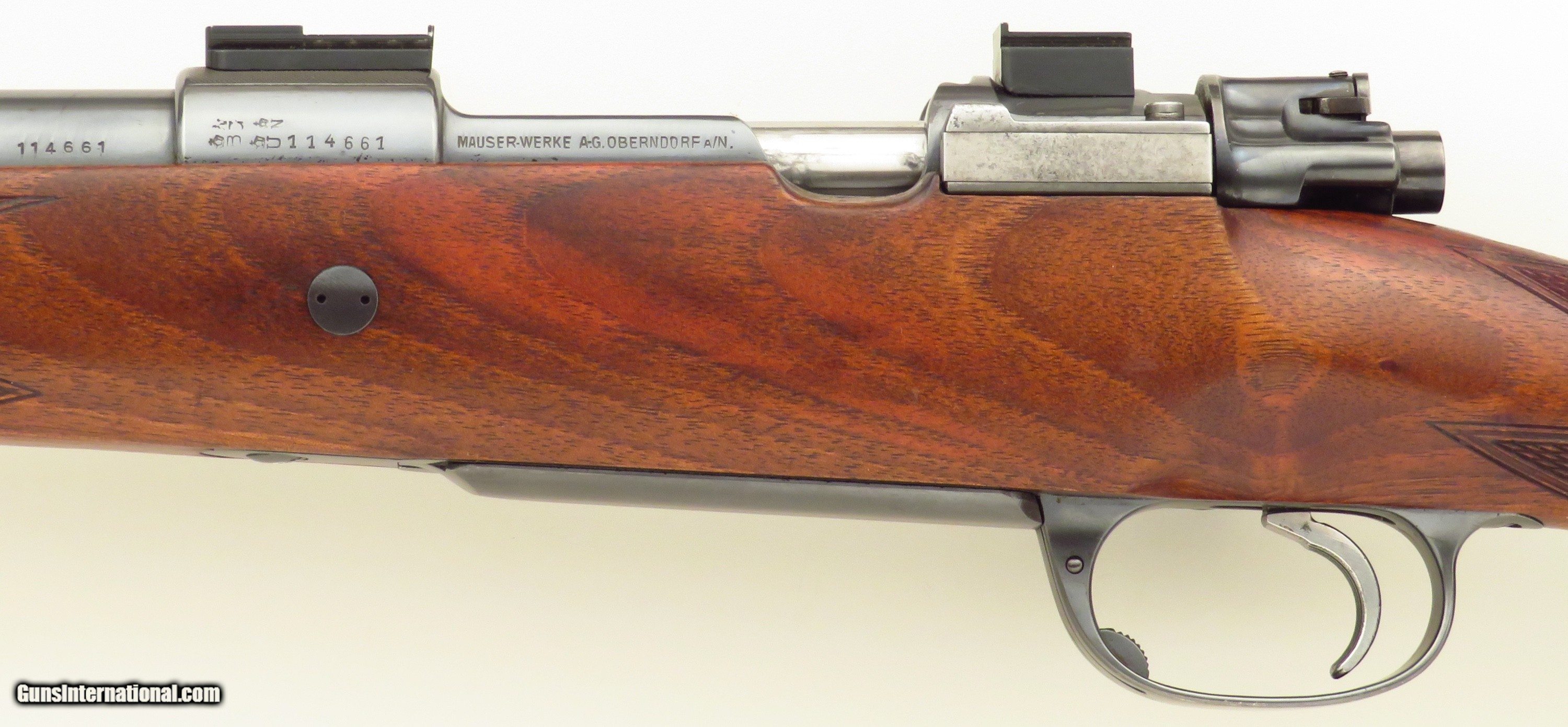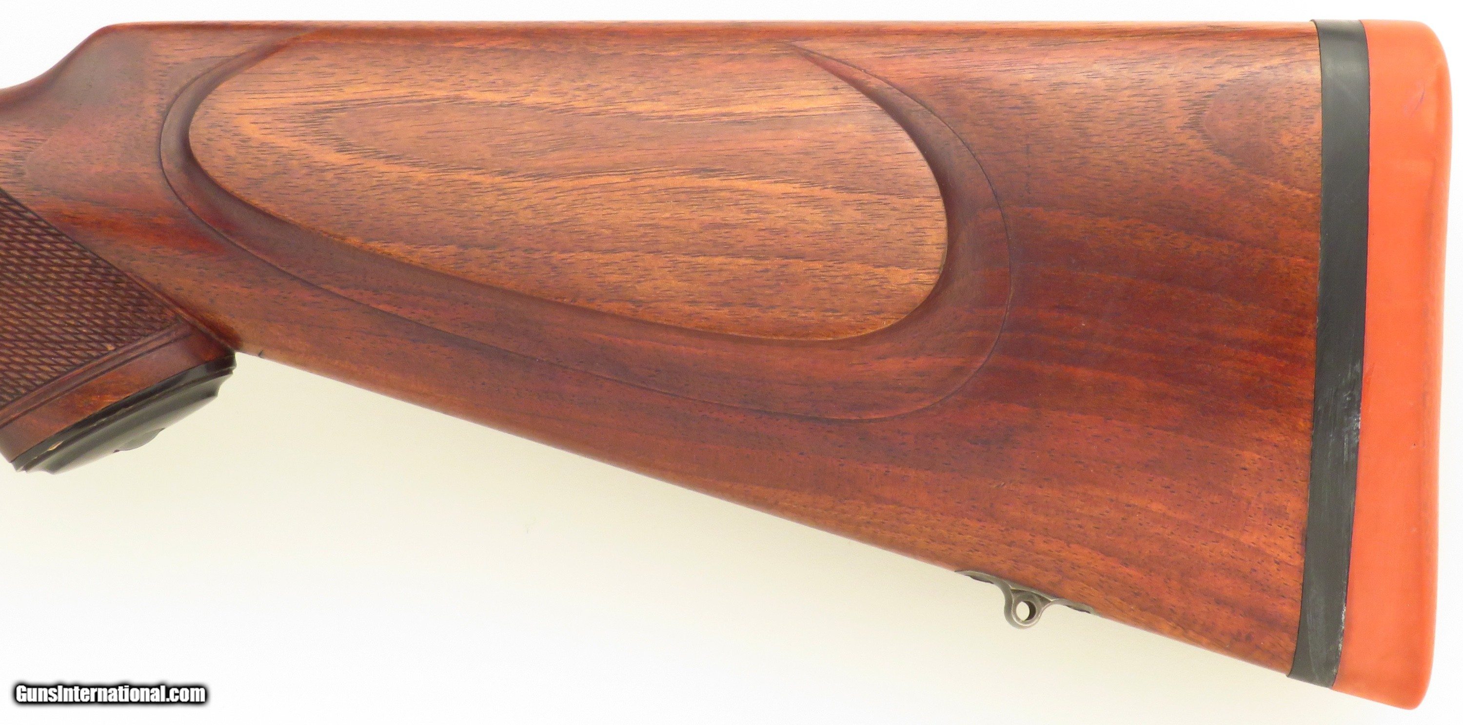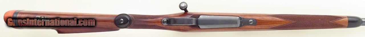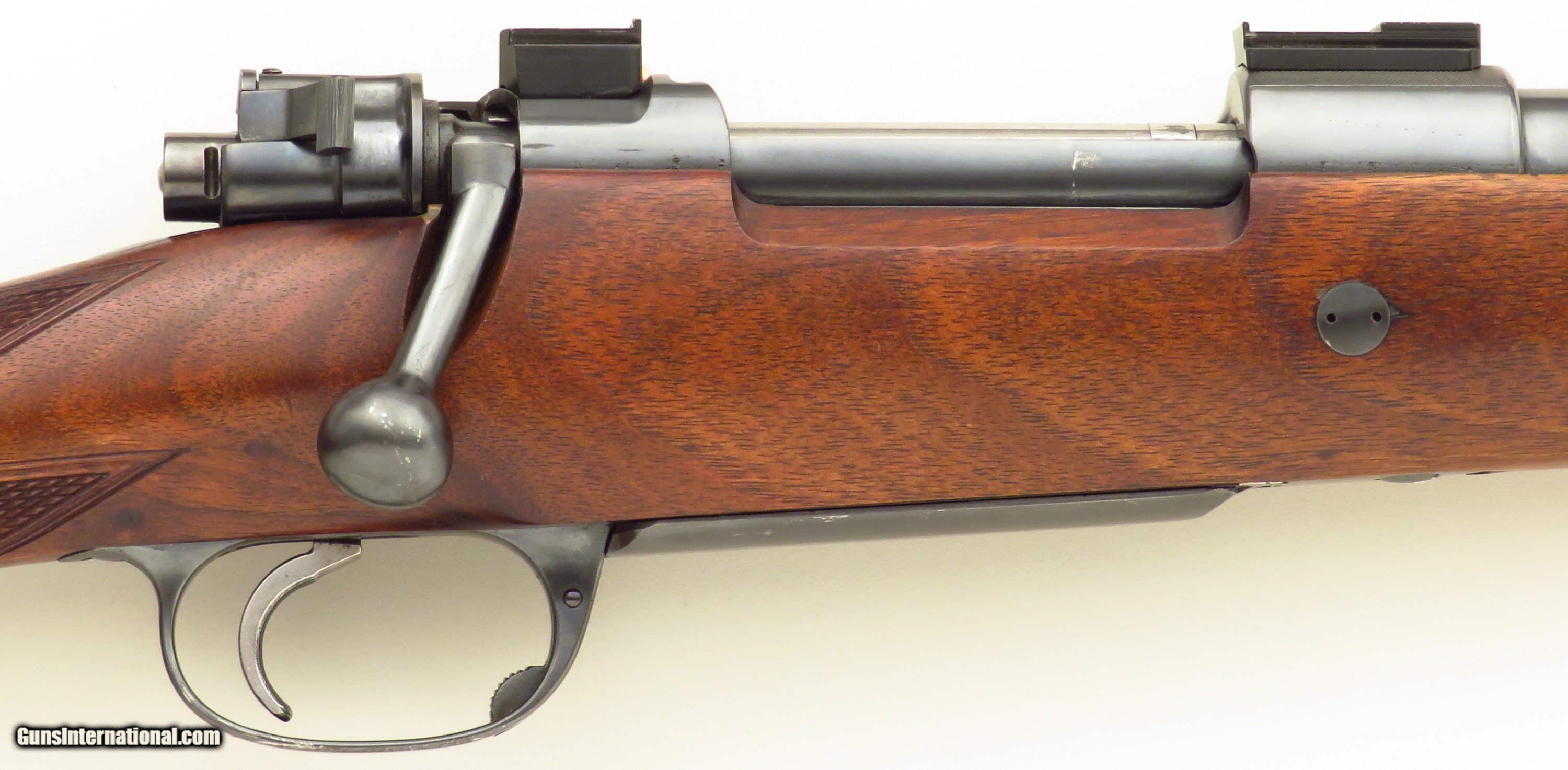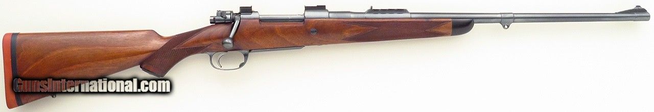 Description: Commercial Mauser Model 98 Sporter .375 H&H Magnum. Serial number 114661 (5x: barrel, action, extractor, bolt release, bottom metal) has a 24-inch tapering sporter barrel (.625-inch muzzle diameter) with a banded front sight (checkered ramp face, beaded blade), banded sling eye and a banded island rear sight assembly (one fixed express blade marked "100" and four folders marked "200/300/400/500", all with sighting lines, drift adjustable). Features include a two-position wing safety, tuned single-stage trigger and Talley bases. The stock is dressed with an ebony forend tip, wrap checkering with a partially Mullered border, crossbolt, scalloped traditional (pancake) cheek rest with wrapping shadow line, inletted sling swivel stud and an NECG Universal recoil pad. CAPACITY: Four rounds (total, loading from the magazine). The extractor properly "snaps over" rounds dropped into the chamber. DIMENSIONS: Weight is 8.6 pounds and length-of-pull is 14.2 inches. Overall action length is 8.75 inches. CONDITION: The bore is bright and shiny with but a trace suggestion of wear. Feeding/extraction/ejection are positive and snappy. Mechanics are solid and trigger pull crisp. As restored, metal finish is approximately 90 percent. Metal shows minor roughness under the finish (mostly on the bands) both at and under the wood line. As refinished and recheckered, wood finish and condition is approximately 90 percent with some minor field impressions and two small chips (at tang and on upper rear of bolt slot border). The price is firm and layaway is available. Trade proposals for fine sporting rifles and handguns are invited. $3,750 plus shipping. SOLD Rifle Caliber: .375 H&H Magnum |